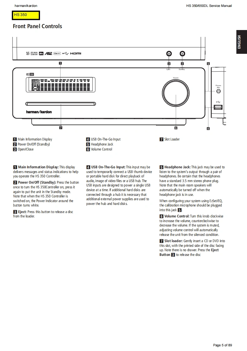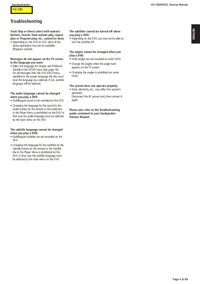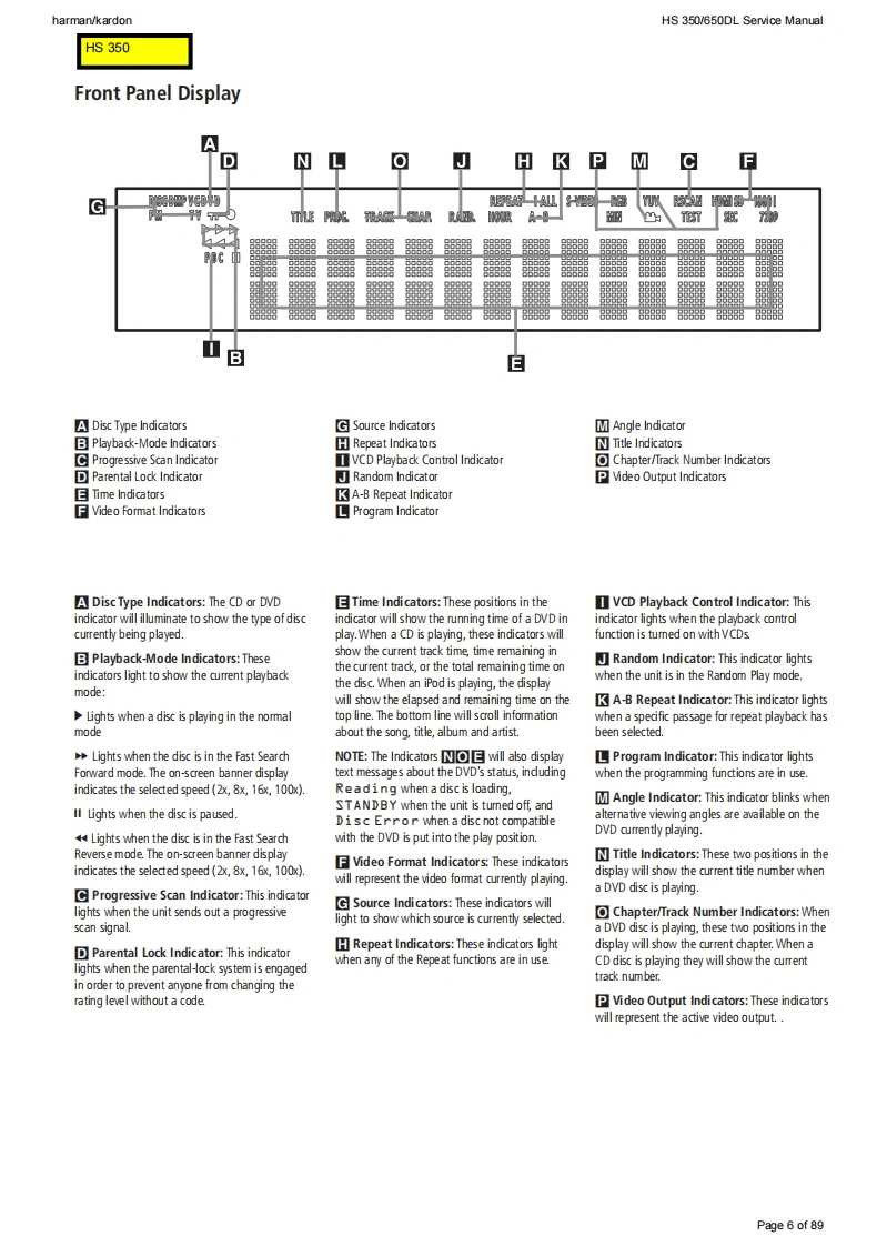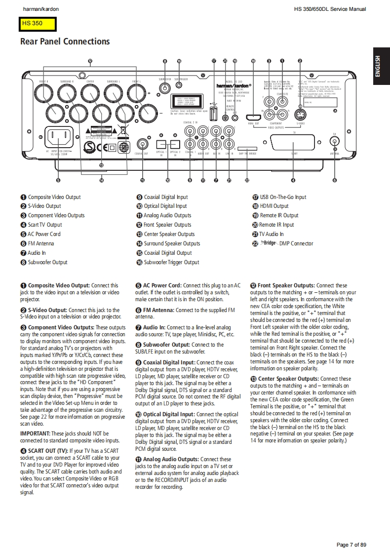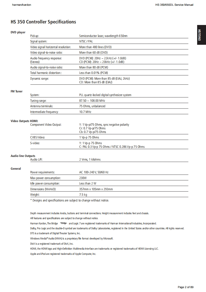 harman/kardonHS 350/650DL Service Manualharman/kardonService ManualHS350/230HS650/230Digital Lounge HS 650/230Integrated Home Theater System controllersS3@”G1Q86:15:54harman/kardonCONTENTSHS 350 TECHNICAL SPECIFICATIONS2HS 350 PACKAGE LIST AND PARTS15HS 350 TROUBLESHOOTING GUIDE3HS 650 PACKAGE LIST AND PARTS16HS 350 FRONT PANEL CONTROLS5EXPLODED VIEW AND PARTS17HS 350 FRONT PANEL DISPLAY6ELECTRICAL PARTS LIST18HS 350 REAR PANEL CONNECTIONS1SEMICONDUCTOR PINOUTS33HS 650 TECHNICAL SPECIFICATIONS9PCB DRAWINGS47HS 650 TROUBLESHOOTING GUIDE10BLOCK DIAGRAM5HS 650 FRONT PANEL CONTROLS12WIRING DIAGRAM60HS 650 FRONT PANEL DISPLAY13REVISION HISTORY61HS 650 REAR PANEL CONNECTIONS14SCHEMATIC DIAGRAMS62-89Released EU2008harman/kardon,Inc.Rev0,10/2008250 Crossways Park Dr.Woodbury,New York,11797Page 1 of 89
