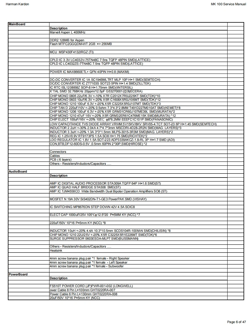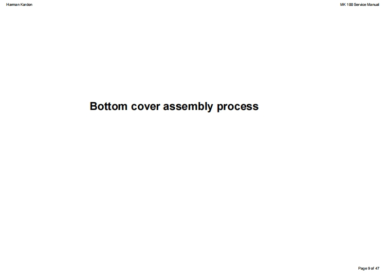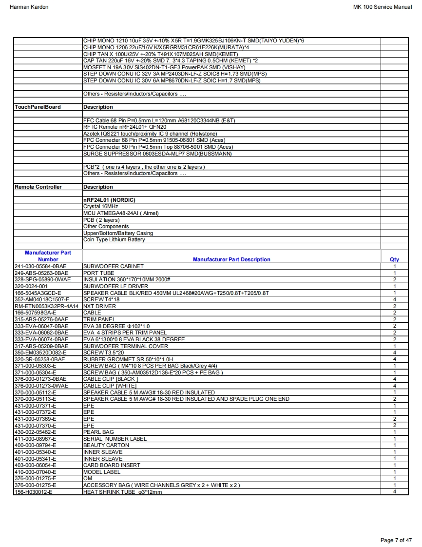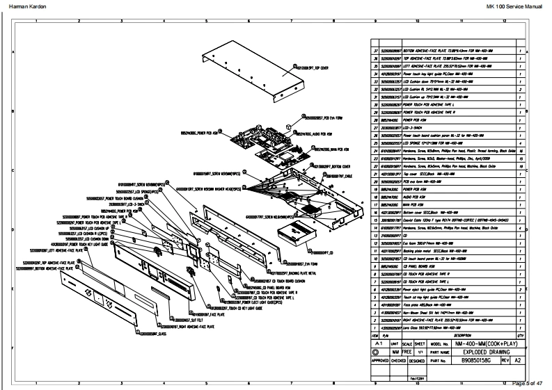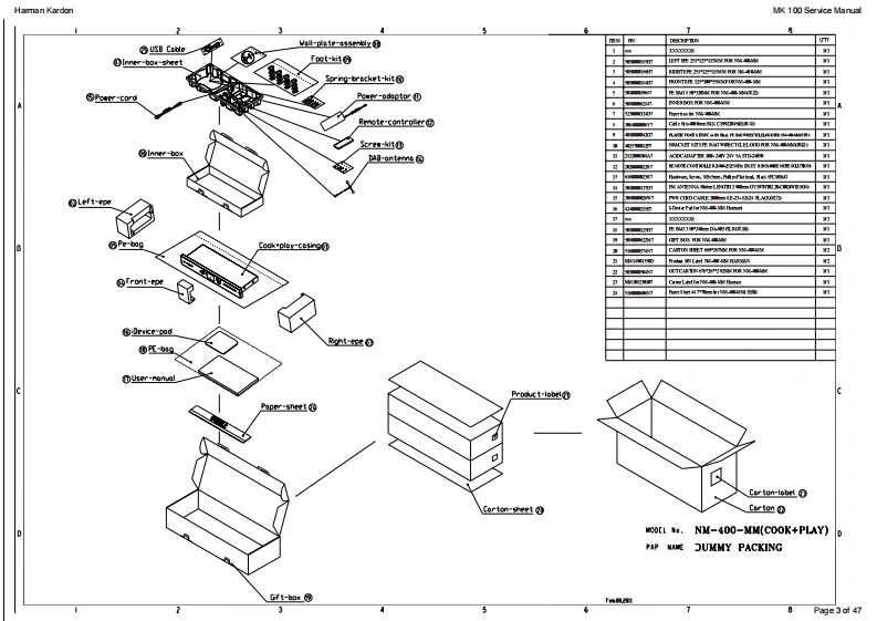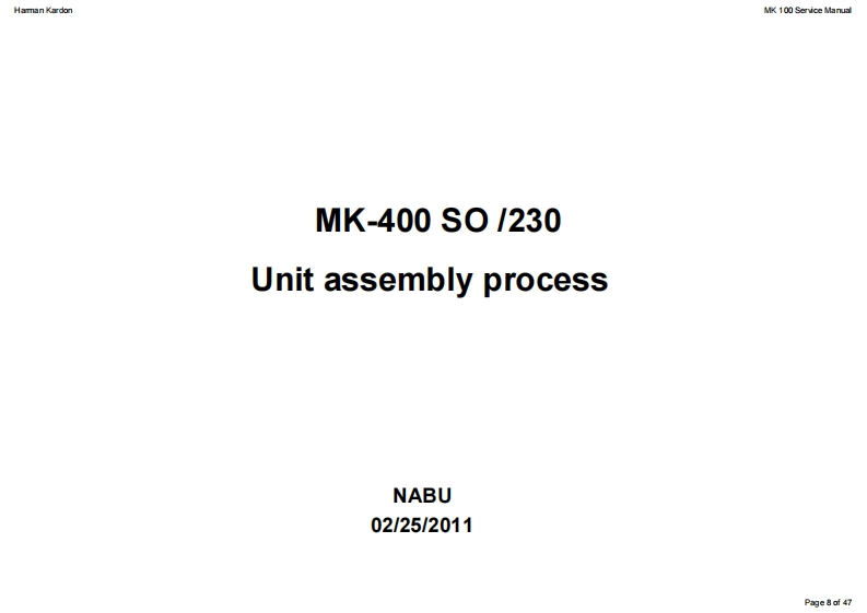 harman/kardonService ManualMAESTROKITCHEN MK100Sound system.harman/kardonCONTENTSPACKING,SPEAKERSPARTS LIST6PACKING,CONTROL UNIT3UNIT ASSEMBLY PROCESSPACKING,SHIPPING4SCHEMATIC DIAGRAMS22EXPLODED VIEW AND PARTSReleased EU2012Harman Consumer Group,Inc.Rev0,3/20128500 Balboa BoulevardNorthridge,California 91329