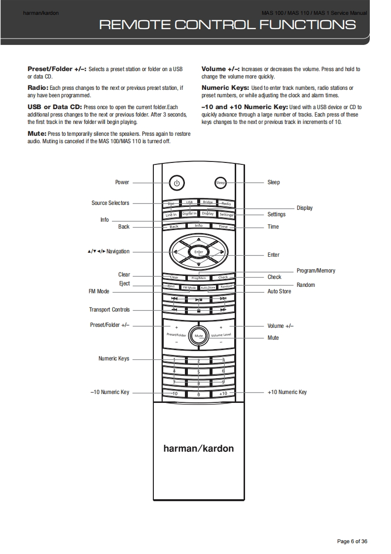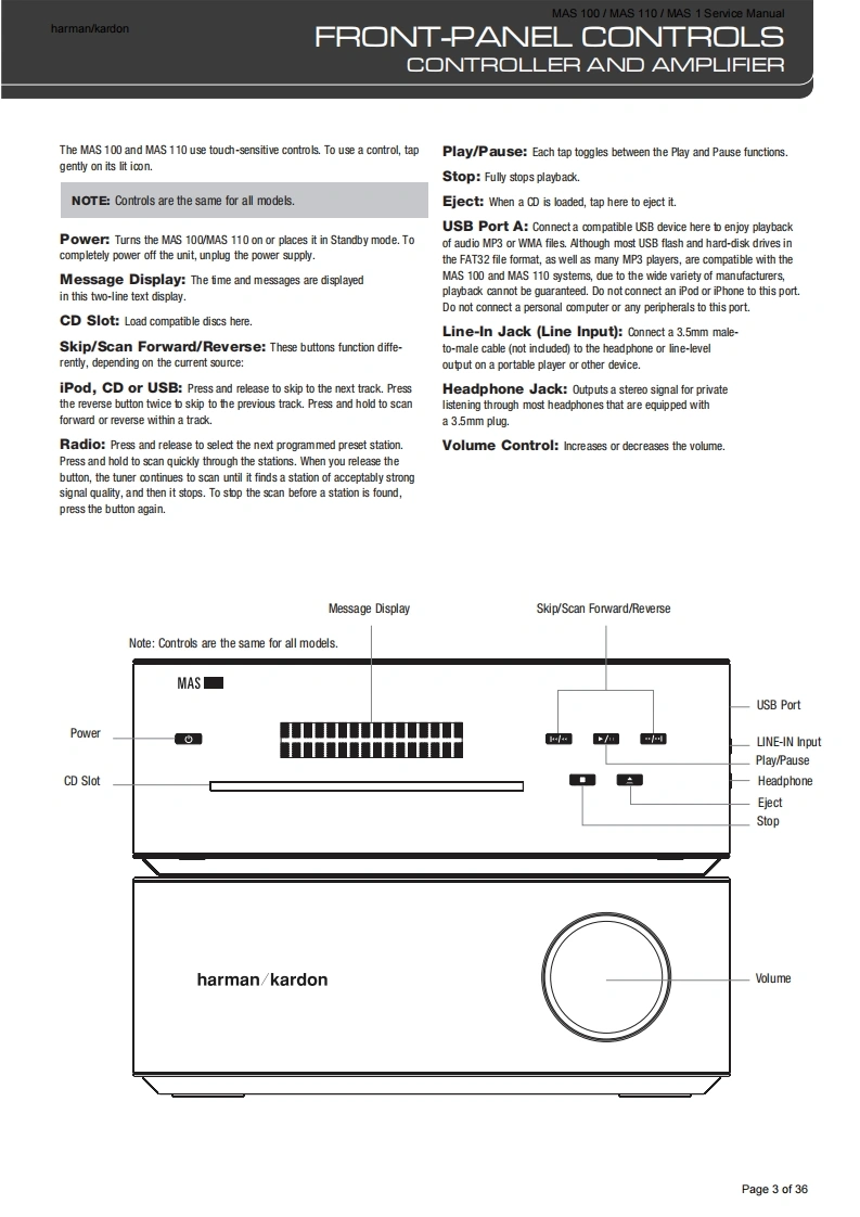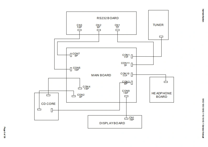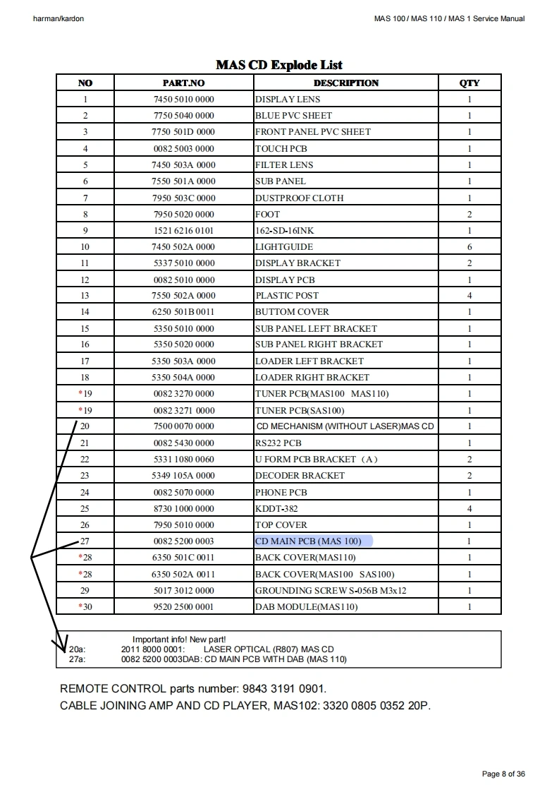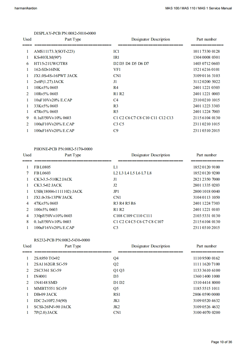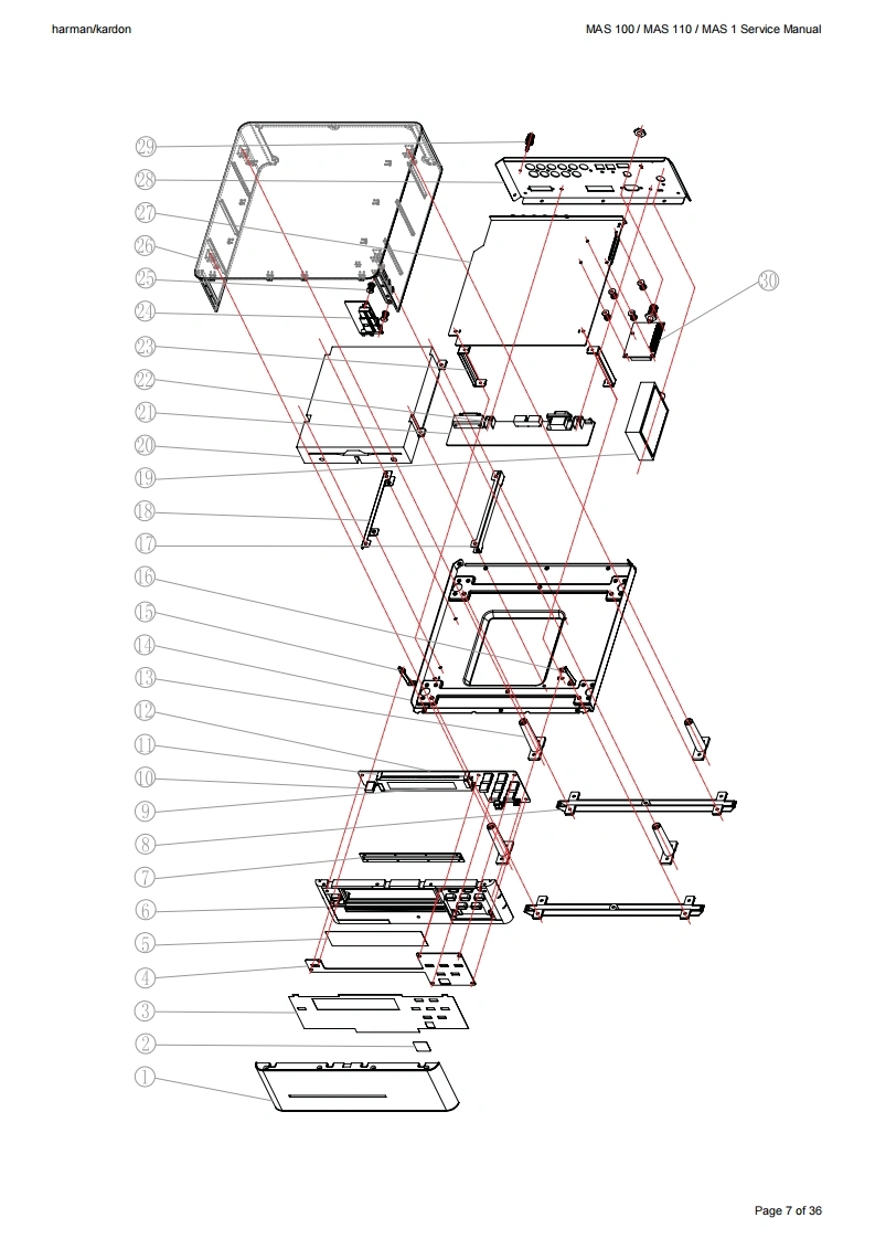 harman/kardonMAS 100/MAS 110/MAS 1 Service Manualharman/kardonService ManualMAS 100MAS 110SAS 100Compact Music SystemService Manual for CD sectionand MAS 1 loudspeakers四CBolune14-36福9harman/kardonCONTENTSBASIC SPECIFICATIONS2PARTS LIST0FRONT PANEL INFORMATIONSEMICONDUCTOR PINOUTS12REAR PANEL INFORMATION4PCB DRAWINGSREMOTE CONTROL INFORMATION5SCHEMATIC DIAGRAMS31EXPLODED VIEW7MAS 1 LOUDSPEAKER,EXPLODED VIEW 35WIRING DIAGRAM9MAS 1 PARTS LIST36Released EU2009Harman InternationalRev4,06/20128500 Balboa BoulevardNorthridge,California 91329Page 1 of 36