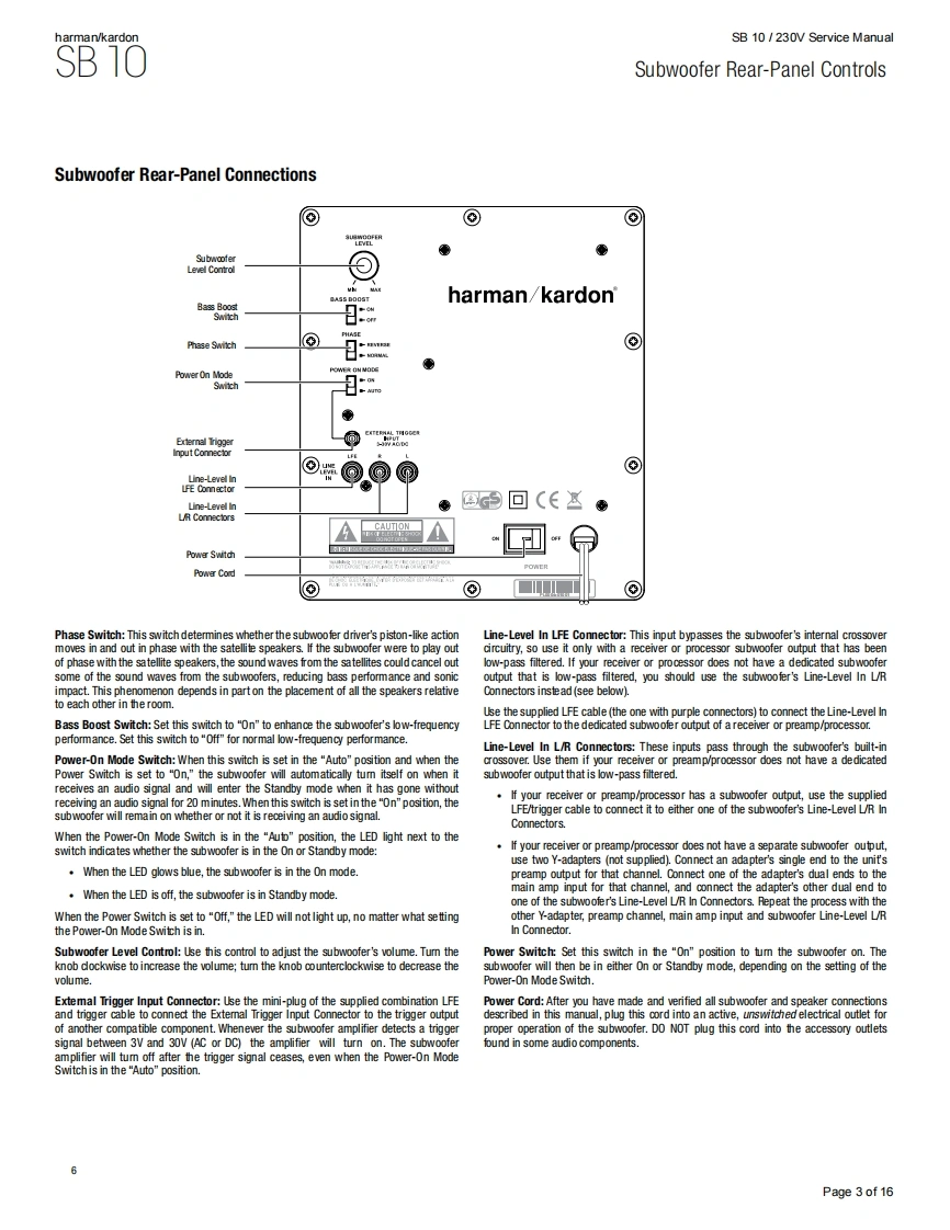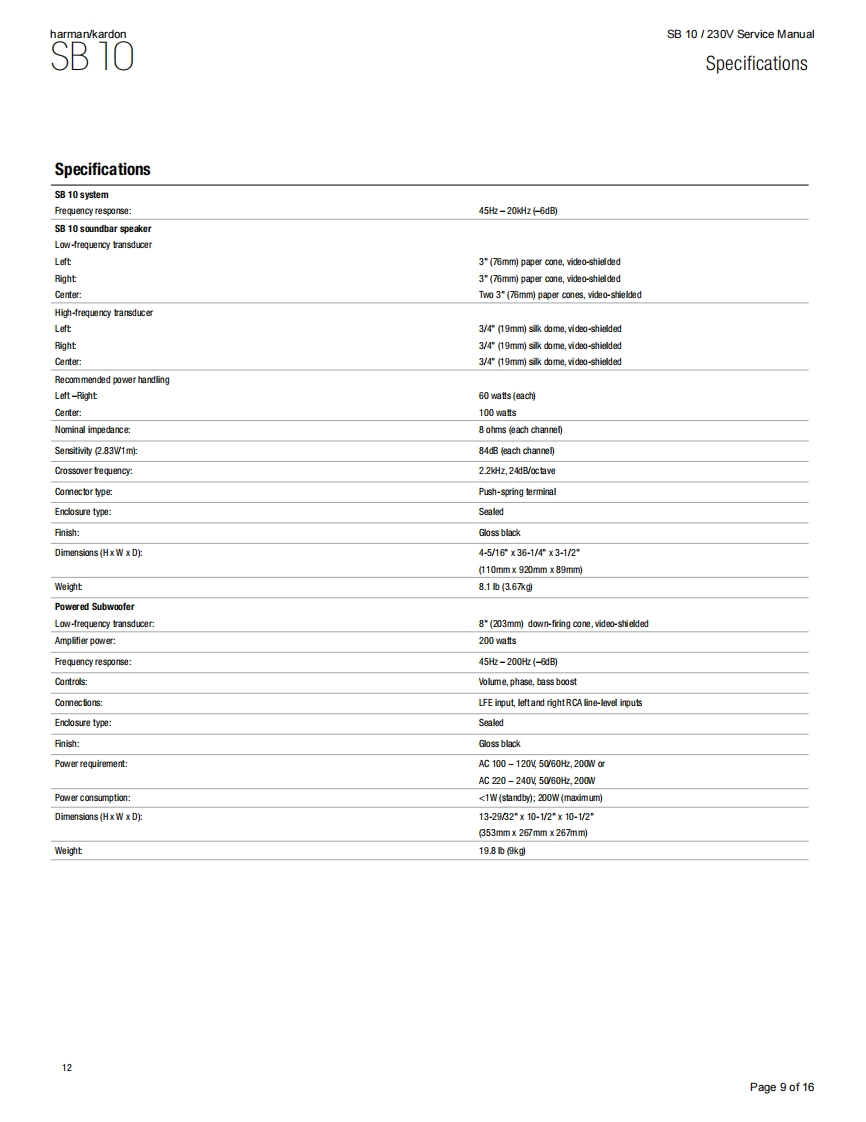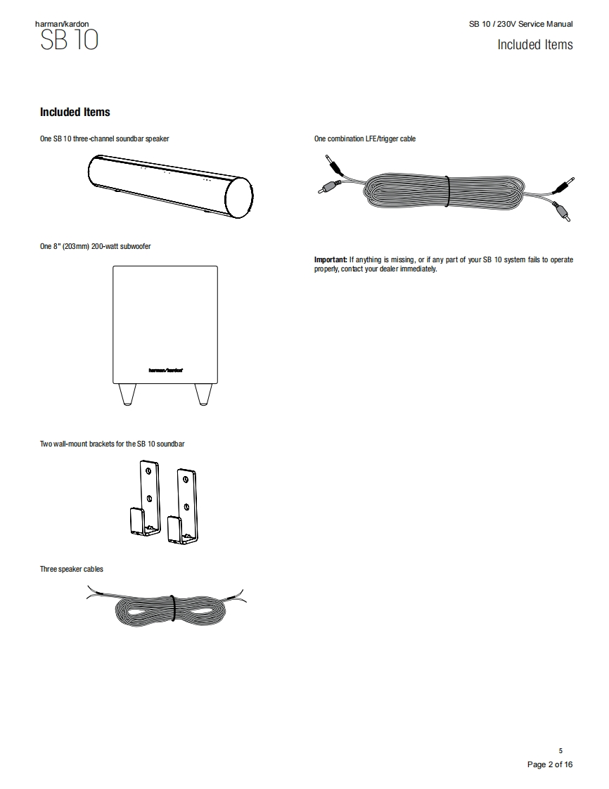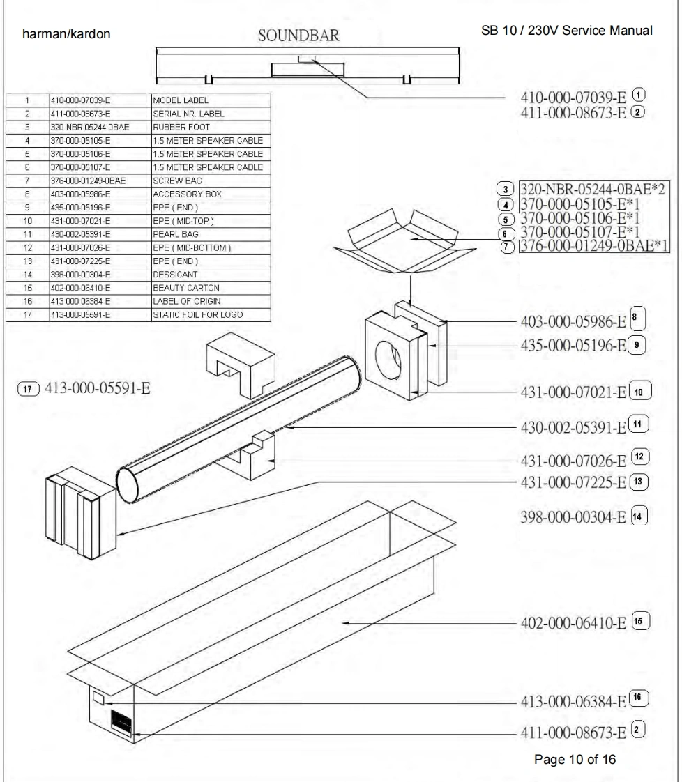 harman/kardonSB 10/230V Service ManualHarman/kardonService ManualSB10/230Passive Soundbar with active subwooferCONTENTSINCLUDED ITEMSSOUNDBAR PACKAGE LIST AND PARTS10SUBWOOFER REAR PANEL3SOUNDBAR EXPLODED VIEW/PARTS1CONNECTIONSSUBWOOFER PACKAGE LIST AND PARTSOPERATION7SUBWOOFER EXPLODED VIEW/PARTS13TROUBLESHOOTING8SUBWOOFER SCHEMATIC DIAGRAMS14SPECIFICATIONS9Released EU2010Harman Consumer Group,Inc.Rev0,12/20108500 Balboa BoulevardNorthridge,California 91329Page 1 of 16