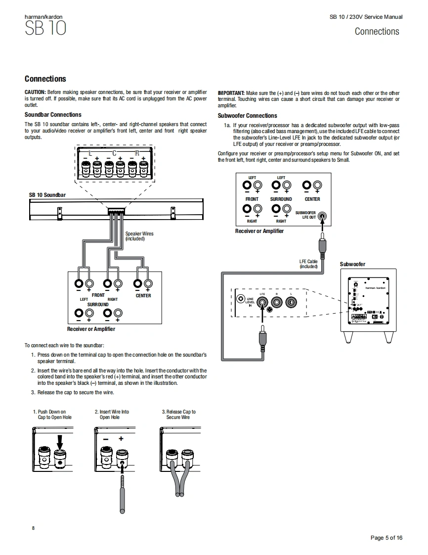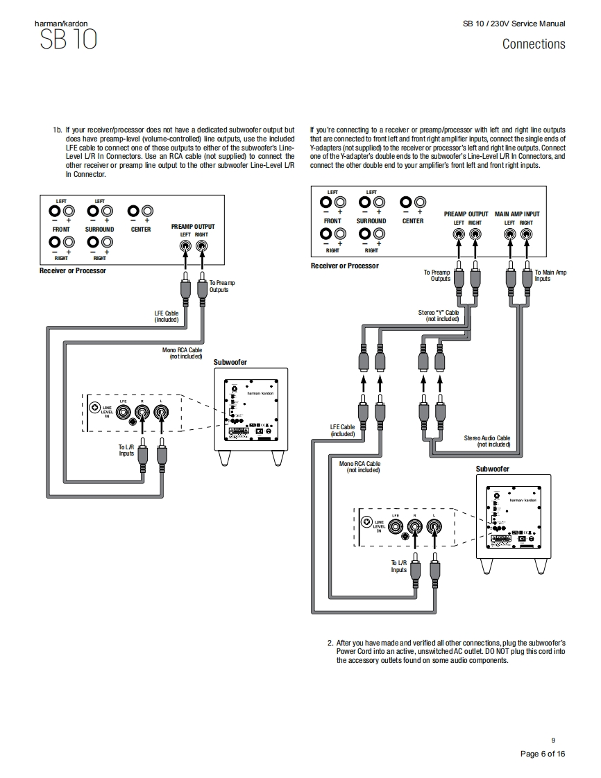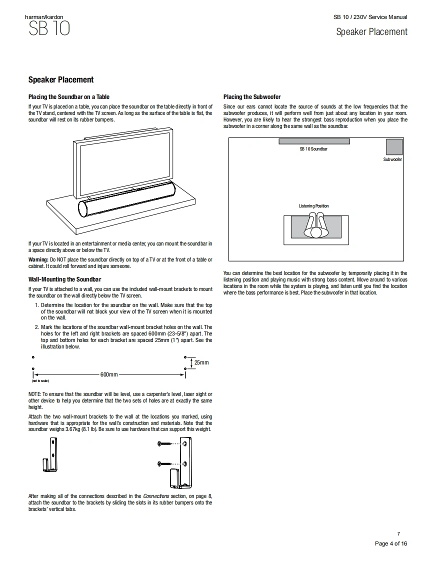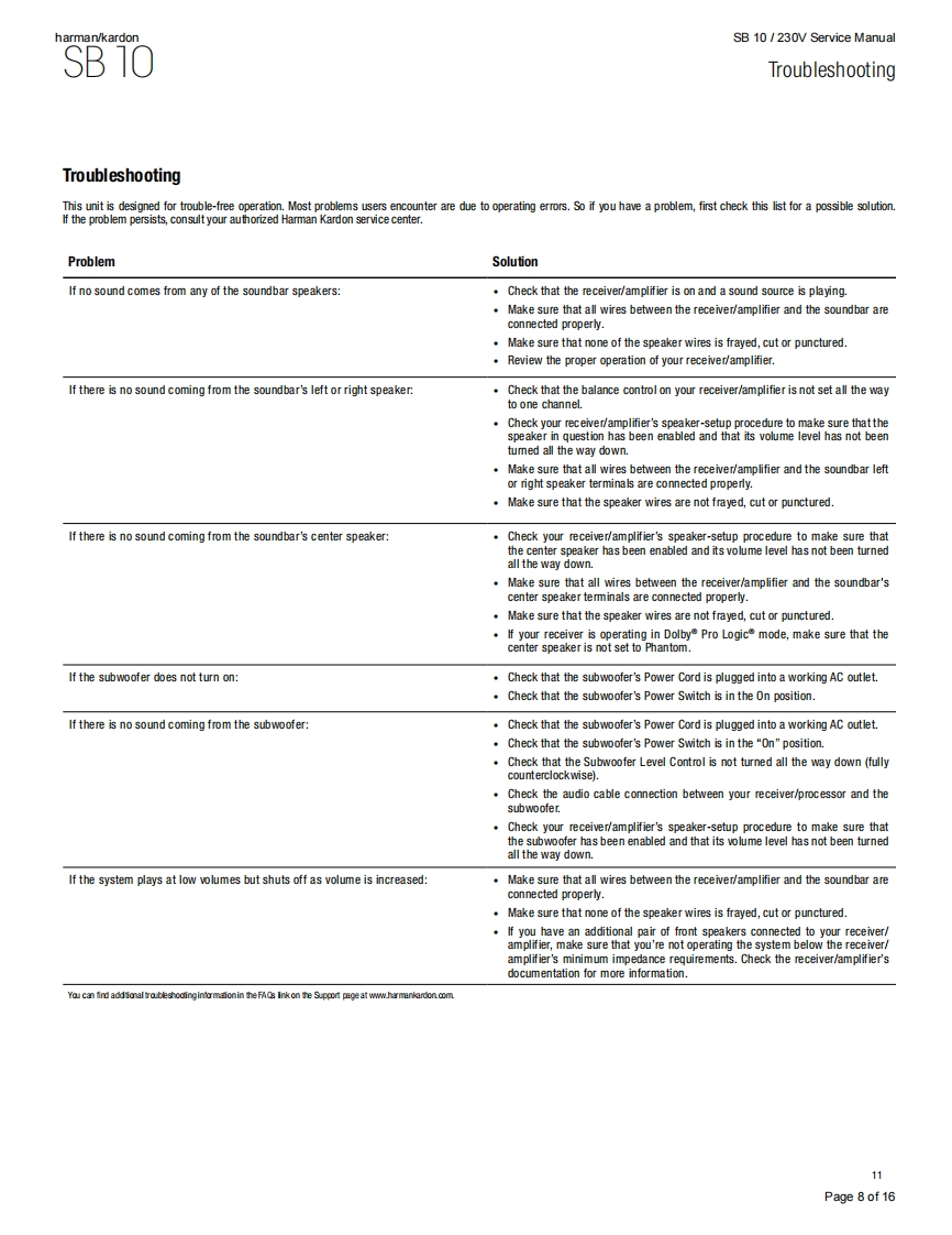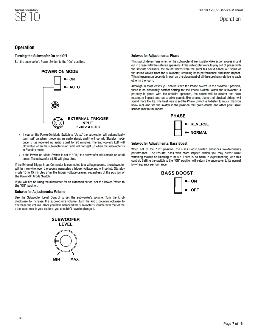 harman/kardonSB 10/230V Service ManualHarman/kardonService ManualSB10/230Passive Soundbar with active subwooferCONTENTSINCLUDED ITEMSSOUNDBAR PACKAGE LIST AND PARTS10SUBWOOFER REAR PANEL3SOUNDBAR EXPLODED VIEW/PARTS1CONNECTIONSSUBWOOFER PACKAGE LIST AND PARTSOPERATION7SUBWOOFER EXPLODED VIEW/PARTS13TROUBLESHOOTING8SUBWOOFER SCHEMATIC DIAGRAMS14SPECIFICATIONS9Released EU2010Harman Consumer Group,Inc.Rev0,12/20108500 Balboa BoulevardNorthridge,California 91329Page 1 of 16