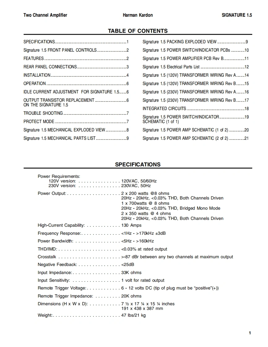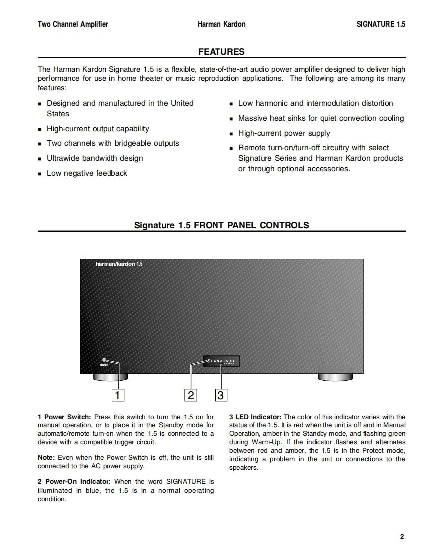 harman/kardonSignature 1.5Two Channel AmplifierTECHNICAL MANUALharman kardon 15S1n圆Harman Consumer Group250 Crossways Park DriveWoodbury,N.Y.117971-800645-7484 in the USAH A Harman International CompanyPart No.:1112-SIGNATURE1.5 Rev A 7/99