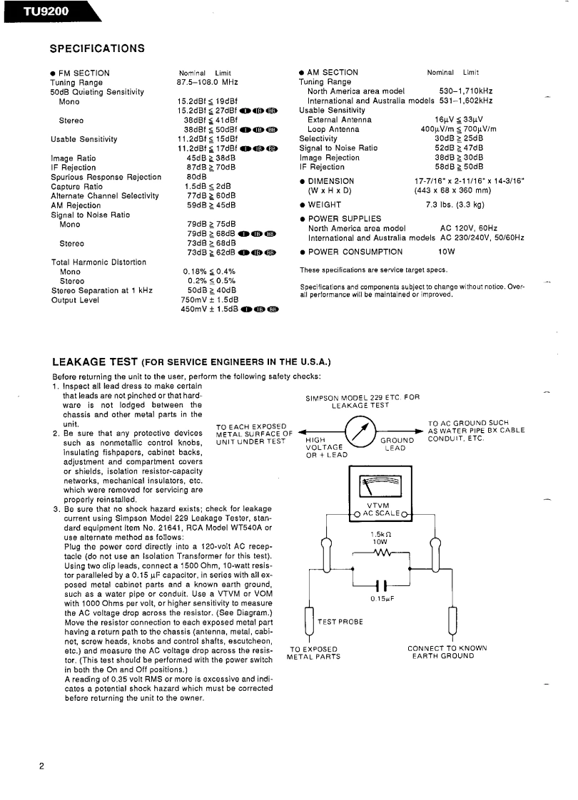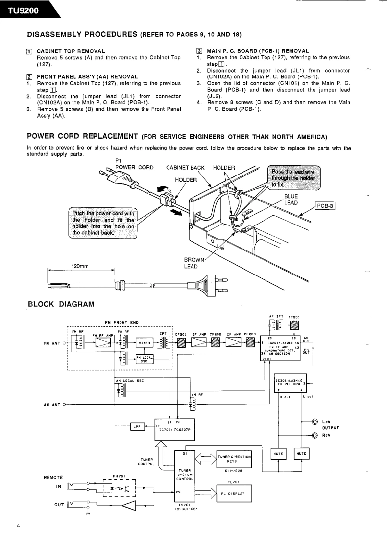The Harman KardonModel TU9200Manual 180AAM/FM STEREO TUNERTU9200Technical Manualharman/kardon Tus28B.868The following marks found in the parts list of this manual identifythe models as follows.⑧K:North America area model Black version●:International modelB:International model Black version思Australia model Black versionCONTENTSSPECIFICATIONS.2IC TERMINAL FUNCTIONS…7LEAKAGE TEST….2GENERAL UNITCONTROLS AND FUNCTIONS,,3(EXPLODED VIEW)..........................DISASSEMBLY PROCEDURESGENERAL UNIT PARTS LIST ...................10POWER CORO REPLACEMENT .................4P.C.BOARDS,11BLOCK DIAGRAM .............................4ELECTRICAL PARTS LIST.13CIRCUIT DESCRIPTION ........................5SCHEMATIC DIAGRAM........................16TIMING CHART.......……5WIRING DIAGRAM............................18ALIGNMENT PROCEDURES.....................6harman/kardon