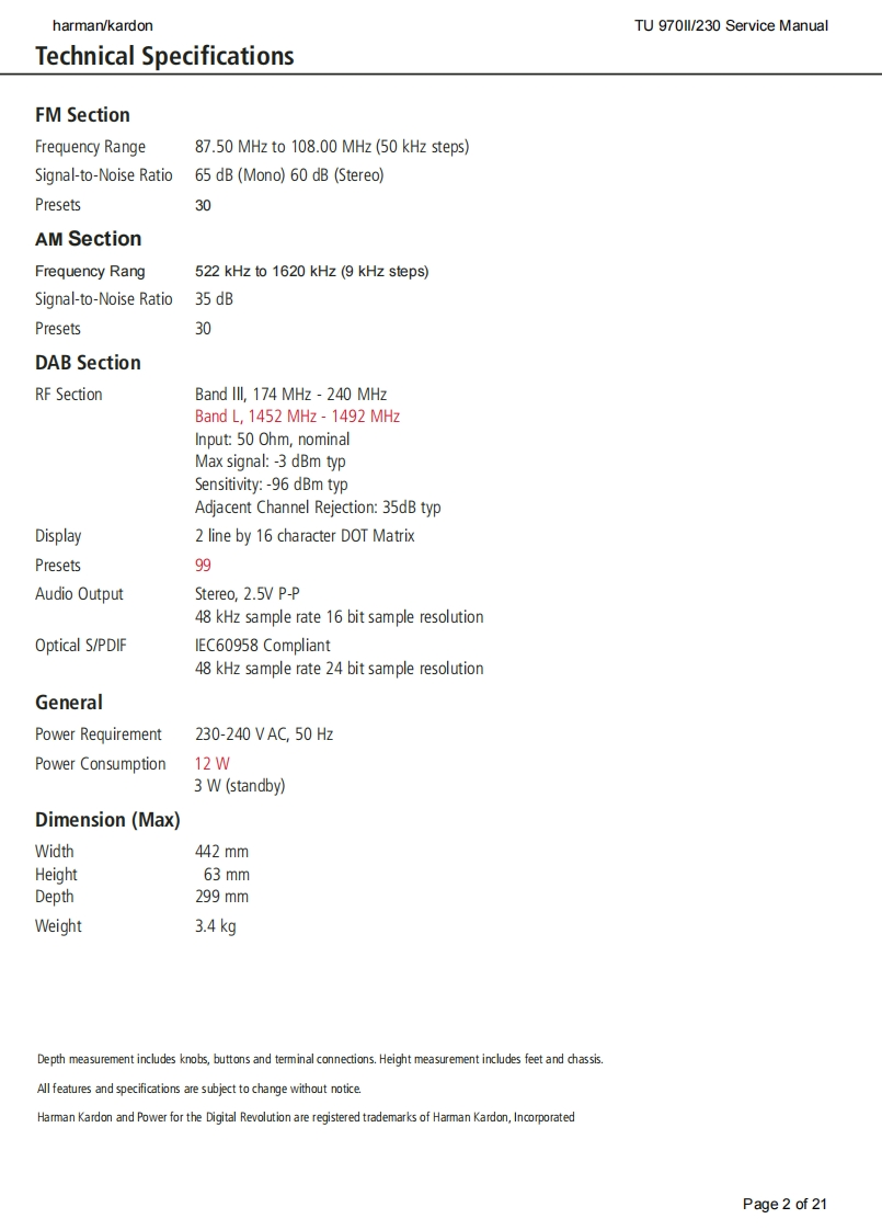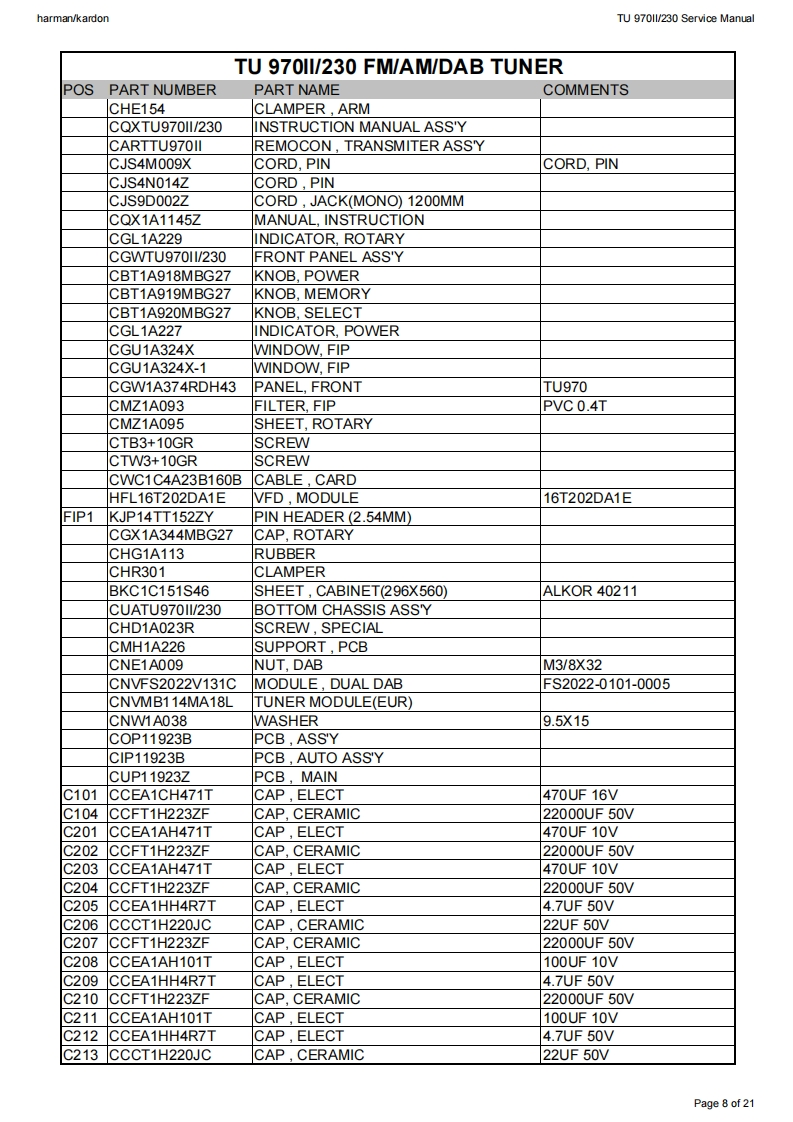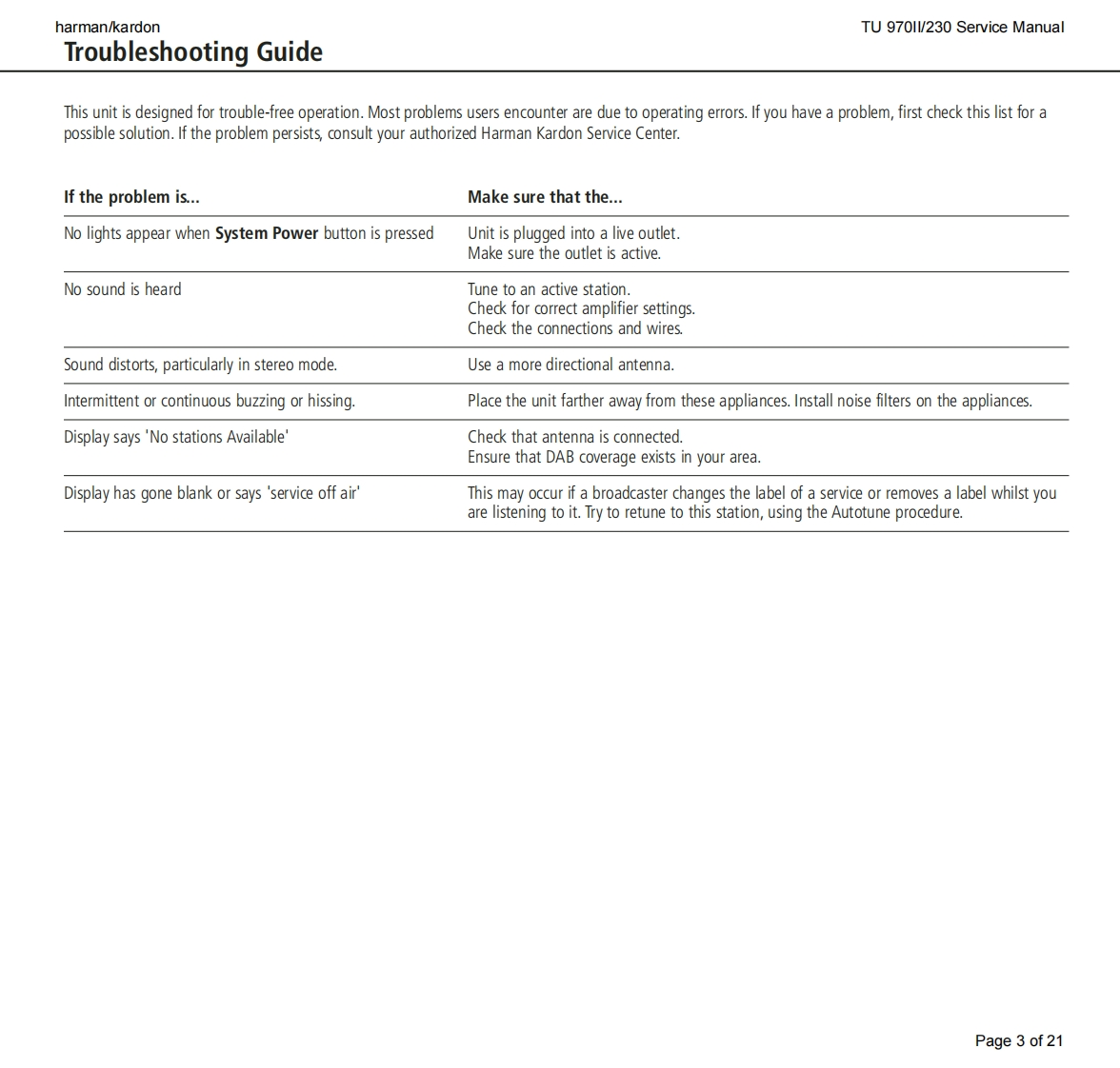 harman/kardonTU 97011/230 Service Manualharman/kardonService ManualTU9701I/230FM/AM/DAB TunerU四FM97.98HHzharman/kardonCONTENTSTECHNICAL SPECIFICATIONSELECTRICAL PARTS LIST8TROUBLESHOOTING GUIDE3SEMICONDUCTOR FUNCTION/PINOUTS 15FRONT PANEL CONTROLS4PCB DRAWINGS18REAR PANEL CONNECTIONS6BLOCK DIAGRAM19REMOTE CONTROL FUNCTIONS6WIRING DIAGRAM0EXPLODED VIEW AND PARTS>SCHEMATIC DIAGRAM21Released EU2008harman/kardon,Inc.Rev0,10/2008250 Crossways Park Dr.Woodbury,New York,11797Page 1 of 21