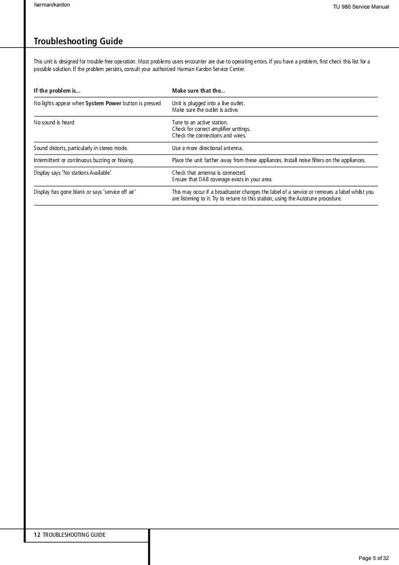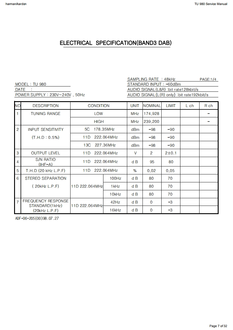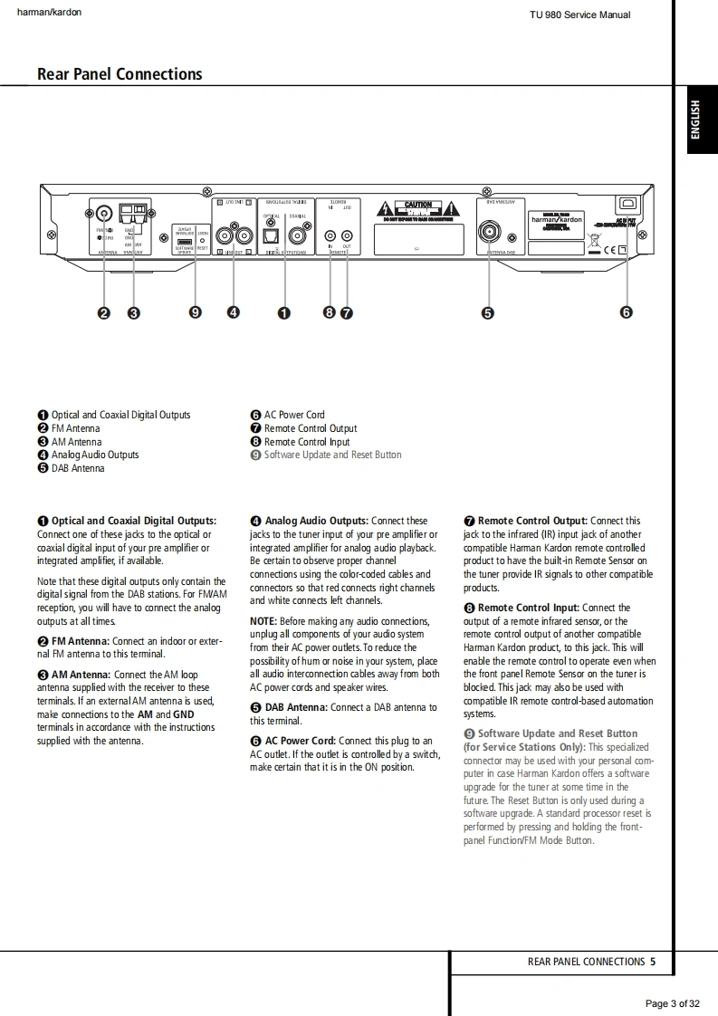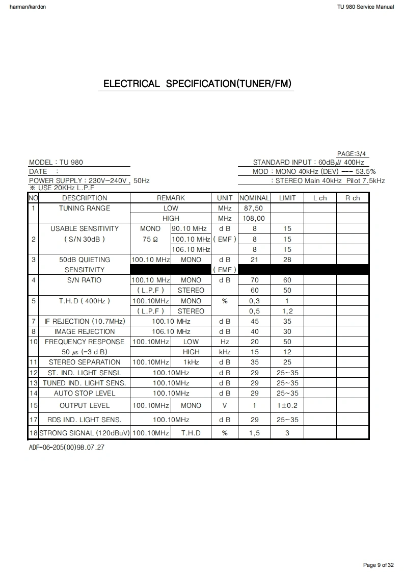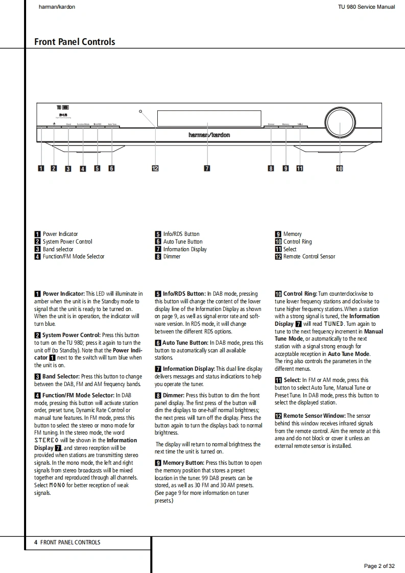 hamman/kardonTU 980 Service Manualharman/kardonService ManualTU980/230FM/AM/Dual-band DAB Tuner with RDS吗SWR3LIVE LYRIXharman/kardonCONTENTSFRONT PANEL CONTROLSEXPLODED VIEW AND PARTS13REAR PANEL CONNECTIONS3ELECTRICAL PARTS LIST14REMOTE CONTROL FUNCTIONSSEMICONDUCTOR FUNCTION/PINOUTS 21TROUBLESHOOTING GUIDEPCB DRAWING2TECHNICAL SPECIFICATIONS6BLOCK DIAGRAM30PACKAGE LIST AND PARTS1WIRING DIAGRAM31DISASSEMBLY12SCHEMATIC DIAGRAM2Released EU2010harman/kardon,IncRev0,09/2010250 Crossways Park Dr.Woodbury,New York,11797Page 1 of32