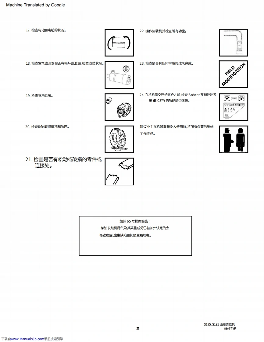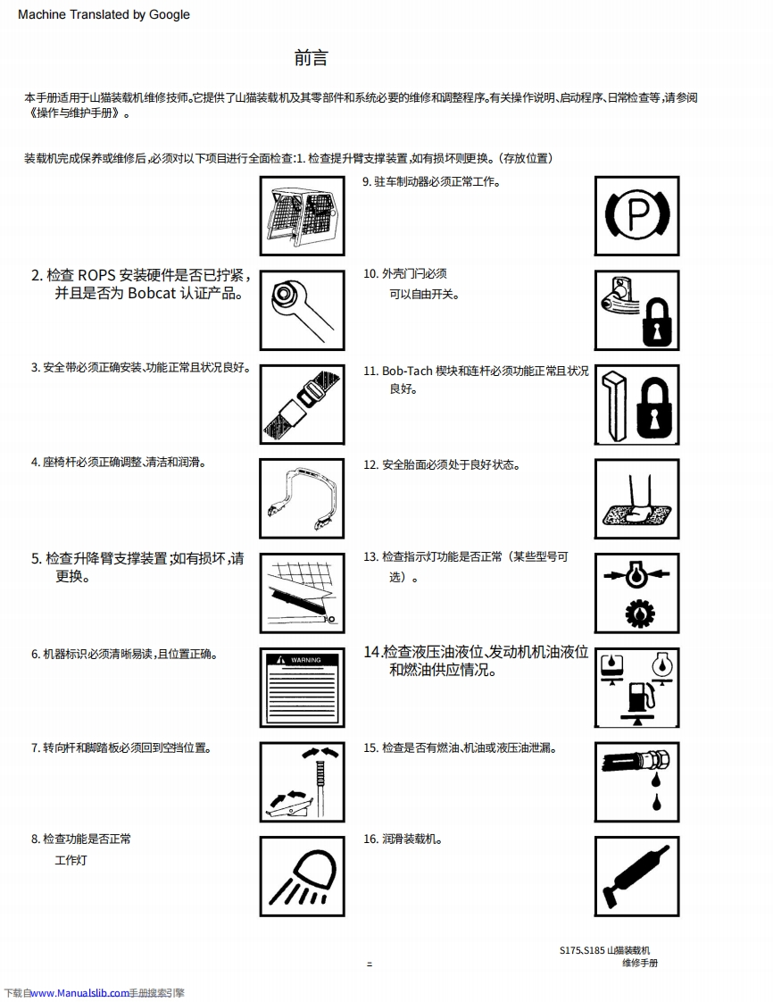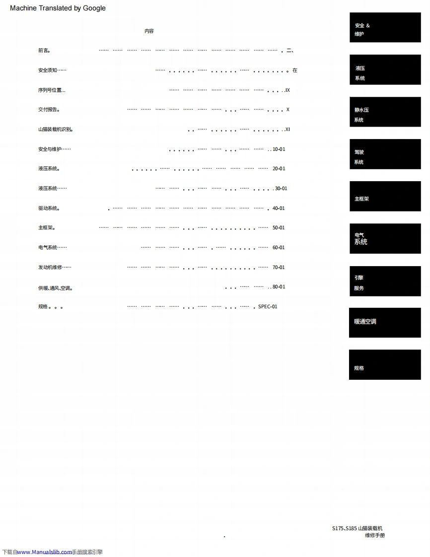 bobcat山猫s185装载机操作与维修保养手册.含电器原理图和液压原理图找手册网16天前发布关注私信0.12GB933页045bobcat山猫s185装载机操作与维修保养手册.含电器原理图和液压原理图此内容为付费资源,请付费后查看¥29¥31黄金会员免费钻石会员免费登录购买付费资源 第1页 / 共933页 第2页 / 共933页 第3页 / 共933页 第4页 / 共933页 第5页 / 共933页 第6页 / 共933页 第7页 / 共933页 第8页 / 共933页 第9页 / 共933页 第10页 / 共933页 试读已结束,还剩923页,您可下载完整版后进行离线阅读 THE ENDJLG/CROWN/Bobcat 文本预览 Machine Translated by GoogleS175Bobcat.服务手动的S185序列号525011001及以上序列号525111001及以上TURBO序列号525211001及以上序列号525311001及以上包含高流量配备有山猫互锁控制系统(BICS网)Ingersoll RandCompuct Minicle Tectnologies6902732(2-06)美印制@Bobcat公问2006下载自www.Manualslib.com手册搜索呂擎 查看更多 收起部分 喜欢就支持一下吧收藏