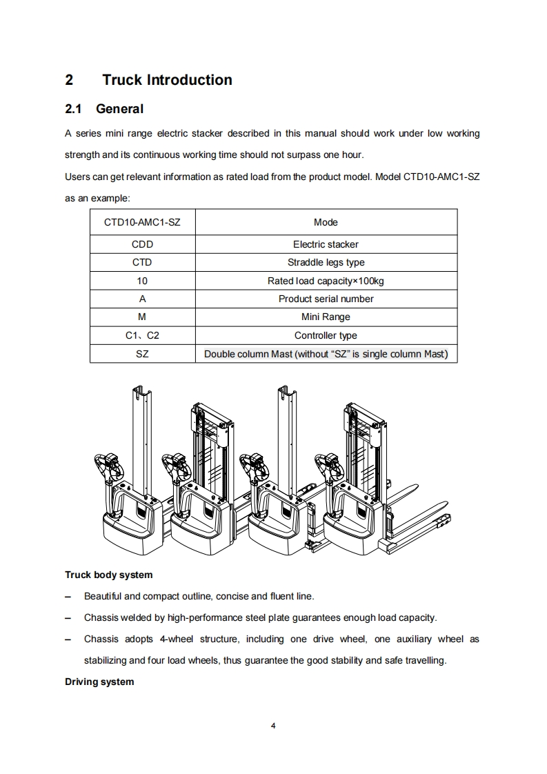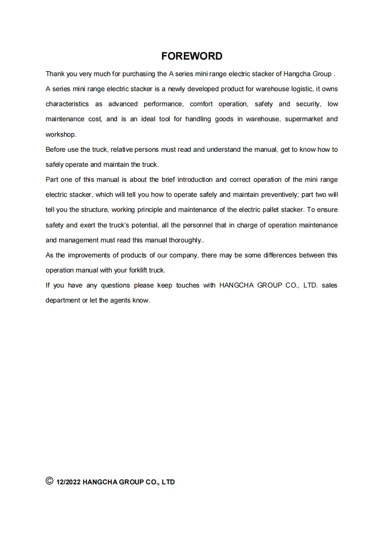 杭州叉车OMM-CDD10-12-AMC2零部件和维修手册含电器原理图和液压原理图找手册网16天前发布关注私信6.76MB117页026杭州叉车OMM-CDD10-12-AMC2零部件和维修手册含电器原理图和液压原理图此内容为付费资源,请付费后查看¥29¥31黄金会员免费钻石会员免费登录购买付费资源 第1页 / 共117页 第2页 / 共117页 第3页 / 共117页 第4页 / 共117页 第5页 / 共117页 第6页 / 共117页 第7页 / 共117页 第8页 / 共117页 第9页 / 共117页 第10页 / 共117页 试读已结束,还剩107页,您可下载完整版后进行离线阅读 THE END杭州叉车/Dino/Bao-li叉车/现代 文本预览 3c>HANGCHAMini RangeCDD10/12-AMC1ELECTRIC STACKERCTD10/12-AMC1CDD10/12-AMC1-SZCTD10/12-AMC1-SZCDD10/12-AMC2CTD10/12-AMC2OPERATION AND MAINTENANCEMANUALOriginal InstructionHANGCHA GROUP CO.,LTD.1212022 查看更多 收起部分 喜欢就支持一下吧收藏