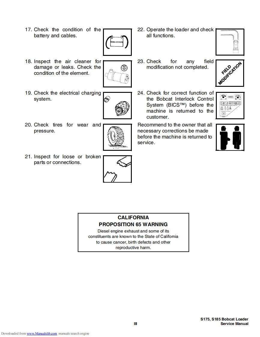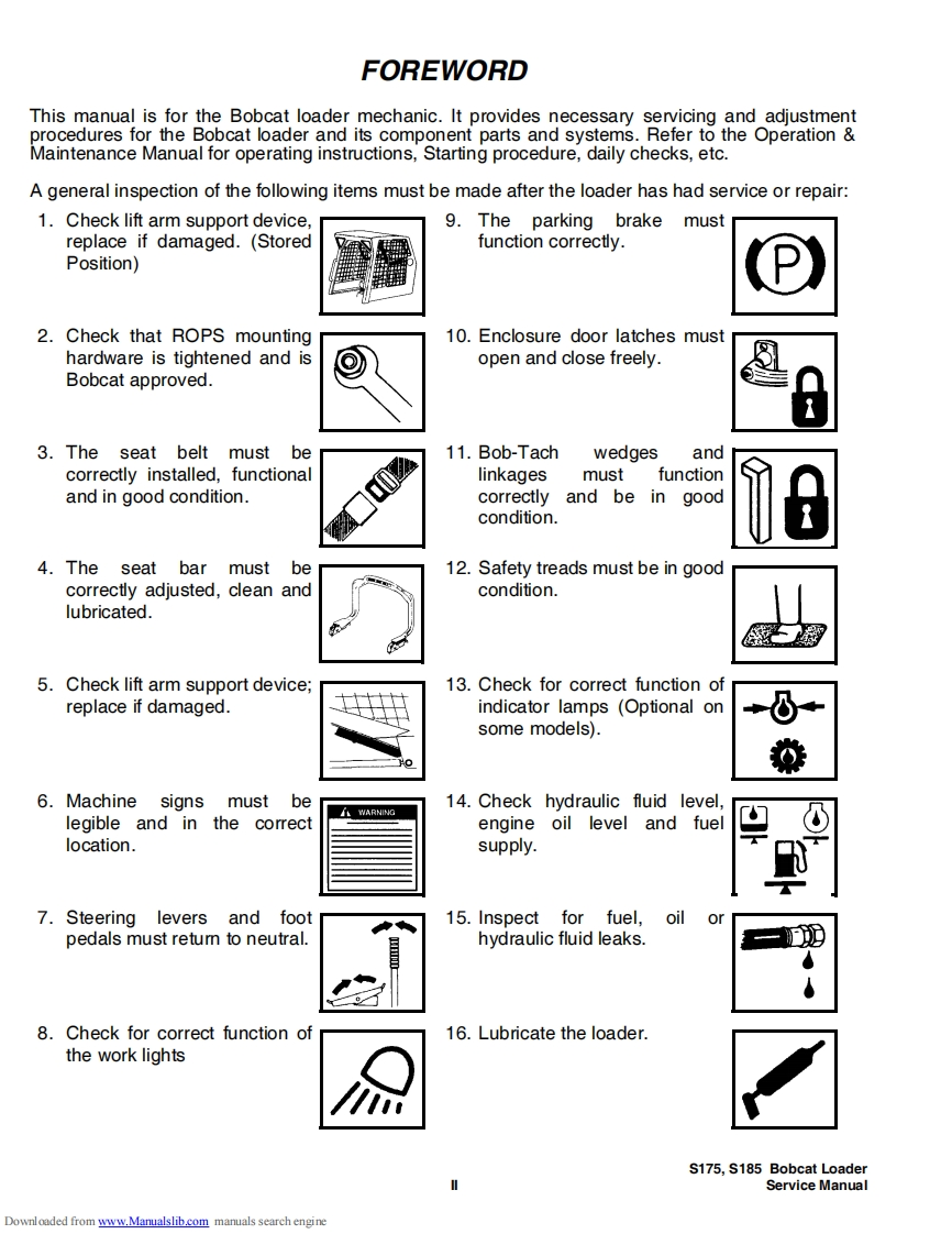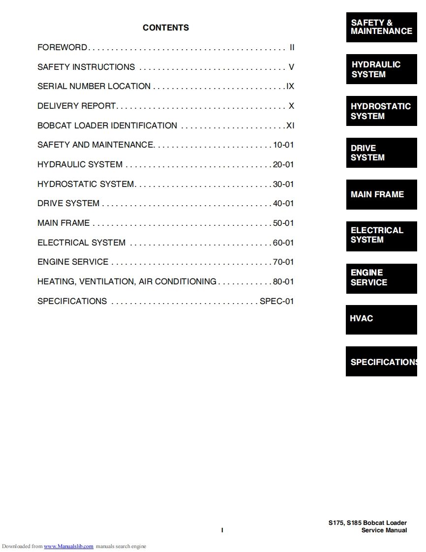 S75Bobeat.ServiceManualS185S/N525011001&AboveS/N525111001&AboveTURBOS/N525211001&AboveS/N525311001&AboveINCLUDES HIGH FLOWEQUIPPED WITHBOBCAT INTERLOCKCONTROL SYSTEM(BICSTM)ingersoll RandCompuct Vehicle Technologies6902732(2-06)Printed in U.S.A.@Bobcat Company 2006Downloaded from www.Manualslib.com manuals search engine