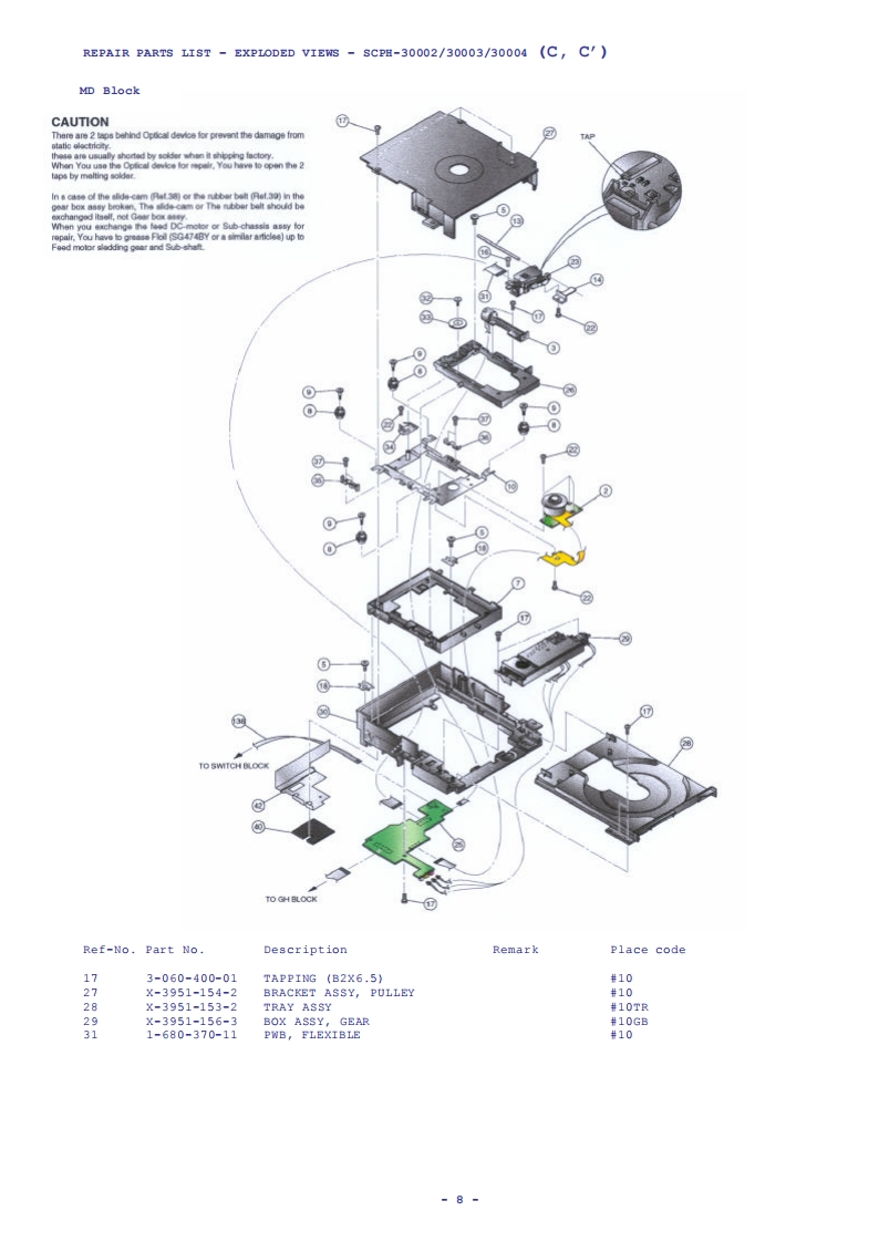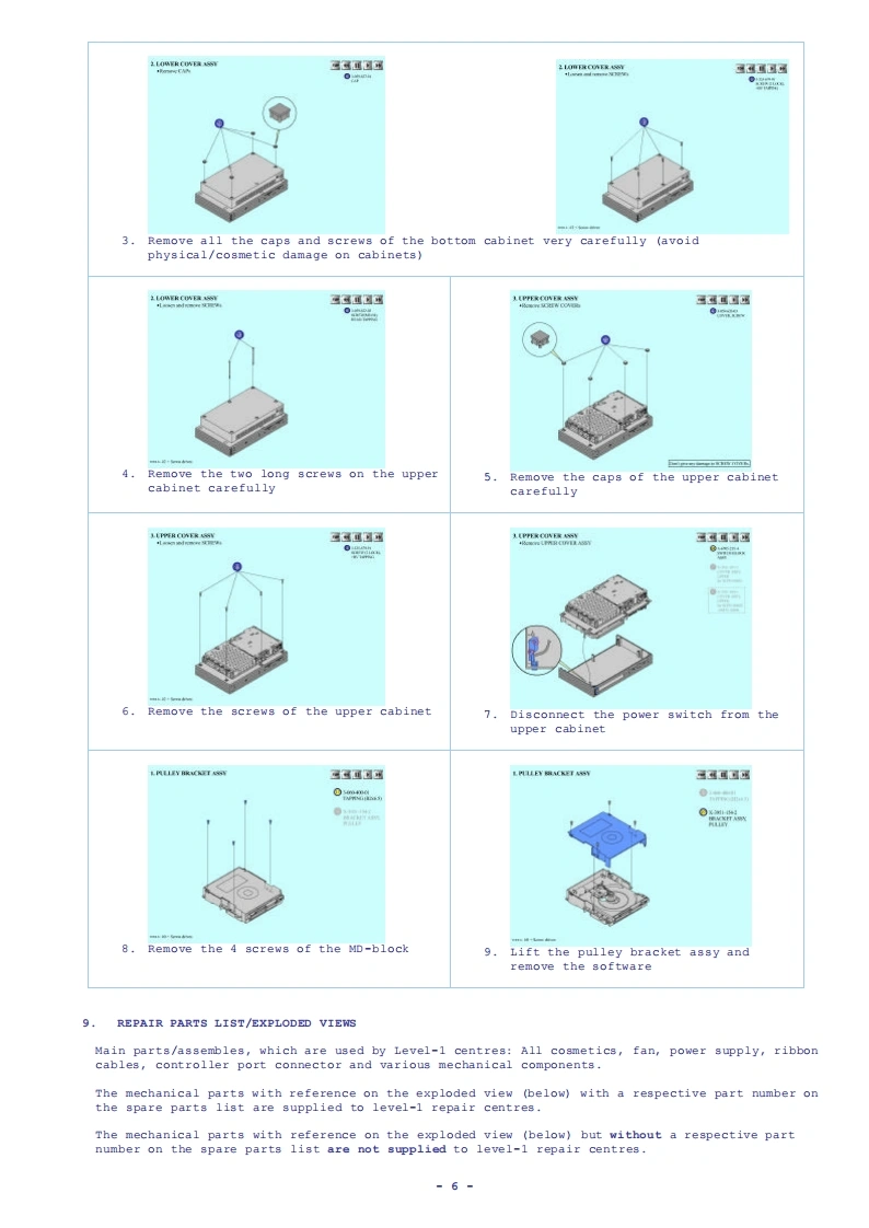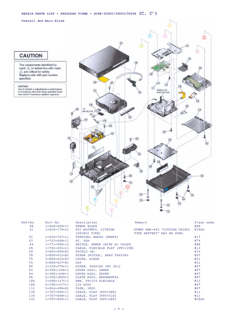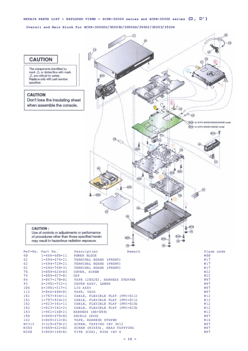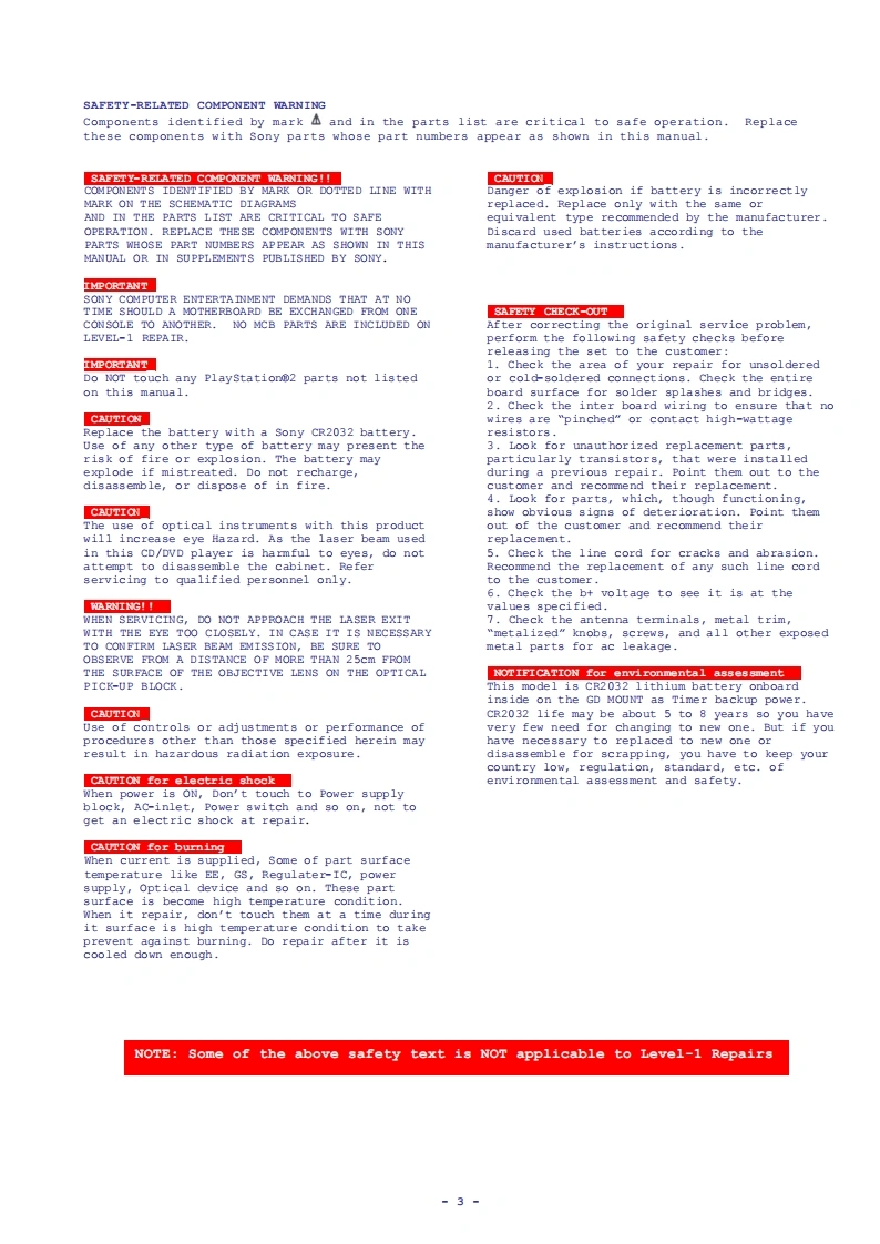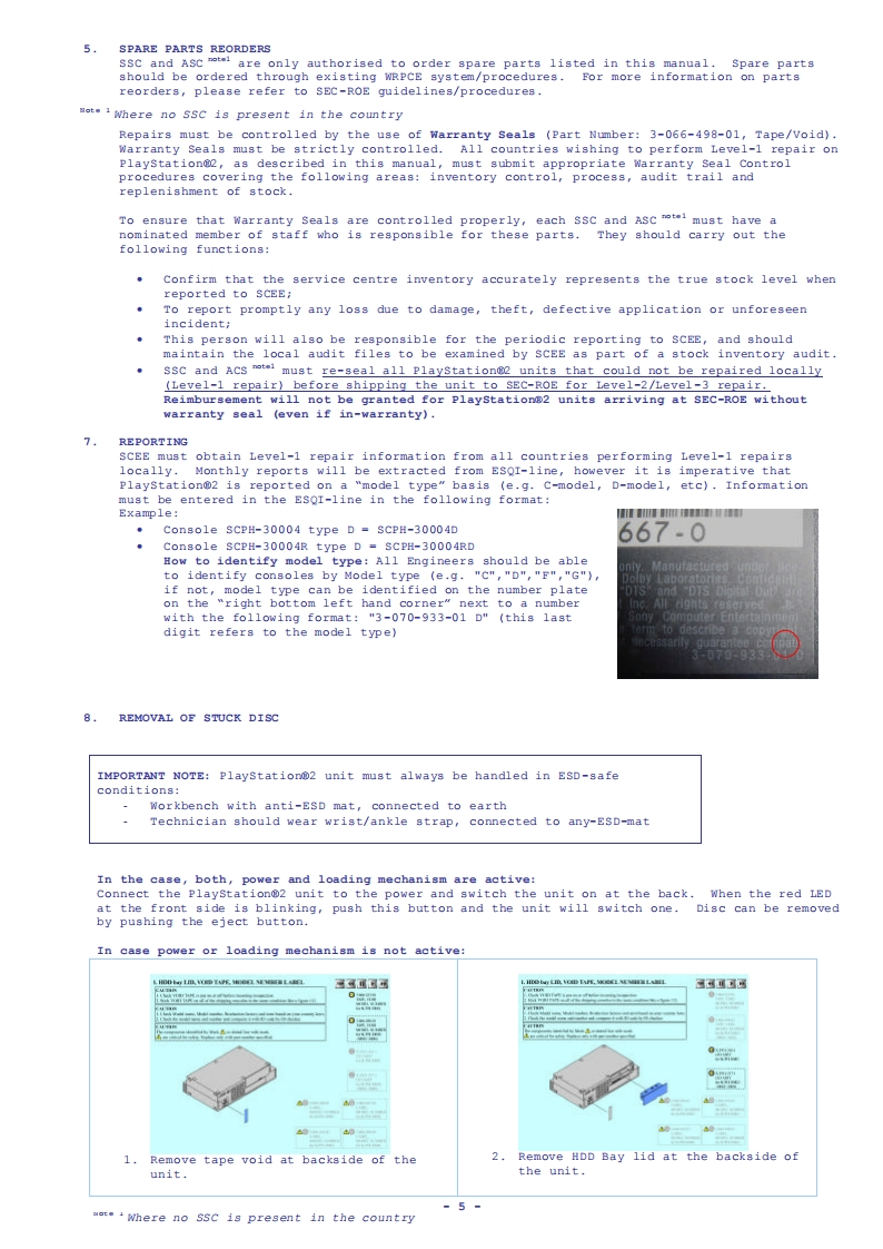Playstation®2SCpH-30000seriesSCPH-35000seriesSCPH-30000R seriesSCPH-39000 seriesSCPH-50000/50000sS seriesSERVICE MANUALLevel-1PlayStation2 Level-1 Service Procedures Manual Version 4.0 Sept 2003MOTE:READ THIS DOCUMNENT IN CONJUCTION WITH THE LATEST SERVICE GUIDELINES ISSUED BY SECSPECIFICATIONSGeneralInputs/Outputs on the rearPower requirementsHDD by slot (1)220-240VAC,50/60Hzfor SCPH-30002D/-30003D/-300004DOutputs on the rear-35002/-350003/-350004AV Multi out port (1)RGB,Ycber,Y/C,Composite-video,Power consumptionAudio-L/R,XGA50wDigital out port (1)for SCPH-30002D/-30003D/-300004DOptical audio-35002/-350003/-350004DimensionsSupplied accessories301x78x182mm(w/h/dAC power cord (1)MassEuro-AV connector (1)2.4kgfor SCPH-30003/4&35003/4SCPH-30003/4R&SCPH-39003/4Inputs/outputs on the frontsCPH-50003/4&sCPH-50003/4SSController ports (2)A/V connecting cable (1)Memory Card slots (2)Dualshock2 Analog controller (1)USB ports (2)S400 (I-Link)port (1)DISC (GT3)for SCPH-35002/-350003/-350004-1-