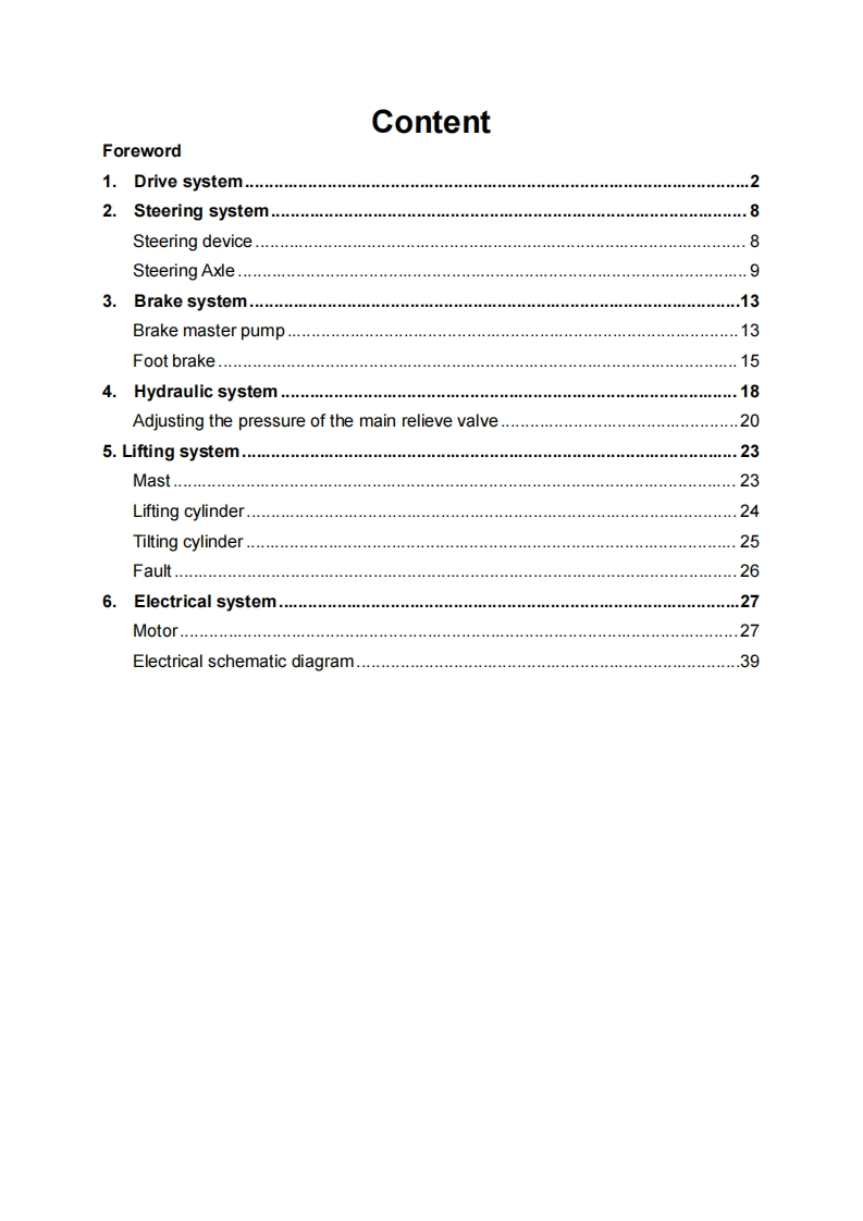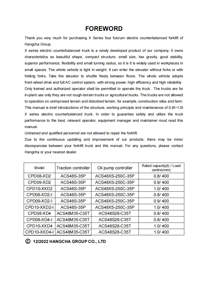杭州叉车SM-CPD08-XD4–CPD10-XXD4零部件和维修手册含电器原理图和液压原理图找手册网16天前发布关注私信2.32MB45页034杭州叉车SM-CPD08-XD4–CPD10-XXD4零部件和维修手册含电器原理图和液压原理图此内容为付费资源,请付费后查看¥29¥31黄金会员免费钻石会员免费登录购买付费资源 第1页 / 共45页 第2页 / 共45页 第3页 / 共45页 第4页 / 共45页 第5页 / 共45页 第6页 / 共45页 第7页 / 共45页 第8页 / 共45页 第9页 / 共45页 第10页 / 共45页 试读已结束,还剩35页,您可下载完整版后进行离线阅读 THE END杭州叉车/Dino/Bao-li叉车/现代 文本预览 X SeriesX Series four fulcrum electric counterbalanced forkliftCPD08/09-XD2CPD08-XD4CPD08/09-XD2-1CPD08-XD4-1CPD10-XXD2CPD10-XXD4CPD10-XXD2-1CPD10-XXD4-1Service manualOriginal InstructionHANGCHA GROUP CO..LTD.12/2022 查看更多 收起部分 喜欢就支持一下吧收藏