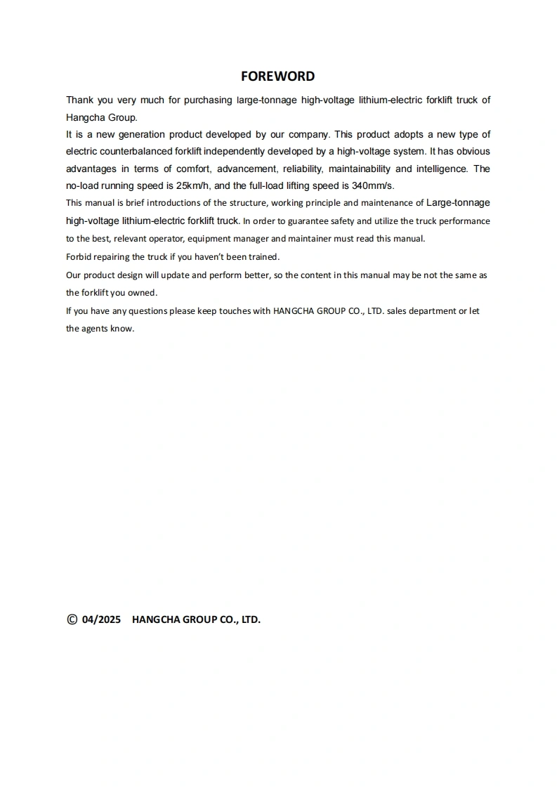杭州叉车SM-CPD200-250-XHL2G零部件和维修手册含电器原理图和液压原理图找手册网16天前发布关注私信15.87MB149页025杭州叉车SM-CPD200-250-XHL2G零部件和维修手册含电器原理图和液压原理图此内容为付费资源,请付费后查看¥29¥31黄金会员免费钻石会员免费登录购买付费资源 第1页 / 共149页 第2页 / 共149页 第3页 / 共149页 第4页 / 共149页 第5页 / 共149页 第6页 / 共149页 第7页 / 共149页 第8页 / 共149页 第9页 / 共149页 第10页 / 共149页 试读已结束,还剩139页,您可下载完整版后进行离线阅读 THE END杭州叉车/Dino/Bao-li叉车/现代 文本预览 Large-tonnage high-voltage lithium-electricCPD200/250-XHL2Gforklift truckService ManualHANGCHA GROUP CO.,LTD.04/2025 查看更多 收起部分 喜欢就支持一下吧收藏