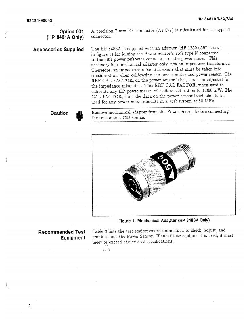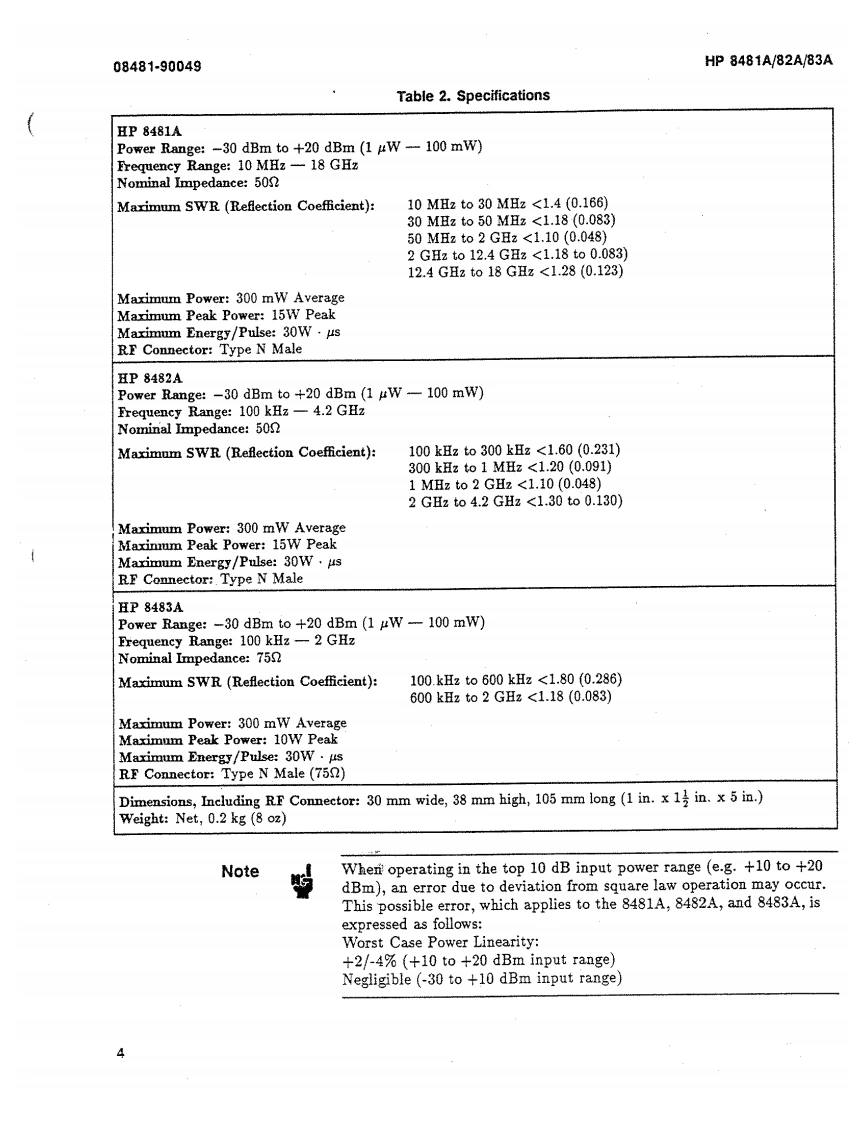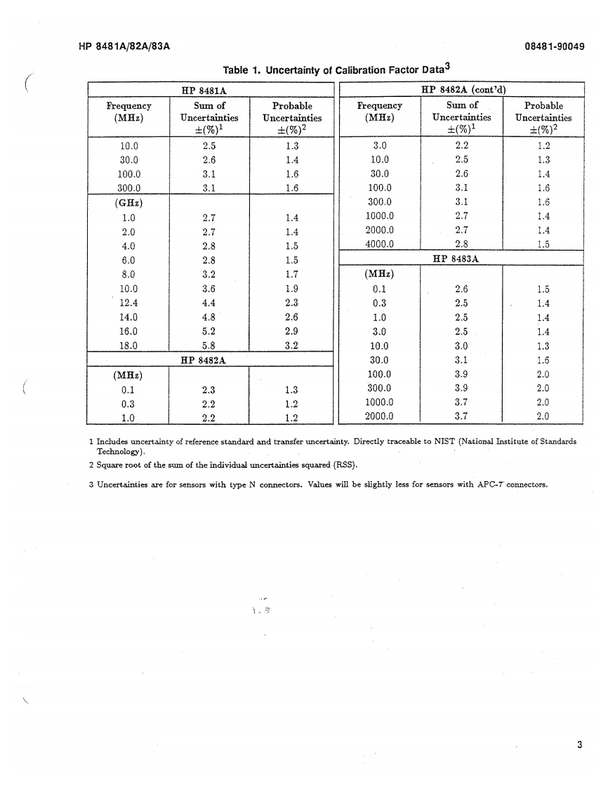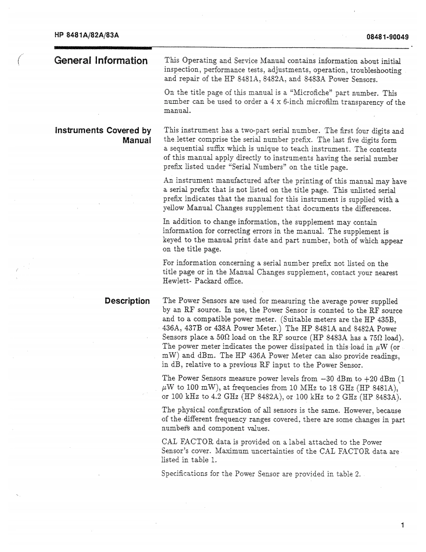 OPERATING AND SERVICE MANUALHP 8481AHP8482AHP 8483APOWER SENSORSERIAL NUMBERSThis manual applies directly to instruments withserial numbers prefixed:HP8481A:2702AHP8482A:2652AHP8483A:2701AWith the changes described in the Appendix,thismanual also applies to instruments with serial num-bers prefixed:HP8481A:1550A,1926A,2237A,2349A,2552AHP8482A:1551A,1925A,2237A,2349A,2607AHP8483A:1602A,1925A,2243A,2329A,2351A,2405A,2623AFor additional important information about serialnumbers,see "Instruments Covered By Manual".HEWLETTPACKARDCCopyright HEWLETT-PACKARD COMPANY 1975,1979,1986,1990CONTROLLEDMANUAL PART NO.08481-90049DOCUMENT