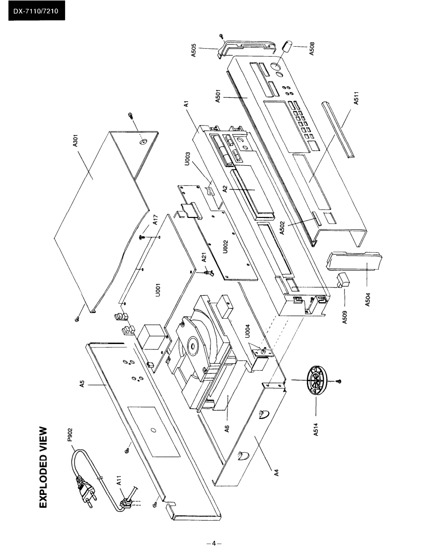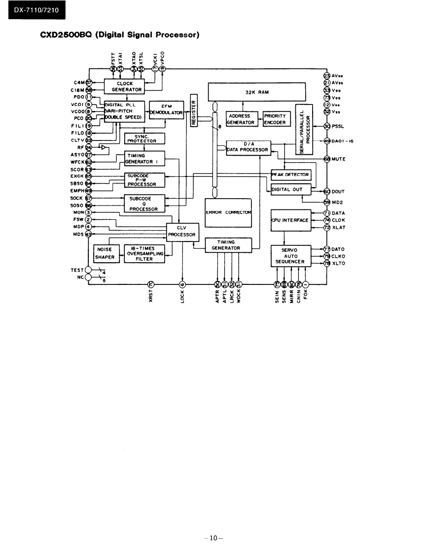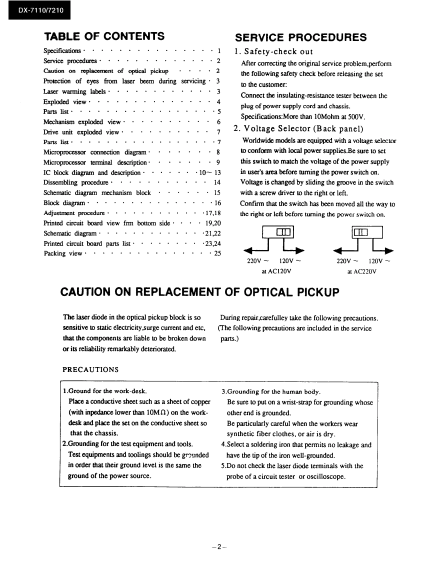 DX-7110/7210Ref.No.0M3496ONO。SERVICE MANUALCOMPACT DISC PLAYERMODEL DX-7110/7210三,Black and Silver (only DX-7210)modelBMP SMP230V AC.50HzBMD120VAC.60Zonly DX-7210BBMW120220VAC.5(060uSAFETY-RELATED COMPONENT WARNING!!SPECIFICATIONSCOMPONENTS IDENTIFIED BY MARK A ON THECompact Dise Plaver Model DX-730SCHEMATIC DIAGRAM AND IN THE PARTS LIST ARESignal readout system:Optical non-contactCRITICAL FOR RISK OF FIRE AND ELECTRIC SHOCK.Reading rotation:About 500-200 r.p.m.REPLACE THESE COMPONENTS WITH ONKYO PARTS(constant linear velocity)Linear velocity:1.2-1.4msWHOSE PARTS NUMBERS APPEAR AS SHOWN IN THISError correction system:Cross Interleave Reed Solomon codeMANUALD/A converter:1 bit PWM ACCUPULSE D/A CON.VERTERMAKE LEAKAGE-CURRENT OR RESISTANCE MEA.Sampling frequency:352.8kHzSUREMENTS TO DETERMINE THAT EXPOSED PARTS(Eight-times oversampling)ARE ACCEPTABLY INSULATED FROM THE SUPPLYNumber of channels:2 (stereo)CIRCUIT BEFORE RETURNING THE APPLIANCE TOFrequency response:5 Hz 20 kHzTHE CUSTOMER.Total harmonic distortion:0.004%(at 1 kHz)Dynamic range:96 dBSignal to noise ratio:100dBChannel separation:90 dB (at 1 kHz)Wow and Flutter:Below threshold of measurabilityOutput level:2 volts r.m.s.Power consumption:12 wattsPower supply rating:U.K.and Australian models:AC240V.50H2European model:AC 230V,501lz (Except U.K.)USA Canadian models:AC 120V,60HzONKYOWorldwide model:AC 120V and 220Vswitchable 50/60HzAUDIO COMPONENTSDimensions(W×H×D:455×120×308mmWeight:4.8kg,I0.61bs,Specifications and external appearance are subject to change with-out notice because of product improvements