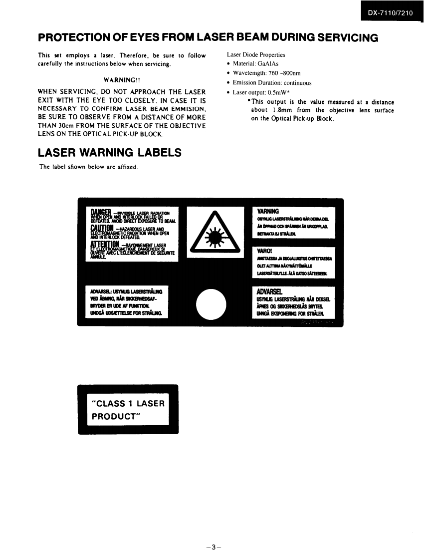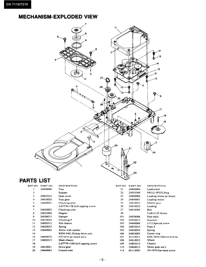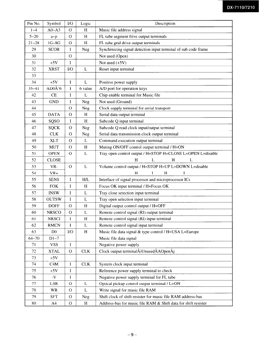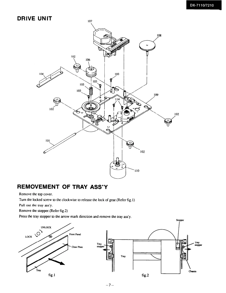 DX-7110/7210Ref.No.0M3496ONO。SERVICE MANUALCOMPACT DISC PLAYERMODEL DX-7110/7210三,Black and Silver (only DX-7210)modelBMP SMP230V AC.50HzBMD120VAC.60Zonly DX-7210BBMW120220VAC.5(060uSAFETY-RELATED COMPONENT WARNING!!SPECIFICATIONSCOMPONENTS IDENTIFIED BY MARK A ON THECompact Dise Plaver Model DX-730SCHEMATIC DIAGRAM AND IN THE PARTS LIST ARESignal readout system:Optical non-contactCRITICAL FOR RISK OF FIRE AND ELECTRIC SHOCK.Reading rotation:About 500-200 r.p.m.REPLACE THESE COMPONENTS WITH ONKYO PARTS(constant linear velocity)Linear velocity:1.2-1.4msWHOSE PARTS NUMBERS APPEAR AS SHOWN IN THISError correction system:Cross Interleave Reed Solomon codeMANUALD/A converter:1 bit PWM ACCUPULSE D/A CON.VERTERMAKE LEAKAGE-CURRENT OR RESISTANCE MEA.Sampling frequency:352.8kHzSUREMENTS TO DETERMINE THAT EXPOSED PARTS(Eight-times oversampling)ARE ACCEPTABLY INSULATED FROM THE SUPPLYNumber of channels:2 (stereo)CIRCUIT BEFORE RETURNING THE APPLIANCE TOFrequency response:5 Hz 20 kHzTHE CUSTOMER.Total harmonic distortion:0.004%(at 1 kHz)Dynamic range:96 dBSignal to noise ratio:100dBChannel separation:90 dB (at 1 kHz)Wow and Flutter:Below threshold of measurabilityOutput level:2 volts r.m.s.Power consumption:12 wattsPower supply rating:U.K.and Australian models:AC240V.50H2European model:AC 230V,501lz (Except U.K.)USA Canadian models:AC 120V,60HzONKYOWorldwide model:AC 120V and 220Vswitchable 50/60HzAUDIO COMPONENTSDimensions(W×H×D:455×120×308mmWeight:4.8kg,I0.61bs,Specifications and external appearance are subject to change with-out notice because of product improvements