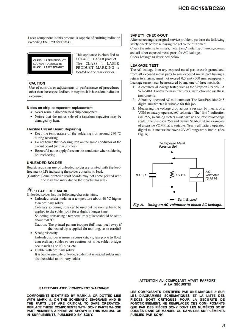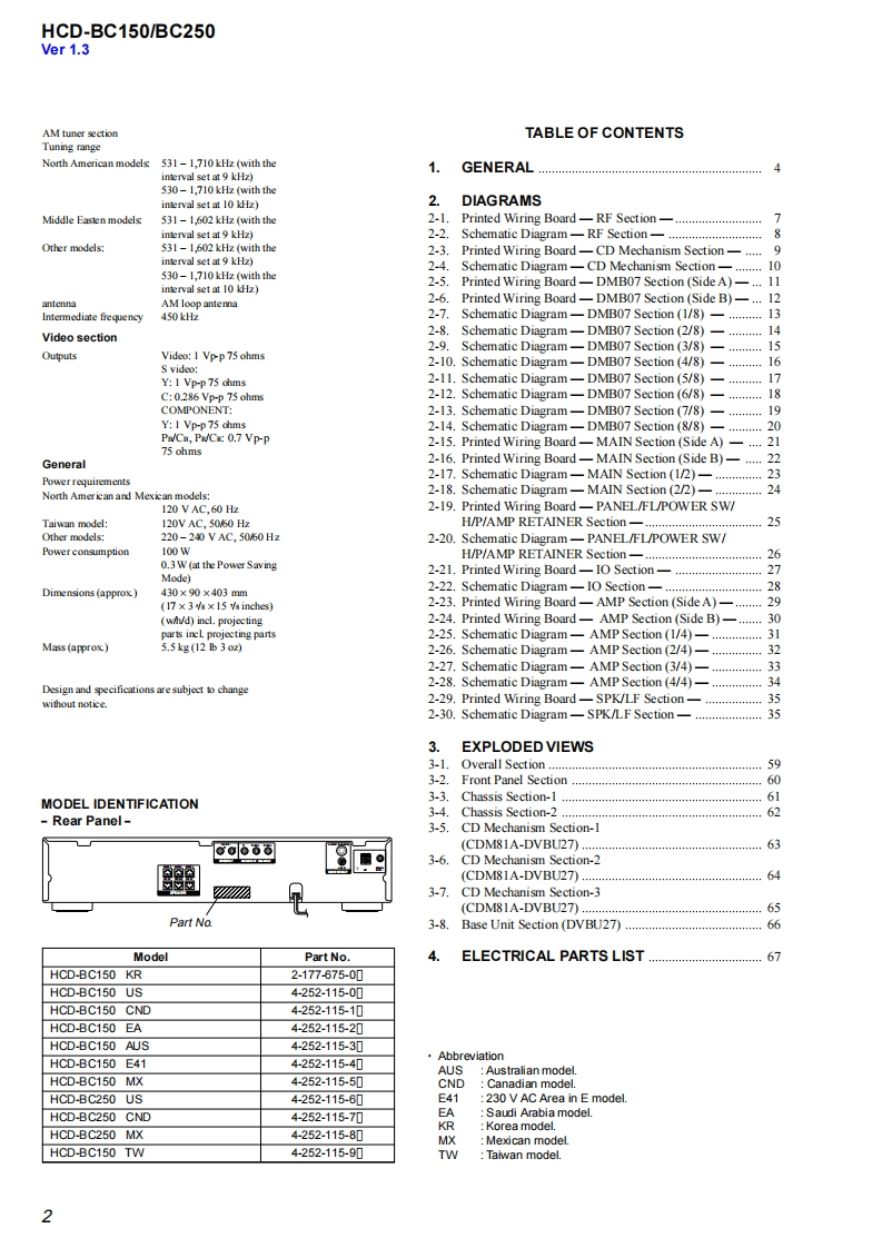 HCD-BC150/BC250SERVICE MANUALUS ModelCanadian ModelVer.1.52004.11EModelHCD-BC150/BC250Australian ModelHCD-BC150HCD-BC150/BC250 are the amplifier.DVD/Photo:HCD-BC150CD and tuner section in DAV-BC150/BC250This system incorporates with Dolby*Digital and DolbyFormer TypeNew Type ModelsPro Logic (II)adaptive matrix surround decoder and theDTS**Digital Surround System.Models(US,Canadian)Manufactured under license from Dolby Laboratories.Model Name Using Similar MechanismNEWNEW"Dolby","Pro Logic"and the double-D symbol aretrademarks of Dolby LaboratoriesMechanism TypeCDM81A-DVBU27CDM81C-DVBU100*Manufactured under license from Digital TheaterOptical Pick-up NameDBU-1KHM-310AAB/C2NPSystems,Inc."DTS"and "DTS Digital Surround"aretrademarks of Digital Theater Systems,Inc.SPECIFICATIONSAUDIO POWER SPECIFICATIONSOther models:Front:85 W+85 WDVD systemPOWER OUTPUT AND(with SS-TS10)LaserSemiconductor laserTOTAL HARMONICCenter:85 WDVD:元=60nmDISTORTION:With 4 ohm loads,both(with SS-TS10)(CD:入=780nm)channels driven,fromSurround:85 W+85 WEmission duration200-20,000 Hz rated(with SS-TS10)continuous65 watts per channelSubwoofer+:85 WSignal format systemNTSC (North Americanminimum RMS power,(with SS-WS10)models)with no more than 0.7%BC250NTSC/PAL (Othertotal harmonie distortionStereo mode (rated)65 W+65 W(4 ohms at 1models)from 250 milli watts tokHz,DIN)Frequency response (at 2 CH STEREO mode)rated output.Surround mode (reference)Front:113 W+113 WDVD (PCM):2 Hz to 22(with SS-TS11)kHz(仕H.0dB)Amplifier sectionCenter:113 WCD:2Hzto20kHz仕1.0BC150(with SS-CT11)dB)Stereo mode (rated)65W +65W(4 ohms at 1Surround:113W+113 WTuner sectionkHz,DIN)(with SS-TS10)Surround mode(reference)Subwoofer:115 WSystemPLL quartz-locked digitalNorth American models Front:108 W+108 W(with SS-WS10)synthesizer system(with SS-TS10)。Depending on the sound field semings a园eoreFM tuner sectionCenter:108 WTuning rangethere may be no soud ouppid.North American models:87.5-108.0MHz(with SS-TS10)Surround:108 W+108 WInputsVIDBO/SAT(100 kHz step)(AUDIO IN:Other models:873-1080MHz(with SS-TS10)Sensitivity:250/400 mVSubwoofer:110 W(50 kHz step)(with SS-WS10)Impedance:50 kilohmsFM wire antemaPhonesAccepts low-and high-Antenna terminals75 ohms,unbalancedimped由nce headphonesIntermediate frequency10.7 MHz-Continued on next pageDVD RECEIVER9-877-956-06Sony Corporation2004K16-1Audio GroupSONY@2004.11Published by Sony Engineering Corporation