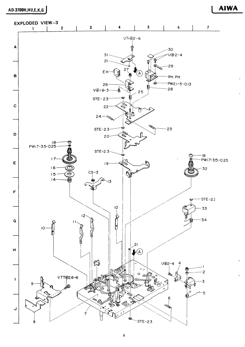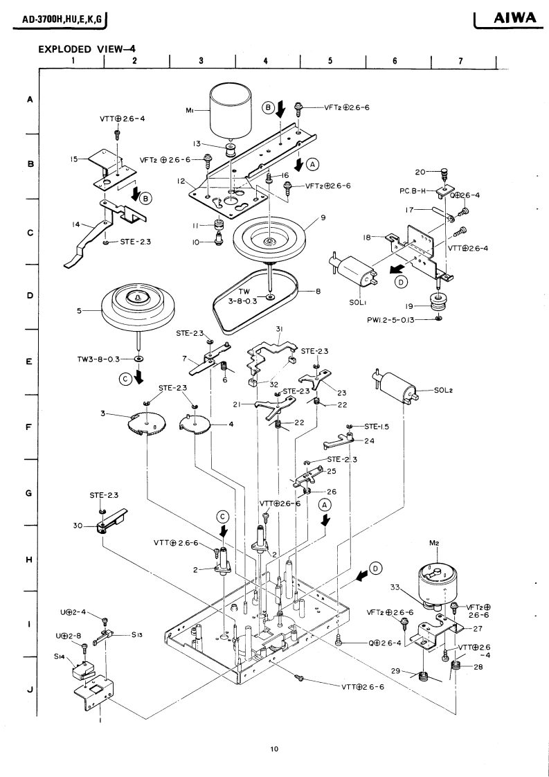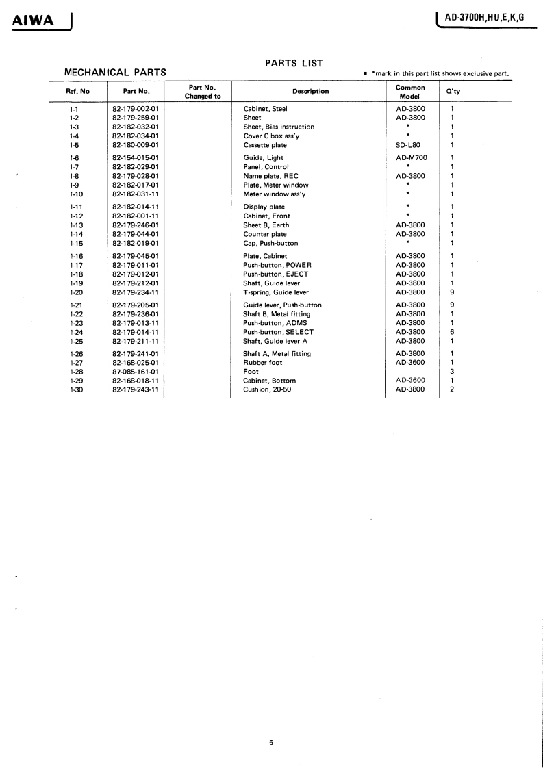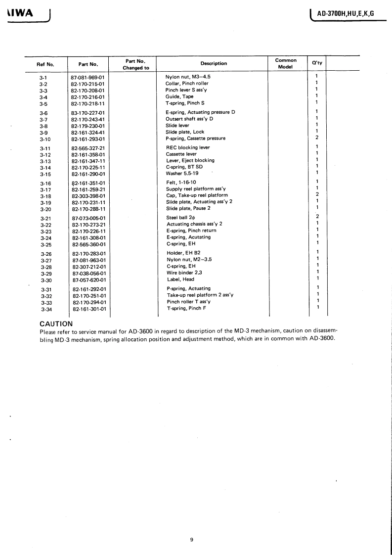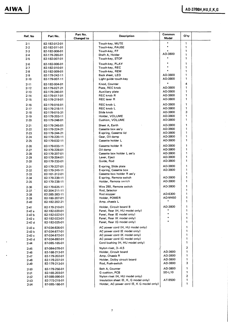 AsSERVICE MANUALMODEL NO.STEREO CASSETTE DECKAD-37O▣Code No.04-370-000-58TYPE.H,HU,E,K,GDATE OF ISSUE 3/1982SPECIFICATIONSSemiconductors:13 ICs,113 transistors,(WTD-A)More than 62/68 dB75 diodes,13 LED's(METAL,DOLBY NR B-type/C-type)Pow时r supply:H,HU modelMore than 62/68 dBAC120W/220V/240W(CrO:,DOLBY NR B-type/C-type)More than 60/66 dBswitchable 50/60 Hz(LH,DOLBY NR B-type/C-type)EmodelChannel separation:More than 30 dBAC220V,50/60Hz(1 kHz,0 VU)K,G modelCross talk:More than 60 dBAC240V,50/60Hz(1 kHz,0 VU)Power consumption:24WErasing ratio:More than 60 dBDimensions:420W)×110(H)×265(D)mm(135Hz,0VU+10dB)85 kHzWeight:5.1kgBias frequency:METAL2020.000HzTrack type:4 tracks 2 channelFrequency responseTape speed:4.8cm/s±1.5%20-19.000H2Less than 0.028%(WRMS)LH20~17.000HzWow an flutter:Full auto stopMotor:DC Servomotor for capstanAutomatic stop system:motor for reelsAutomatic shut-off action time:Less than 5s.Head:DX head (for Rec/Pb)Inputs:MIC max.sensitivity 0.3 mVPinch roller pressure:T350±30g(3.43±0.30N)S180±20g(1.76±020N)(200~10 ks suitable)50±10g-cm(0.49±0.098mN.mjLINE INTake-up torque:max.sensitivity50 mVFF&rewind torque:15o89-6m14788。0,294mN.ml(Optimum loadimpedance moreFF&rewind time:70±10s.(C-60)than 50 kn)Standard levelPlayback output:730±60mV(LINE)Outputs:LINE OUT0.55V(0VU1(TTA-161(Optimum loadPlayback noise:Less than 1.6 mV (CrO,)Less than 2.0 mV (METAL)impedance moreLess than 2.7 mV (LH)than 50 k)PHONES82Rec./PB output:0vut60。9。-40 mV (LINE到distortion:Less than 1.5%(METAL)Less than15%(Cr0,】Less than 1.5%(LH)Re:./Pb SN ratio:More than 50/54 dB(Unweighted)(METAL,DOLBY NR B-typeOFF/ON).Specifications and external appearance are subjoct to changeMore than 50/54 dB(CrO..DOLBY NR B-typewithout notice due to product improvement.OFF/ON)Noise reduction system manufactured under license from Dol byMore than 48/52 dBLaboratories Licensing Corporation.(LH,DOLBY NR B-typeDolby and the symbol are trademarks of Dolby LaboratoriesOFF/ON)Licensing Corporation.AIWA Co.,Ltd.Tokyo JapanA