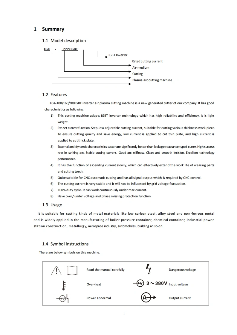 华远LGK-100-120-160-200IGBT-Plasma-Cutting-Machine-Manual含电器原理图找手册网16天前发布关注私信2.01MB27页025华远LGK-100-120-160-200IGBT-Plasma-Cutting-Machine-Manual含电器原理图此内容为付费资源,请付费后查看¥29¥31黄金会员免费钻石会员免费登录购买付费资源 第1页 / 共27页 第2页 / 共27页 第3页 / 共27页 第4页 / 共27页 第5页 / 共27页 第6页 / 共27页 第7页 / 共27页 第8页 / 共27页 试读已结束,还剩19页,您可下载完整版后进行离线阅读 THE END华远 文本预览 LGK-100/120/160/2001GBTPLASMA CUTTING MACHINEMANUALINSTRUCTION(PLEASE READ IT CAREFULLY BEFORE OPERATION) 查看更多 收起部分 喜欢就支持一下吧收藏