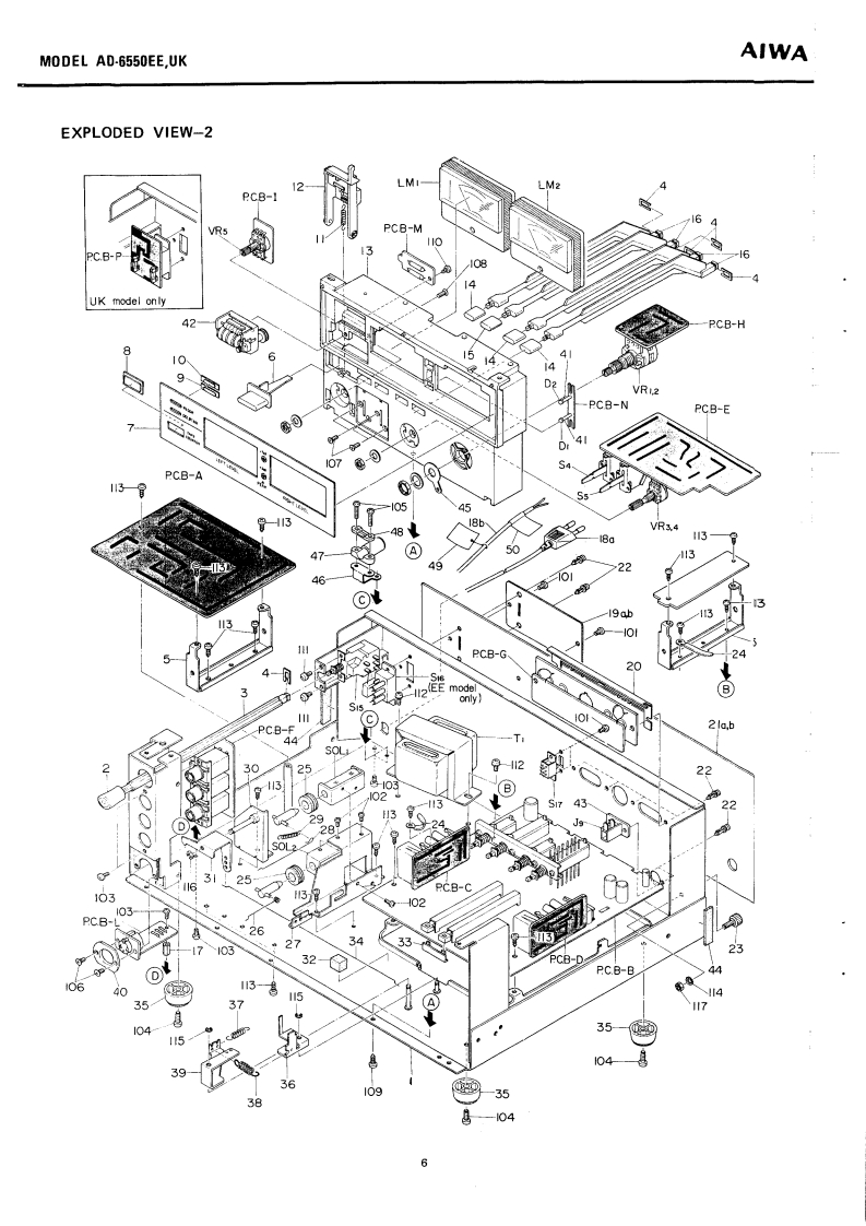 STEREO CASSETTE DECKWITH DOLBY NRSYSTEM形MODEL A□-655OEE,UKAIWA(SERVICE MANUAL】soSet using ISO screwsDATE OF ISSUE 26/7/1977SPECIFICATIONSSemiconductors:4 IC's,45 transistors,Bias frequency:100kHz±10kHz35 diodes 2 LED'sFrequency response:LH tape,20~15 kHz (-10 dB)Power source:AD-6550EE:AC110~120V/220-240V30-13kHz±3dB)(switchable)50/60 HzFe-Cr tape,20~17 kHz (-10 dB)AD-6550UK:AC120V/240V30-15kHz(±3dB)(switchable)50/60 HzCrO,tape,20~17 kHz (-10 dB)3015kHz(±3dB)Power consumption:10W(at Dolby off,Rec./pb)Dimensions:420W1×150H)×330(D)mmMotor:38 pulse FGWeight:7.5kgservo motorHead:Ferrite guard head (FGH)Track system:4-track 2-channel stereoInput:MIC:Max.input semsitivity 0.3 mVTape speed:4.76cm/sec.±1%(200 ~10 ks suitable)Wow flutter0.1%(According to DIN 45 500 Blatt 8)LINE IN:Max.input sensitivity 50 mVAutomatic shut-off(More than 50 k)action time:4±1ec.DIN:Max.input sensitivity 0.1 mV/ksPinch roller pressure:375±309(3 k)Take-up torque:50±10g-cmOutput:LINE OUT:Standard output levelFF rewind torque:125±25g-cm0.775V0VU1FF&rewind time:Less than 95 sec.(w/C-60 cassette)Playback output:1.05±0.05 V ILINE/bN)Optimum load impedancemore than 50 knTTA-161)DIN:Standard output levelPlayback noise:Less than 4.5 mV (LH)0.775V(0VU)Less than 3.0 mV (Fe-Cr,CrO,}Optimum load impedanceRec./pb output:0VU±0.5dB(LINE/DIN)more than 50 ks(400Hz0VU)PHONES:3.4mV(+3VU)Rec./pb distortion:Less than 2.0%(LH)Load impedance 8(400 Hz 0 VU)Less than 1.5%(Fe-Cr)Less than 3.0%(CrO.Rec./pb S/N:More than 43/45 dB(LH.DOLBY(400Hz0VU)OFF/ON)Un-WeightedMore than 45/48 dB (Fe-Cr,DOLBYOFF/ON)Specifications and external appearance are subject to changeMore thar45/48 dB (CrO,,DOLBYwithout notice due to product improvement.OFF/ON)Dolby Noise Reduction System is licensed from DolbyChannel separation:More than 28 dB (at 1 kHz 0 VU)Laboratories Incorporated.Cross talk:More than 65 dB (at 1 kHz 0 VU)The the"Double D"symbol are trademarksErasing ratio:More than 60 dB (400 Hz +10 VU)of Dolby Laboratories Incorporated.l