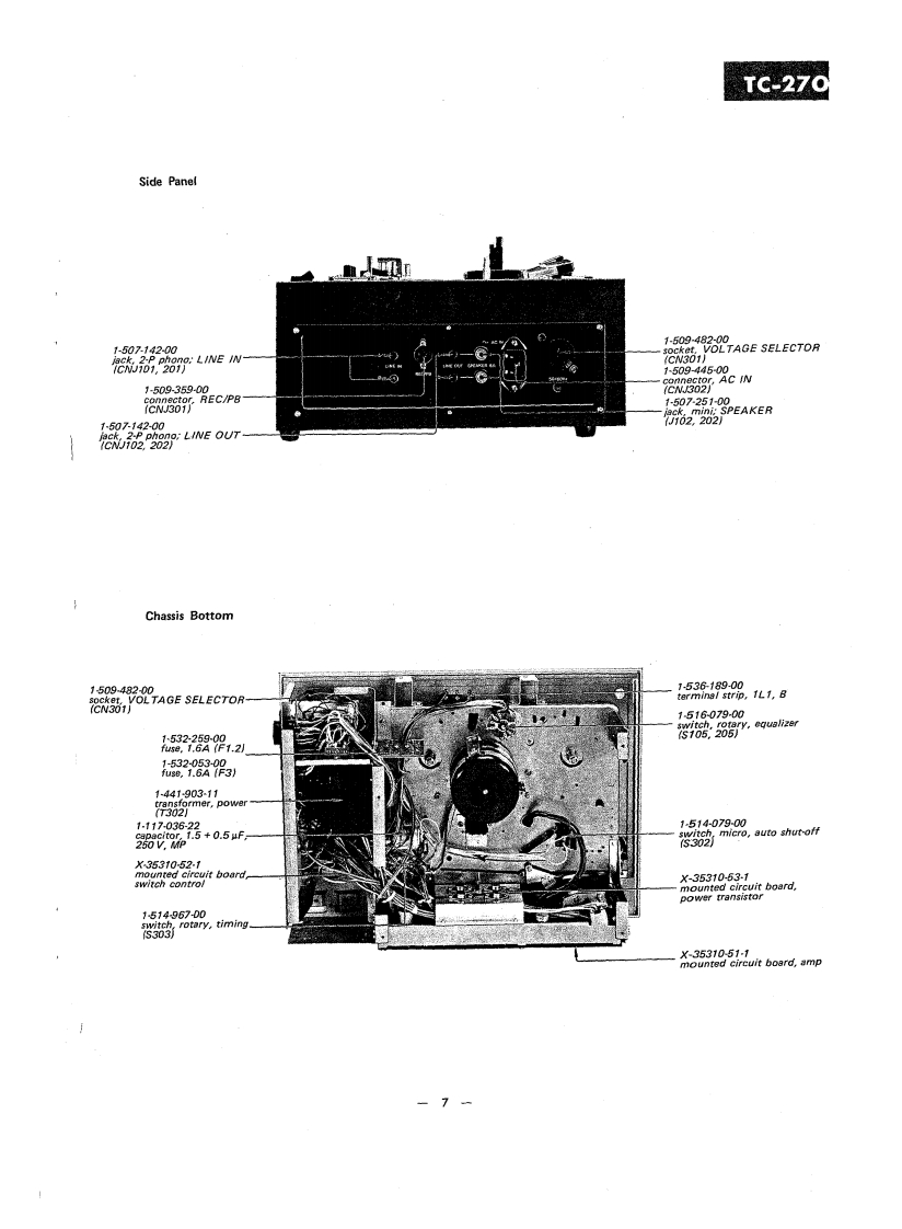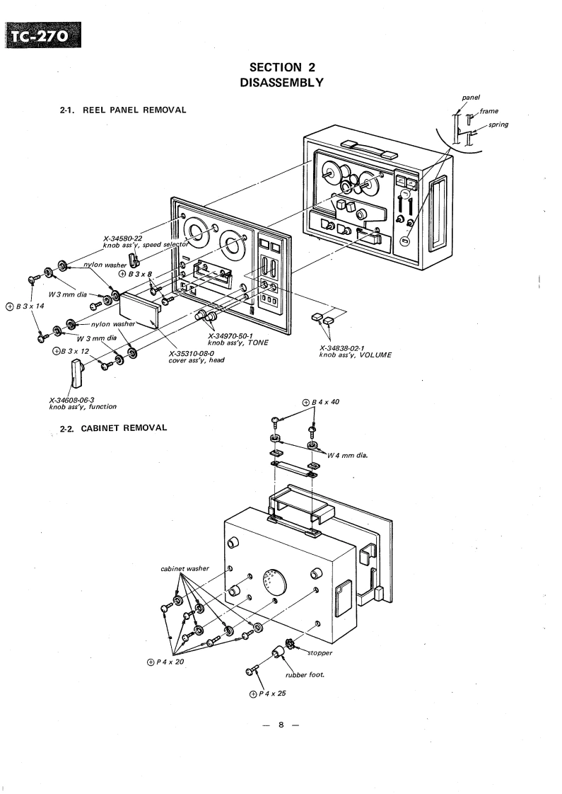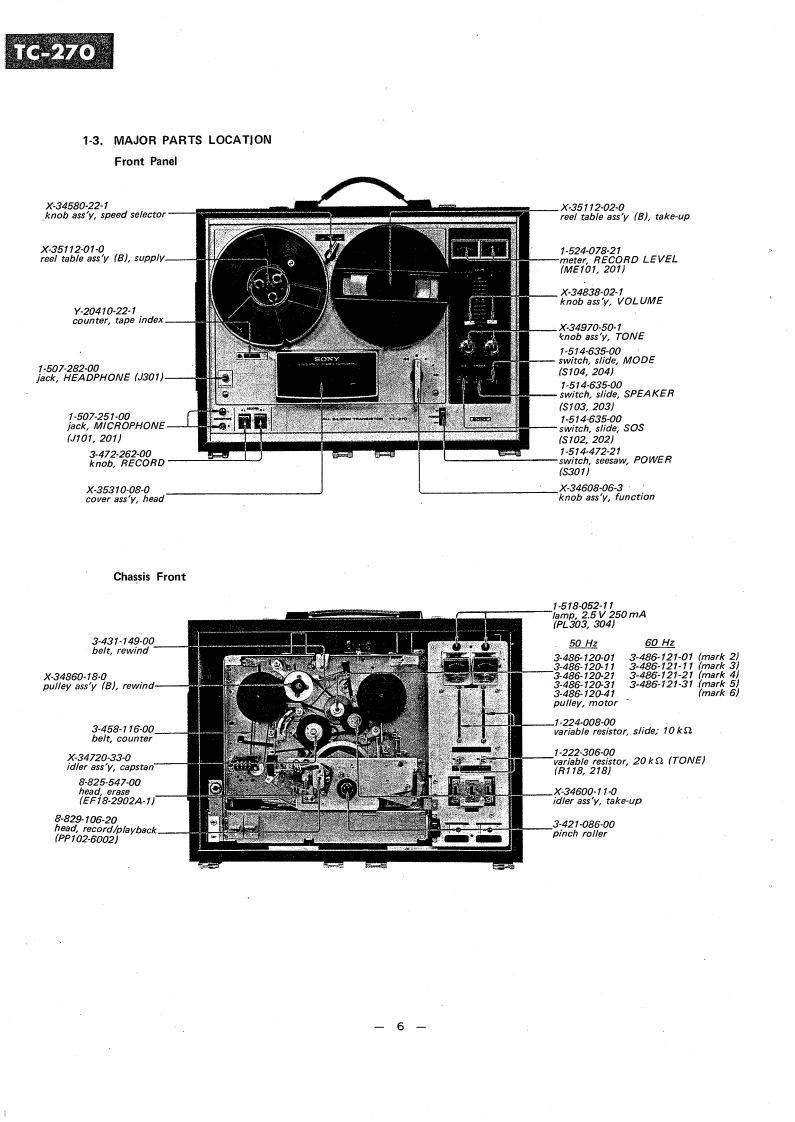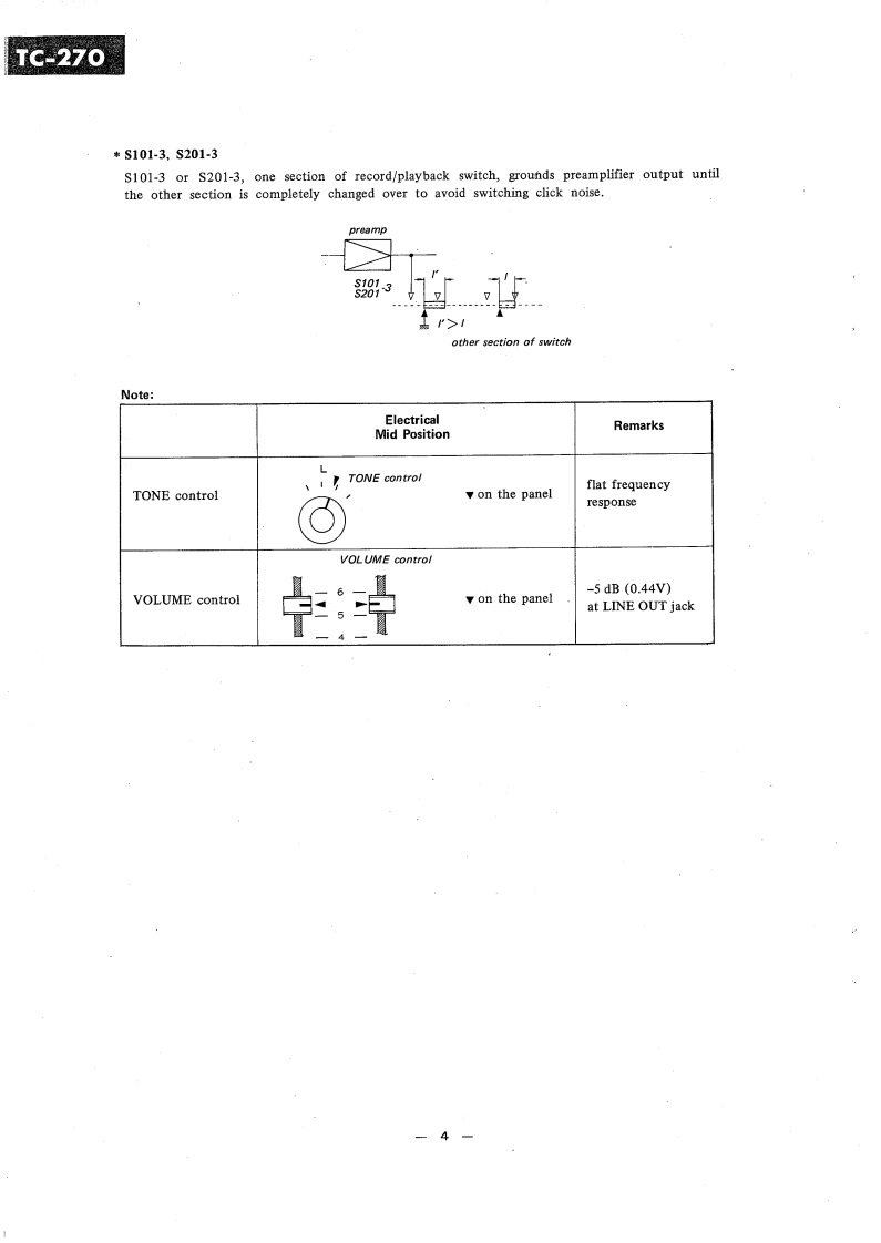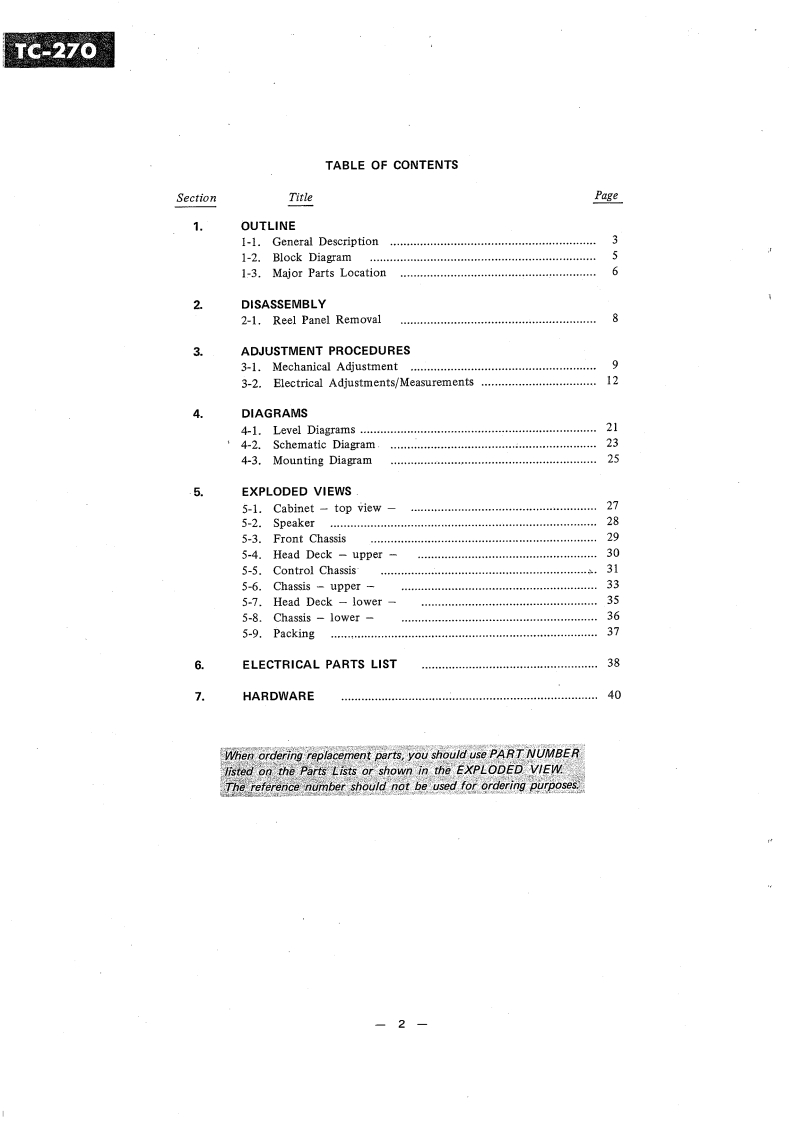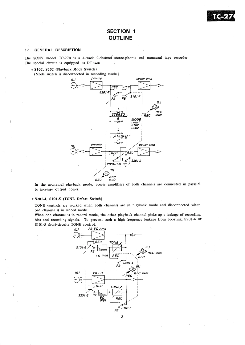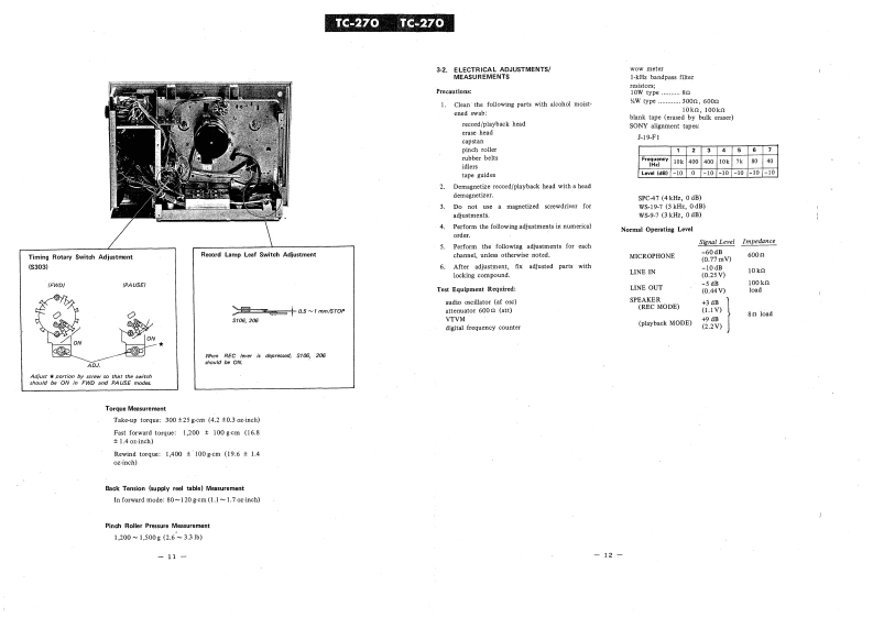 TC-270AEP ModelSTEREO TAPECORDERSPECIFICATIONSInputs:MICPower Requirements:2650/8,10v.127V.20v.mty:.9m7)Input impedance:55WREC/PB connectorTrack System:Four-track stereo and monoInput impedance:3.9 k ohms7"(18 cm)maximumInput level:17.4mv(-33dB)Reel Size:Tape Speed:712 ips,3%4 ips and 17s ipsOutputs:LINE OUTputs(19cm/s,9.5 cm/s and 4.8 cm/s)Load impedance:more than 10 k ohmsOutput level:-5dB(0,43V)Frequency Response:NABDINSPEAKER outputs30≈18,000Hz,30-16,000HzLoad impedance:8at 71/2 ips (19 cm/s)REC/PB connectorOutput impedance:80 ohms30~13,000Hz,4012500HzOutput level:0dB(0.775v)at 334 ips (9.5 cm/s)Headphone output30≈7.000HzLoad impedance:82at 17/8 ips (4.8 cm/s)Semiconductors:18 transistors and 4 diodesSignal-to-Noise Ratio:50dB or moreDimensions:201%6W×10%6(H)x15/4"(D)Wow and Flutter:NABDIN513×260×387mm】0.12%,0.18%Weight:36Ib 6oz(16.5 kg)at 71/2 ips (19cm/s)0.15%,0.25%at 33/4 ips (9.5 cm/s)0.2%at 17/8 ips (4.8 cm/s)Frequency:Approx.85 kHzPower Output:5W maximum per channelSONYSERVICE MANUAL