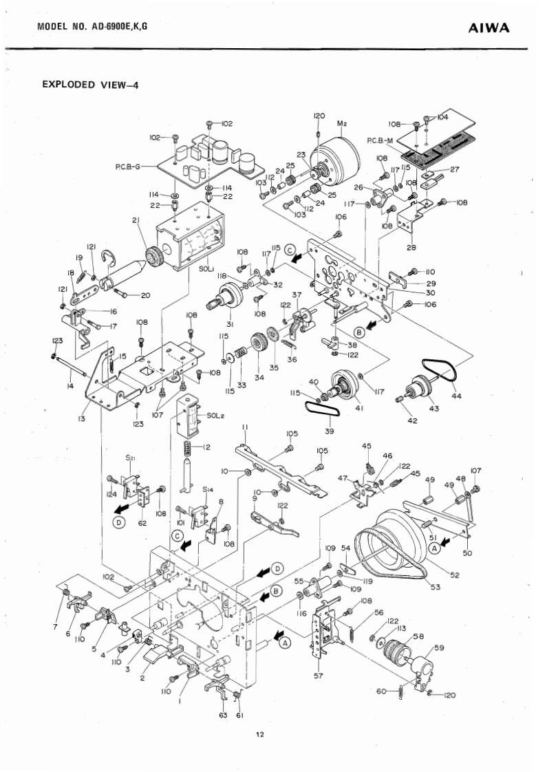 STEREO CASSETTE DECKWITH DOLBYNR SYSTEMMODEL NO.AD-69O▣E,KGAIWA(SERVICE MANUAL】三®®®日DATE OF ISSUE 9/1978SPECIFICATIONSSemiconductors:13IC's,171 transistors,82 diodes,Frequency response:LH type,20~16 kHz12 FET's 6 LED'sPower source:AC 110~120V/220V/240V (E model)2514kz(3d8)AC 120V/240V (K.G model)Power consumption:28chab1e50/60,S0Fe-Cr tape,20~20 kHz25~18 kHz dB)Dimensions:450(W0×120(H)×327ID)mmCrO,tape,20≈19kHzWeight:9.8kgTrack system:4-track 2-channel stereo25-17kz(号aB)Tape spe4.76cm/e405gMotor:38 pulse FG servo motor (for capstan)Wow flutter:Less than 0.04%(WRMS)at PbDC servo motorAutomatic stop system:Full auto-stopHead:V-cut conbination ferrite headAutomatic shut-off action time:[for Rec./Pb)2±0.50euble cap ferrite head (for Erasure)Pinch roller pressure:580+70Input:MICMax.input sensitivity-40g0.25mVTake-up torque:FF&rewind torque:50±10gcm(200 ~10 ks suitable)155±259cmLINE IN:Max.乐品ninactin5365±5s0c.《wlc-60 cassette】(More than 50 kn)DIN:Max,input sensitivityPlayback output:0.58±0.06V(LINE)0.25mv,50k1(TTA-161)Output柱LINE OUT;Standard output levelPlayback noise:Less than 3.5 mV (LH,DOLBY OFF)0.41V(0VU)(Un-Weighted)Less than 1.0 mV (Fe-Cr,CrO2,Optimum load impedanceDOLBY ON)More than 50 knRec./Pb output:0VU±1.0 dB (LINE)DIN:Standard400Hz0VU月Rec./P distorrtion:Less than 1.5%(LH)Optimum ioad impedance(400Hz0VU)Less than 1.0%(Fe-Cr)More than 50 knLess than 1.5%(CrO,)PHONES;8n~150nRec./Pb S/N:More than 40/45 dB LH,DOLBY(400 Hz 0 VU)OFF/ON)[Un-Weighted)More than 43/46 dB (Fe-Cr,CrO.DOLBY OFF/ON)Channel separation:More than 30 dB(1 kHz 0 VU)Cross talk:More than 60 dB(1kHz0VU】More than 60 dBVU meter display error:0VU±0.5dBSpecifications and external appearance are subject totoVU月change without notice due to product improvement.Peak meter display error:0VU+7d8)+7dB±1dB.Dolby Noise Reduction System is licensed from Dolby0VU-10dB)-10dB±1dBLaboratories Incorporated(0 VU-20 dB)-20 dB 12 dBThe name "Dolby"and the "Double D"symbol areBias frequency:105 kHztrademarks of Dolby Laboratories Incorporated.