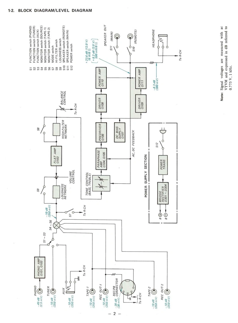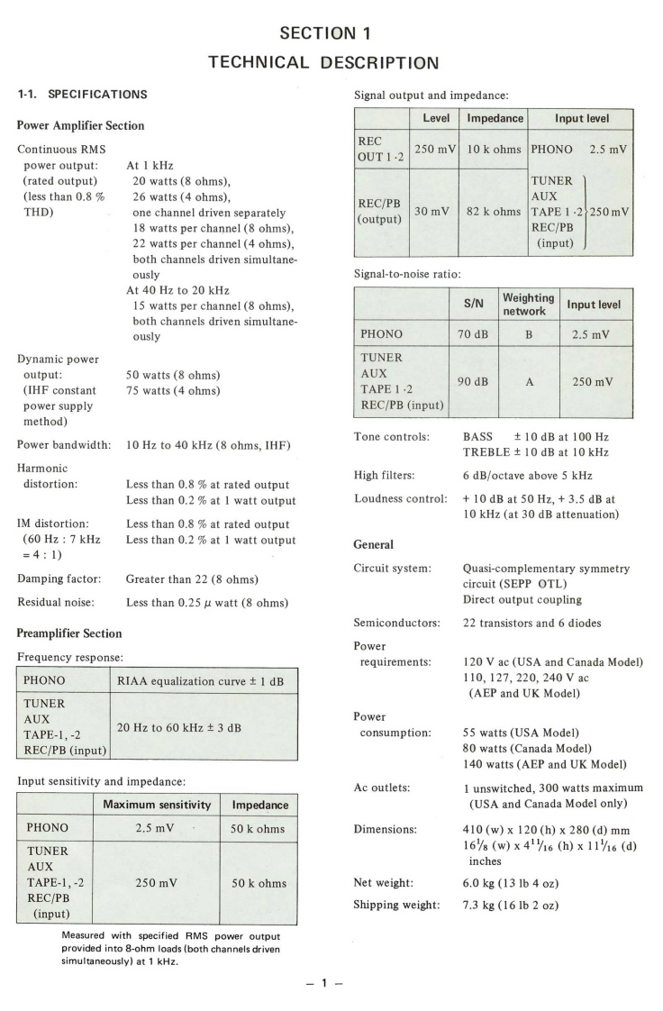 TA-1066USA,Canada.AEPand UK ModelINTEGRATED STEREOAMPLIFIERSPECIFICATIONSPOWER AMPLIFIER SECTIONInput sensitivityand impedance:PHONO2.5 mV,50 k ohmsContinuous RMSTUNERpower output:At 1 kHzAUX(rated output)20 watts (8 ohms).TAPE-1,TAPE-2250 mV,50 k ohms(less than 0.8 THD)26 watts (4 ohms)REC/PB (input)one channel drivenseparately18 watts (8 ohms)per channel.Signal output and22 watts(4 ohms)per channeloutput impedance:REC OUT250 mV,10 k ohmsboth channels driven simultaneouslyREC/PB (output)30 mV,82 k ohmsDynamic power output:50 watts (8 ohms)GENERAL(IHF constant power75 watts(4ohms】supply method)Power requirements:120 volts ac (USA and Canada Model)110,127,220.240 volts acPower bandwidth:10 Hz to 40 kHz (8 ohms,IHF)(AEP and UK Model)Harmonic distortion:Less than 0.8 at rated outputPower consumption:55 watts (USA Model)80 watts (Canada Model)IM distortion:Less than 0.8 at rated output140 watts (AEP and UK Model)(60Hz:7kHz=4:1)Dimensions:410(w)×120h)×280(d)mmPREAMPLIFIER SECTION16/8wl×46(h)×11h6(d)inchesFrequency response:PHONORIAA equalizationNet weight:6.0 kg (13 Ib 4 oz)curve±1dBTUNERAUX20 Hz to 60 kHzTAPE-1,TAPE-2±3dBREC/PB(input)SONYSERVICE MANUAL