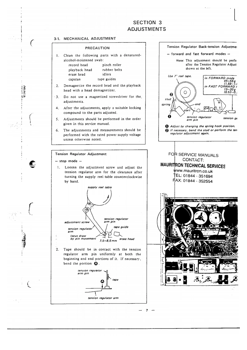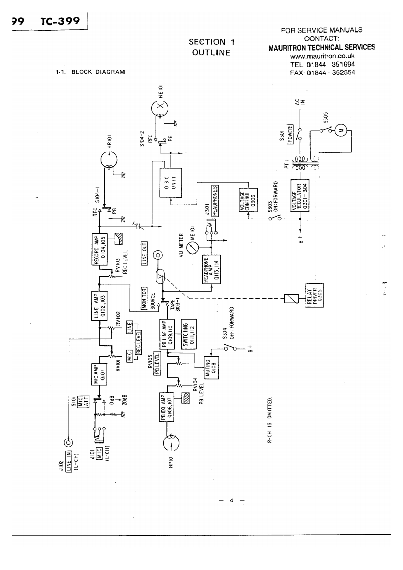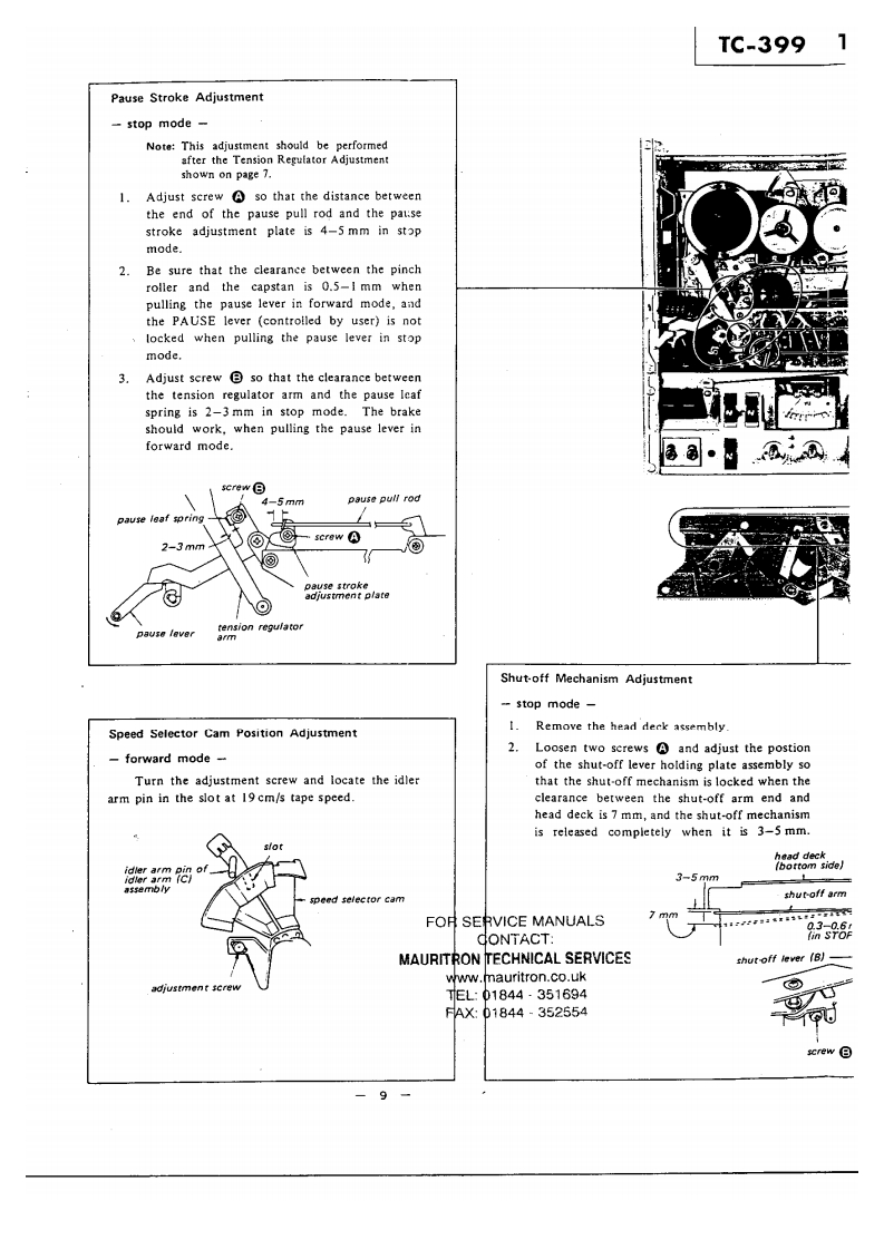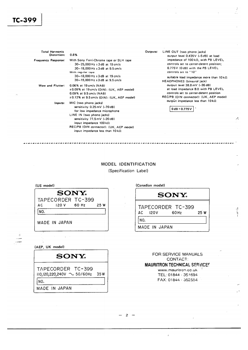 TG399US MiCanadian MotleUK MadeiAEP MTHE QUALITY OFTHIS MANUAL ISTHE BEST THATIS AVAILABLESTEREO TAPE DECKSPECIFICATIONSPower Requirements:120V ac,60 Hz (US,Canadian model)Track:4.track 2-channel stereo110V.120V.220V,240V,50/60HzTape Speed:(UK.AEP modell19 cm/s (7 ips).9.5 cm/s (33 ips!4.8 cm/s (17/8 ips)Power Consumption:25W [US.Canadian model)35W (AEP,UK model)Recording Time:With 550m tape,18 cm reelDimensions:415lwl×435h}×190Id1mrmStereo recording:90 min.at 19 cm/s1638(w)x 171/4 [h)x 7!(d)inchesMono recording:360 min.at 9.5 cm/sincluding projecting parts and controlsFast Winding Time:Approx.120 sec.with 370m tapeWeight:Approx.12.6kg (27 13oz)Rooi:18 cm or smaller(US,Canadian modellHeads:1 record head.1 playback head.Approx.12.9 kg (28 ib 7 ozlt erase head(UK.AEP model)Record Bias Frequency:160 kHzEqualization:NAB standard(US,Canadian model)JiS standard19cm/s.3,180u5+50μSFOR SERVICE MANUALS9.5cmWs,3,180μS+90uSCONTACT:(UK,AEP modellMAURITRON TECHNICAL SERVICESS/N Ratio:With Sony Ferri-Chrome Tape61 d8 at peak level (NAB]www.mauritron.co.uk58d8(D1N,1975rew.:51t:1251TEL:01844351694(UK.AEP model)FAX:01844·352554Continued on page 2SERVICE MANUAL