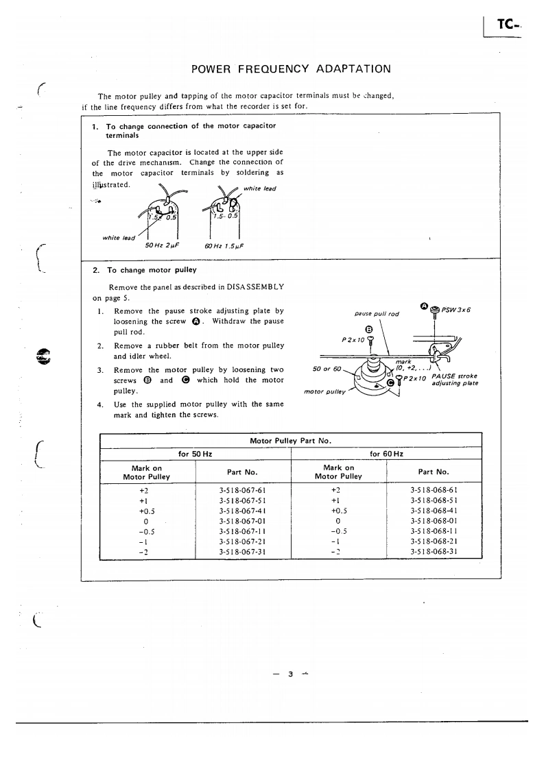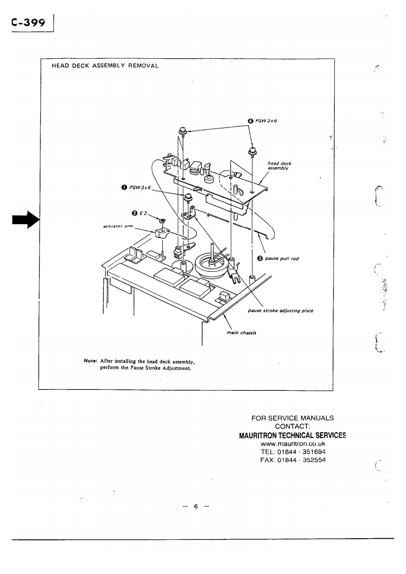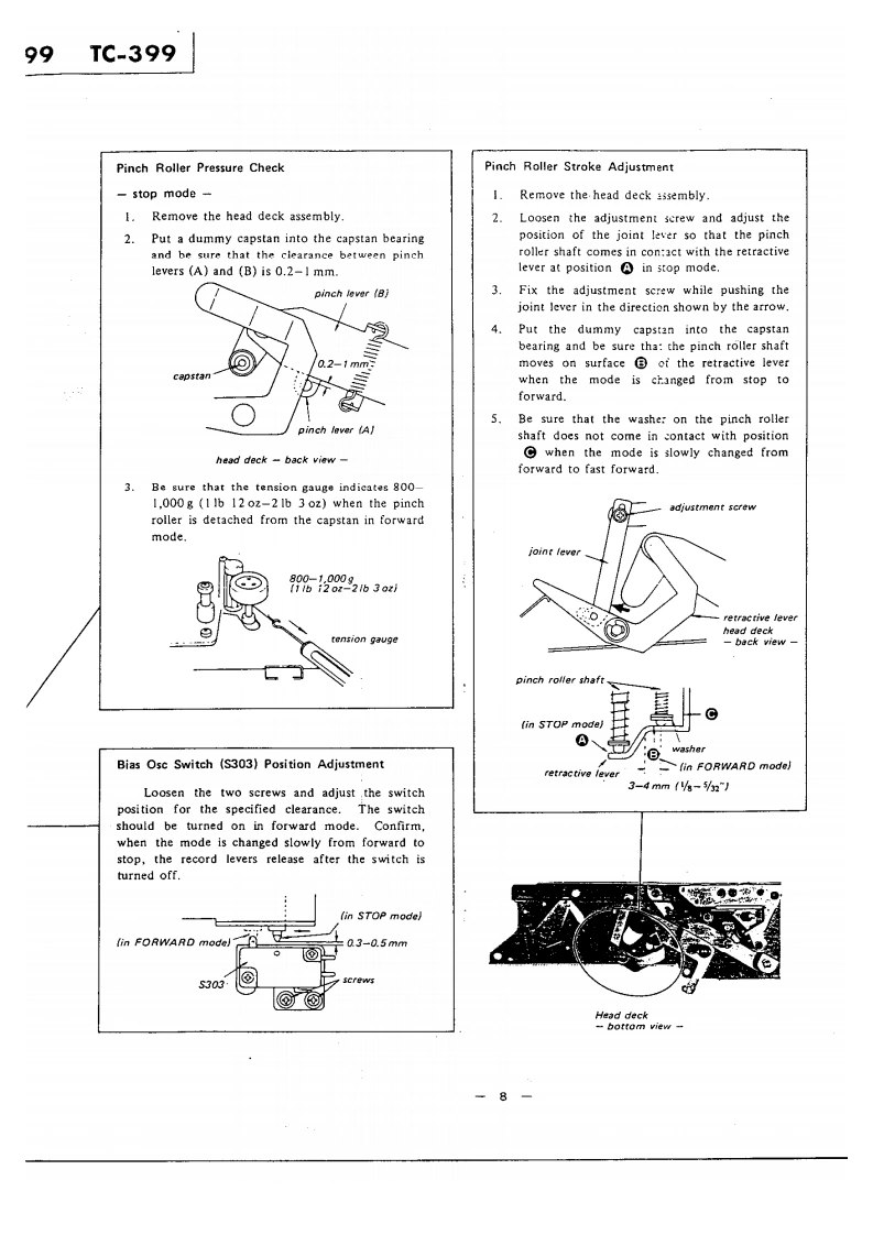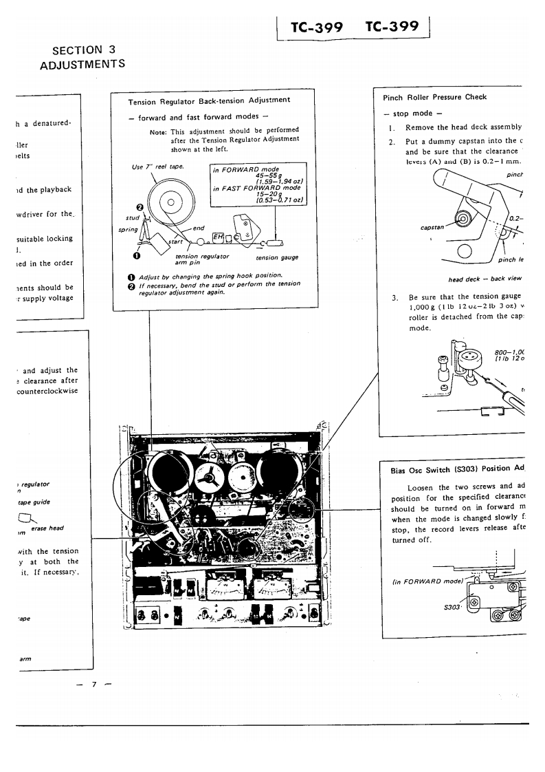 TG399US MiCanadian MotleUK MadeiAEP MTHE QUALITY OFTHIS MANUAL ISTHE BEST THATIS AVAILABLESTEREO TAPE DECKSPECIFICATIONSPower Requirements:120V ac,60 Hz (US,Canadian model)Track:4.track 2-channel stereo110V.120V.220V,240V,50/60HzTape Speed:(UK.AEP modell19 cm/s (7 ips).9.5 cm/s (33 ips!4.8 cm/s (17/8 ips)Power Consumption:25W [US.Canadian model)35W (AEP,UK model)Recording Time:With 550m tape,18 cm reelDimensions:415lwl×435h}×190Id1mrmStereo recording:90 min.at 19 cm/s1638(w)x 171/4 [h)x 7!(d)inchesMono recording:360 min.at 9.5 cm/sincluding projecting parts and controlsFast Winding Time:Approx.120 sec.with 370m tapeWeight:Approx.12.6kg (27 13oz)Rooi:18 cm or smaller(US,Canadian modellHeads:1 record head.1 playback head.Approx.12.9 kg (28 ib 7 ozlt erase head(UK.AEP model)Record Bias Frequency:160 kHzEqualization:NAB standard(US,Canadian model)JiS standard19cm/s.3,180u5+50μSFOR SERVICE MANUALS9.5cmWs,3,180μS+90uSCONTACT:(UK,AEP modellMAURITRON TECHNICAL SERVICESS/N Ratio:With Sony Ferri-Chrome Tape61 d8 at peak level (NAB]www.mauritron.co.uk58d8(D1N,1975rew.:51t:1251TEL:01844351694(UK.AEP model)FAX:01844·352554Continued on page 2SERVICE MANUAL