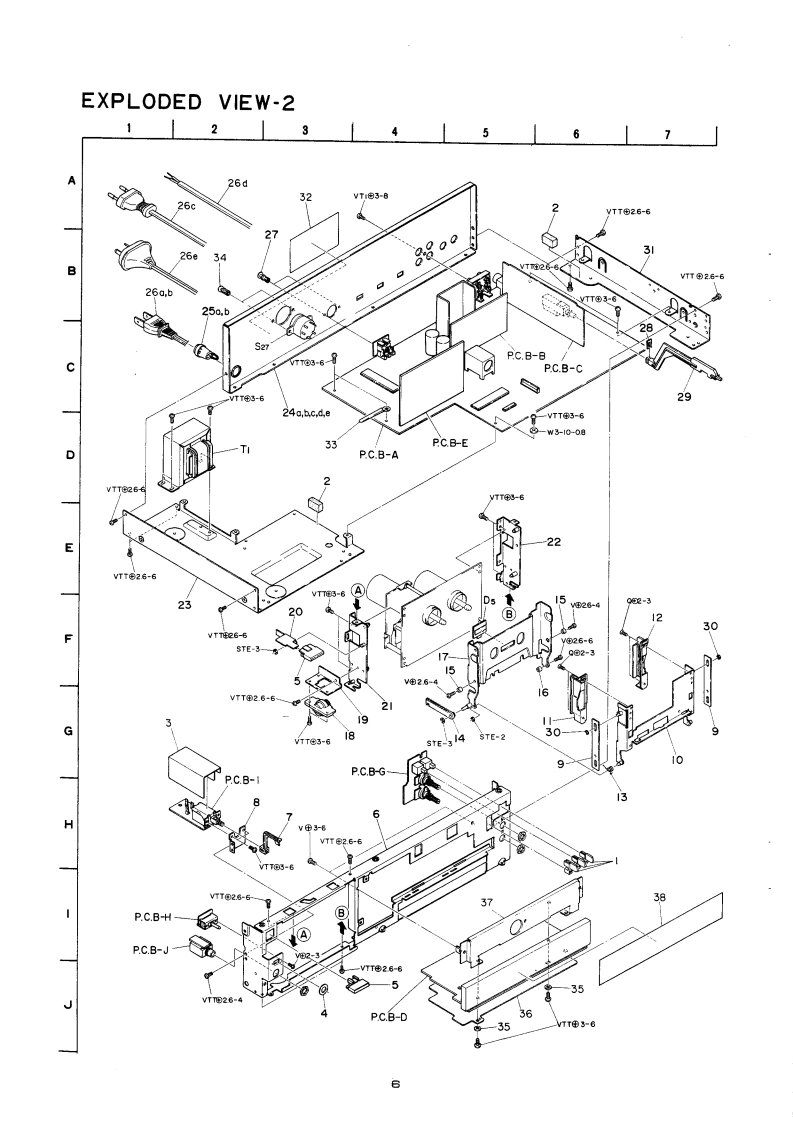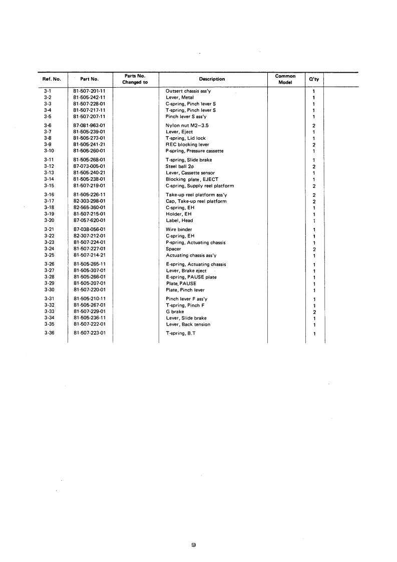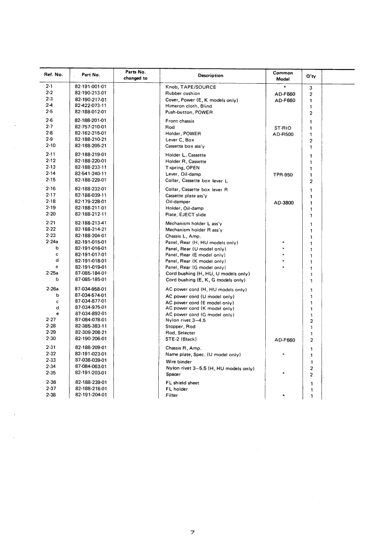 AIWA-00133AIWAS/M Code No.83-006DATE OF ISSUE 3/1983SERVICEMANUALMODEL N口.STEREO CASSETTE DECKA▣-F77OTYPE.H,HU,U,E,K,GFollow the instructions carefully,which will allow the user to optimise the products'performance and give many years of serivce.1.No scratch and melting shall be made to covered lead-wires of an 6.General instructions for mechanism repaira.c.primary circuit including mains leads.1)The heads,capstan and pinch roller shall be cleaned of good2.No illegibility shall be given to the specification plate,the cauquality alcohol after repaired,because dirty heads shall causetion labels,the fuse labels and others.distorted sounds while dirty capstan and pinch roller shall3.When.on pattern sides of circuit boards,additional repair-partsoccur wow/fiutter and take-up fault.have been made up,the parts shall be firmly glued to circuit2)Lubricants been stained the surfaces of transmitting portionboards or other components,unless the parts can be attachedof the belts,idlers,capstan and pinch roller shall be removed,firmly.because slippery and faulty tape travel shall be caused.4.The following matters shall be maintained as they are,when3)When oiling,only one or two drops shall be applied so asrepairing.not to run over and be dispersed.Note should be taken of the1)Soldering of lead-wire endsmetal fitting for the capstan and rotating portions of theCare should be taken of the space distance in an a.c.pri.idlers and pinch roller,especially.mary circuit as well as soldering.2)Wiring and holding of lead-wires with wire-clips and binders4)E-rings and poly slider washers shall be replaced with newones,if once those have been removed.-No re-utilization3)Materials of lead-wiresdue to unreliability.*e.g.:For UL models,lead-wires to be used shall be ap-5)Regular spare-parts shall always be used for repair,becauseproved or accepted by the UL.using irregular parts and tampering with the products shall4)Location of all kinds of insulatorscause deterioration,mulfunction and damage.5)Setting of voltage selector switch*Set the Voltage Selector Switch to 240V,220V,or 120V,According to your Local Voltage5.After repaired,the insulation resistance or leakage current shallbe measured with 500 5V D.C and shall be not less than 1Mg.Measuring PointConnect to Chassis or Outside of Pin JackRating More than 1M/500V DCPin Jack《e】AC Power Cord(⊕】