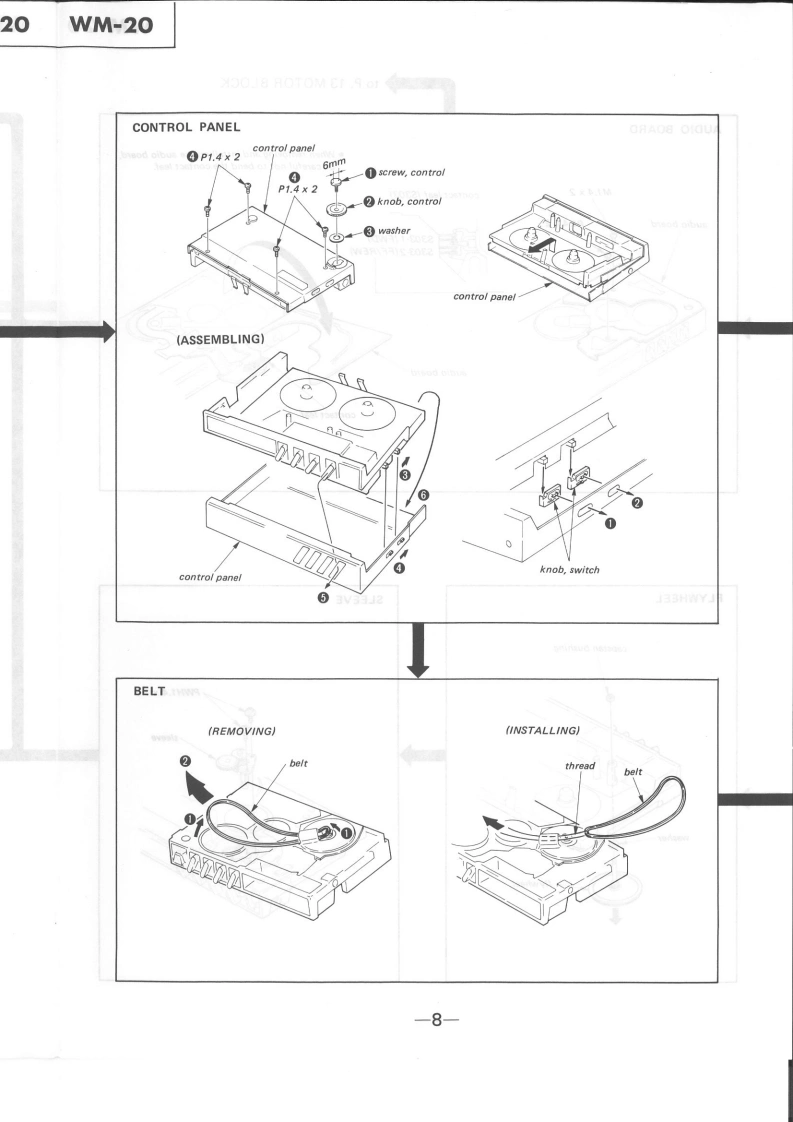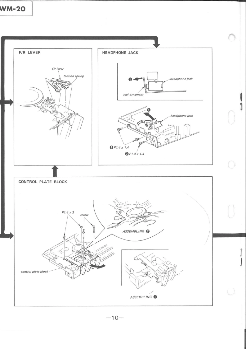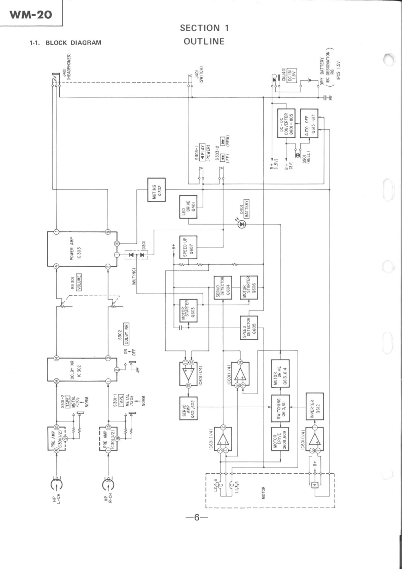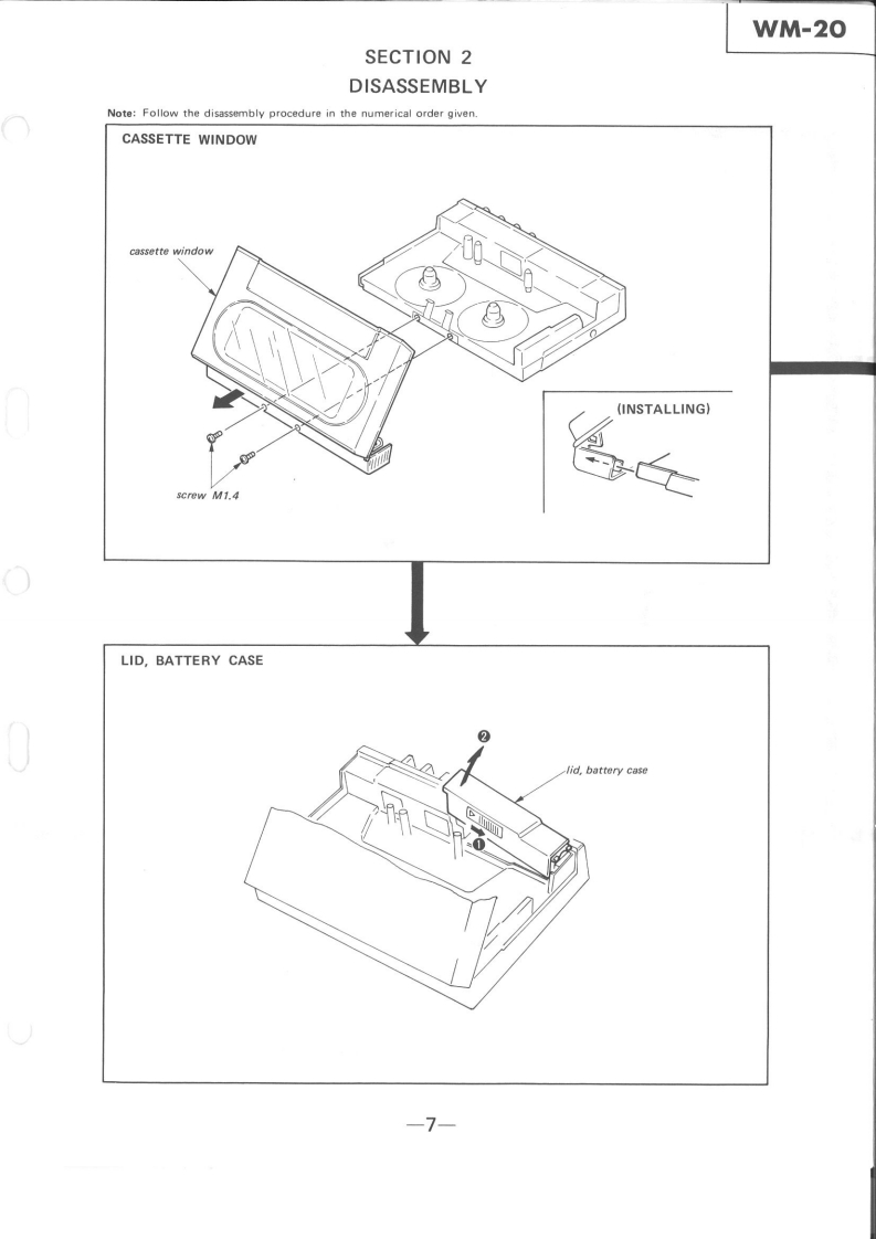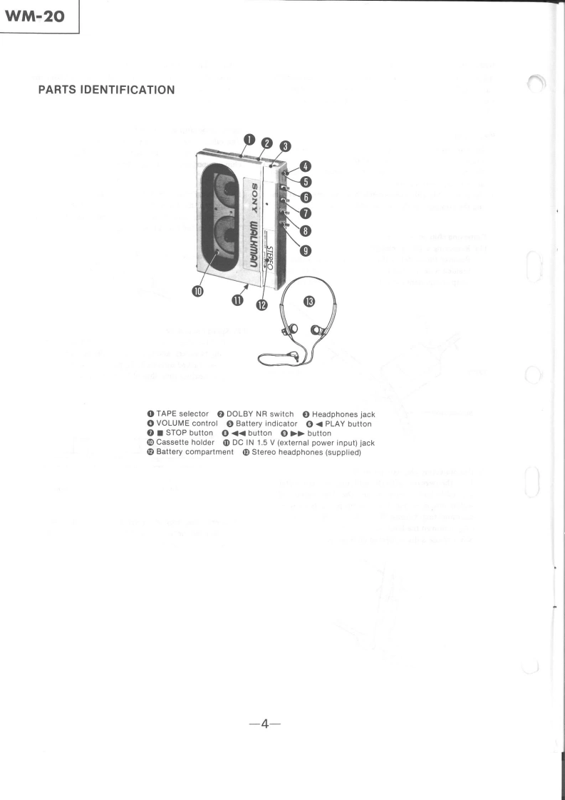 WM-20Refer to MDR-W30L Service Manual issued previouslySERVICE MANUALfor information of headphones supplied with this set.AEP ModelUK ModelE ModelSPECIFICATIONSTape track:4-track 2-channel stereoFast winding time:Approx.2 min.with Sony cassette C-60Frequency response IDOLBY NR OFF)Power output:5 mW x 2(max.)5 mW x 2 (at 10%harmonic distortion)at de operationPower requirements:1.5 V dcSize AA battery (IEC designation B6Extemal batteries (used in the optional battery case EBP.10%size AA (IEC designa.10n日5l¥2DC IN 1.5 V jack accepts:Sony AC-D1 ac power adaptor (optional)yor use on 120 V ac or Sony DCC-70 car battery cord (optional)for use with 12 V car battery.Battery life (continuous playback hourskApprox.2.5 hours with supplied Sony SUM-3 INS)New Super batteryApprox.5 hours with Sony Eveready AM3 alkaline batteryFor maximum performance we recommend the use of alkaline batteryDimensions:Approx 69.5 109.5 176 mm (w/h/d)2与,4,¥a inche5not incl.projecting parts and controlsWeight:Approx.180 g (6.4 oz)incl.battery.not incl.other accessones'Dolby'and the double-D symbol are the trade marks ofDolby Laboratories Licensing Corporation.Noise reductionsystem manufactured under license from Dolby LaboratoriesLicensing Corporation.STEREO CASSETTE PLAYERMICROFILMSONYTC