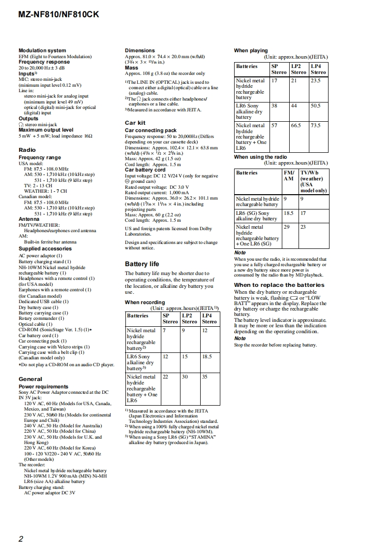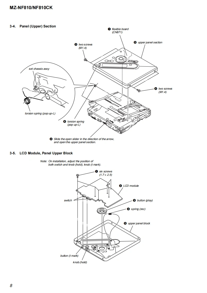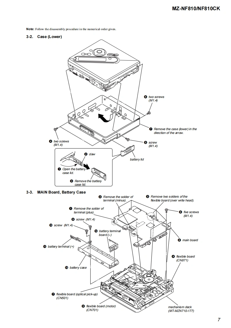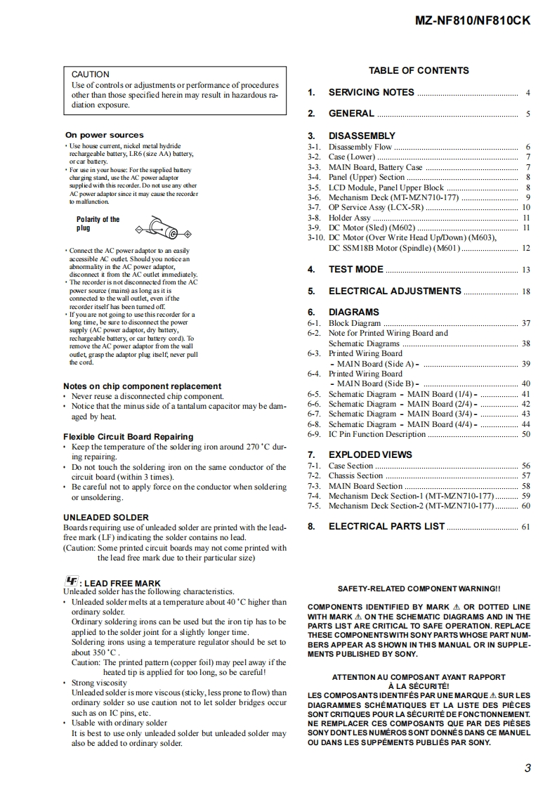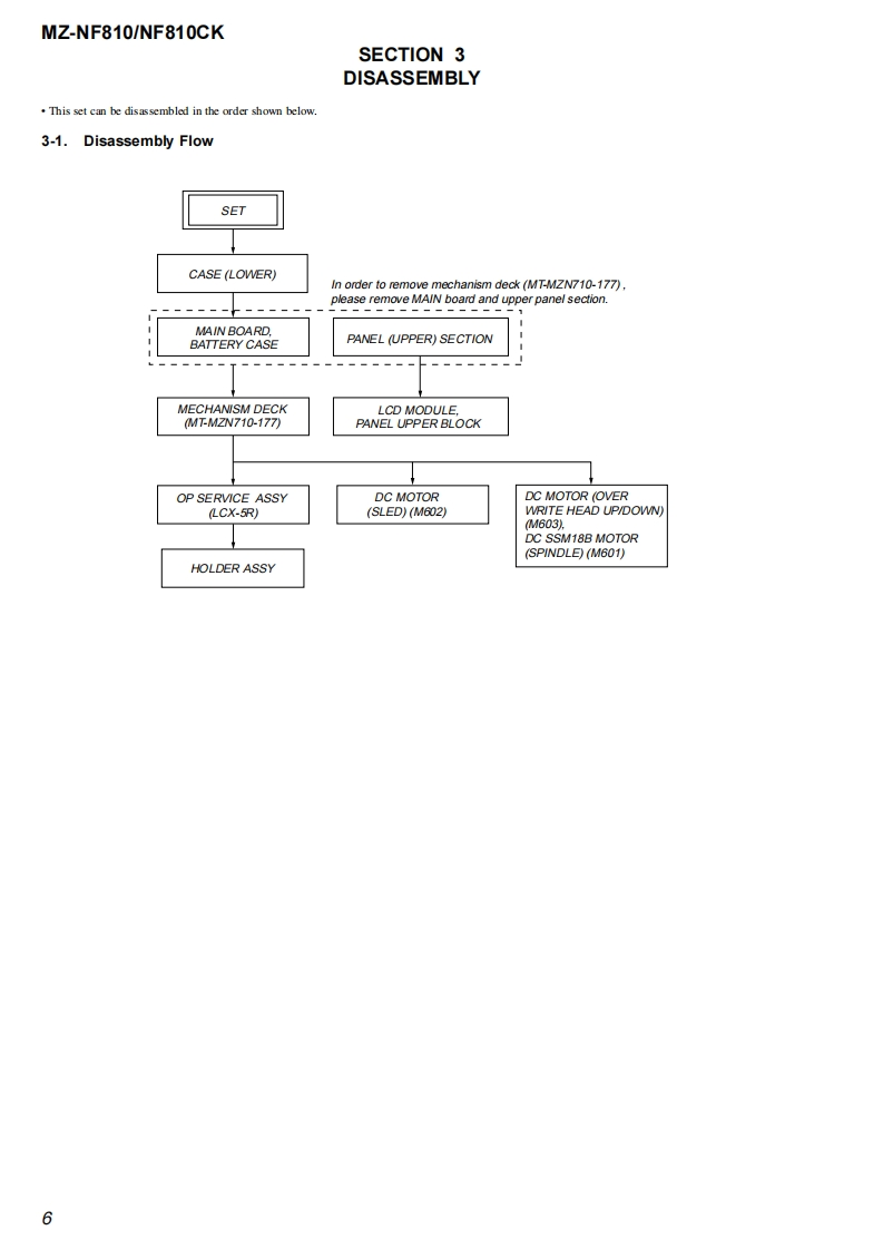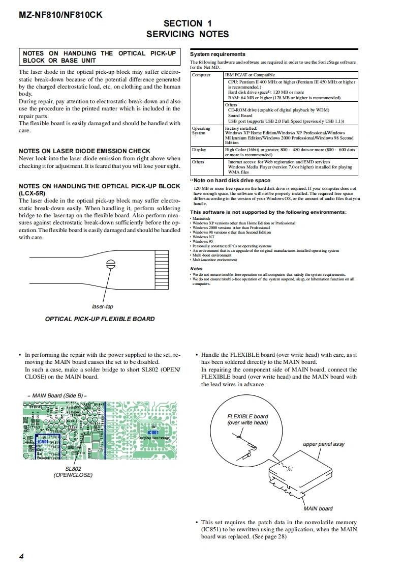MZ-NF810/NF810CKSERVICE MANUALUS ModelCanadian ModelVer1.02003.03MZ-NF810CKSONYAEP ModelUK ModelEModelAustralian ModelChinese ModelTourist ModelMZ-NF810Photo:MZ-NF810US and foreign patents licensed from DolbyModel Name Using Similar MechanismMZ-R410Laboratories.Mechanism TypeMT-MZN710-177Optical Pick-up NameLCX-5RSonicStage,OpenMG and the OpenMGlogo,MagicGate,Memory Stick and theMagicGate Memory Stick logo,Memory Stick and the Memory Sticklogo,Net MD and the Net MDlogo areSPECIFICATIONStrademarks of Sony Corporation.Microsoft,Windows,Windows NT andMD recorderWindows Media are trademarks orAudio playing systemregistered trademarks of MicrosoftMiniDisc digital audio systemCorporation in the United States and /orLaser diode propertiesother countries.Material:GaAlAsIBM and PC/AT are registeredWavelength:入=790nntrademarks of International BusinessEmission duration:continuousMachines Corporation.Laser output:less than 44.6uW(This output is the value measured at a distanceMacintosh is a trademark of Appleof 200 mm from the lens surface on the opticalComputer,Inc.in the United States and/pick-up block with 7 mm aperture.)or other countries.Recording and playback time (whenMMX and Pentium are trademarks orusing MDW-80)registered trademarks of IntelMaximum 160 min in monauralCorporation.Maximum 320 min.in LP4 stereoRevolutions380 rpm to 2.700 rpm (CLV)Error correctionACIRC (Advanced Cross Interleave ReedSolomon Code)Sampling frequency44.1 kHzSampling rate converterInput:32 kHz/44.1 kHz/48 k HzCodingATRAC (Adaptive TRansform AcousticCoding)ATRAC3一LP2/LP4Continued on next page-PORTABLE MINIDISC RECORDER9-877-145-01Sony Corporation2003C167800-1Personal Audio Company©2003.03Published by Sony Engineering CorporationSONY