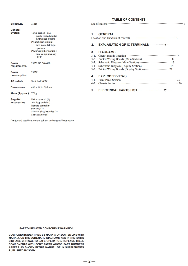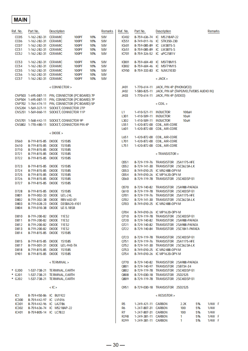 STR-DE515SERVICE MANUALAEP ModelUK ModelManufactured under license from Dolby LaboratoriesLicensing Corporation.DOLBY,'PRO LOGIC'and the double-D symbolare trademarks of Dolby Laboratories LicensingCorporation.SPECIFICATIONSAmplifier sectionOutputsTAPE/MD REC OUTUsable112dB£1uVPower outputVoltage 150mV,sencitivity/75ohms (IHF)Stereo mode(DIN IkHz,4ohms)Impedance:10kilohms110W+110WVIDEO AUDIO OUT:S/NMono 76dBVoltage 150mV,Stereo 70dBSurround(DIN IkHz,4ohms)Impedance:10 kilohmsmodeFront:90W/chWOOFERHarmonicMono 0.3%Center 90WVoltage 2Vdistortion atStereo 0.5%Rear:Impedance:10kilohms1kHz(DIN IkHz,8ohms)PHONES Accepts low30Wchand high impedanceSeparation45dB at 1kHzheadphonesFrequencyPHONO:RIAAFrequency30Hz-15kHz*5 dBresponseequalization curveMutingFull muteresponse±0.5dBTV/LD,CD,TAPE/MD,BASS BOOST+10dB at 70HzSelectivity60dB at 400kHzVIDEO,5.1/DVD:10Hz-50kHz±1dBTONE±8dBat100 Hz andAM tuner section10kHzTuning range522-1611kHzInputsSensitivity Impedance S/NFM tuner sectionAerialLoop aerial(weightingTuning range87.5-108.0MHznetwork.Usable50dB/m (at 999kHz)input level)Aerial terminalss 75ohms,unbalancedsensitivityPHONO2.5mV5074dB(MM)Kilohms72dB**SensitivityMono:183dBE2.2μVS/N54dB (at 50m V/m)(A,2.5mV)/75ohmsStereo:383dB£22.5uVCD,Harmonic0.5%(50mVm,200mV/75ohmsdistortion400Hz5.1/DVD502日TAPE/MD,Kilohms82B本本本150mVTV/LD,(A,150mV)-Continued on next page-VIDEO***78HFFM STEREO/FM-AM RECEIVERMICROFILMSONY