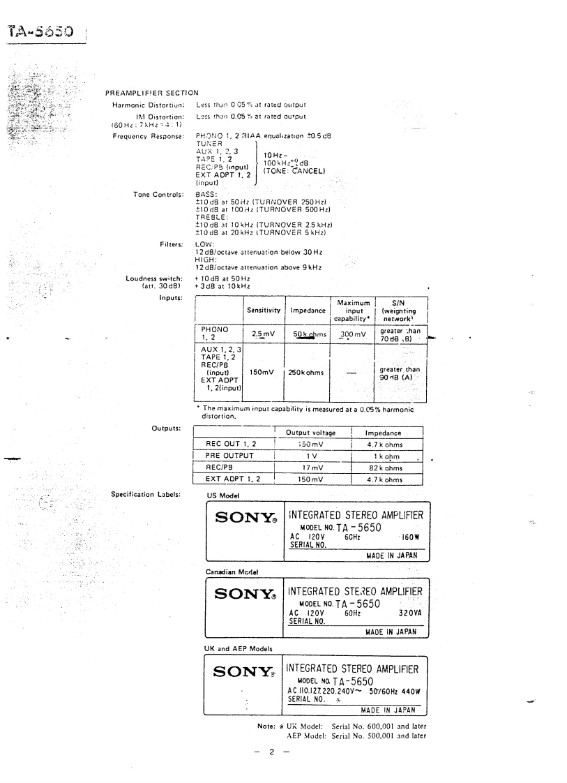 US Mode:Canadian ModeUK MiodelAEP MiodelP162669Discard TA-5650 service manual previouslyissued for UK and AEP Models.This service tnanual contaias former information.INTEGRATED STEREO AMPLIFIERSPECIFICATIONSGENERALHarmonic Distortion:Less than 0.1%at rated outputPower Requirements:120V ac,50 Hz (US,CanadianLess than 0.08%at 1 w outputModel)110.127.220 or 240V ac adjustableLess than .1%at ratea outputLess than 0.08%at 1 W cutput50/60 Hz (UK and AEP ModeilFrequency Response2Hz-1儿kHzt9dBPower Consumption:160W [US Model;[at 1 W output):320 VA (Canadian Model]440W (UK.AEP Model]S/N Ratio:Greater than 110 dB.short-circuitedinputDimensions:Ap0r0×.460wl×168(hix323(dmm18/s(w)x 65/s(hi x 124(dlResidual Noise:Less than0.02W【82inchesDamping Factor:50{82.3t1kHz引Including projecting partsand controlsInputs:POWER INPUTWeight:Approx.13.4 kg.29 Ib 9 oz (net)8eeumpAs565edApprax.16 kg.35 1b 4 oz (in shippirgOutputs:SPEAKER terminals A.BcartonlAccept speakers of 4 or morePOWER AMPLIFIER SECTIONHEADPHONES iackCentinous RMSAccepts low-and high-impedancePower Outout:A:1 kHzstereo headphones(less than 0.1 THD.60+6,w(gIboth channels driven50+JW(4simuitaneously】At 20Hz-20kHzcontinued on page 2-50+50w8according to DIN 4550055·55w{8Dynamic Puwer0d8=0.775VOutput:160w182b[IHF constant power140w4supply method)Power Bindwidth[IHF):5-40.000HzSONYTHE QUALITY OFTHIS MANUAL ISTHE BEST THATSERVICE MANUALIS AVAILABLE