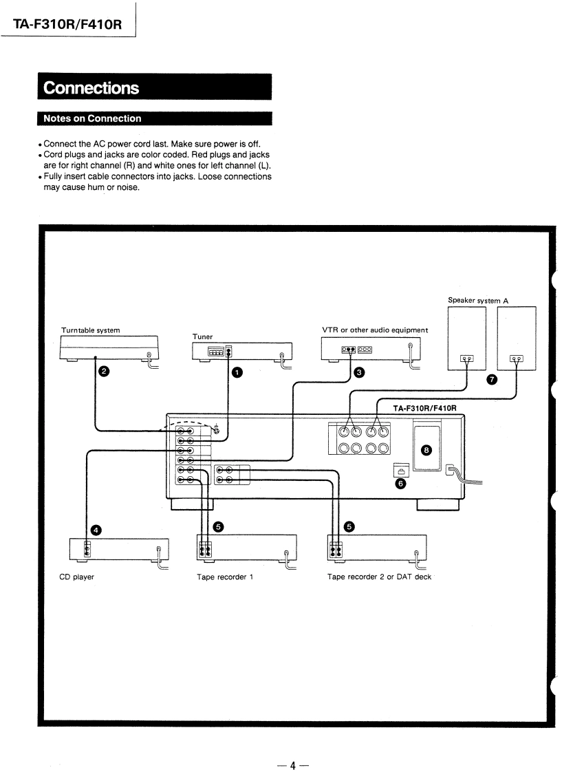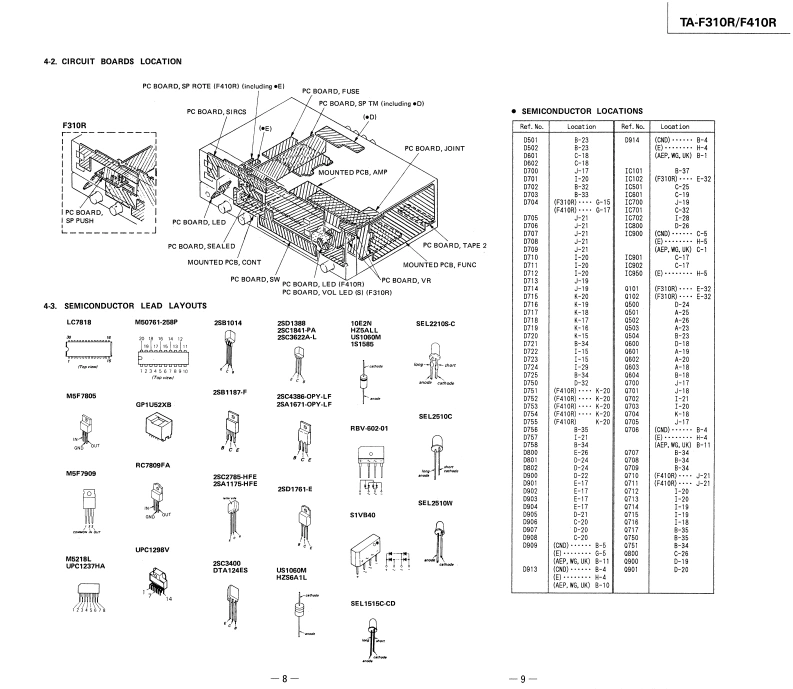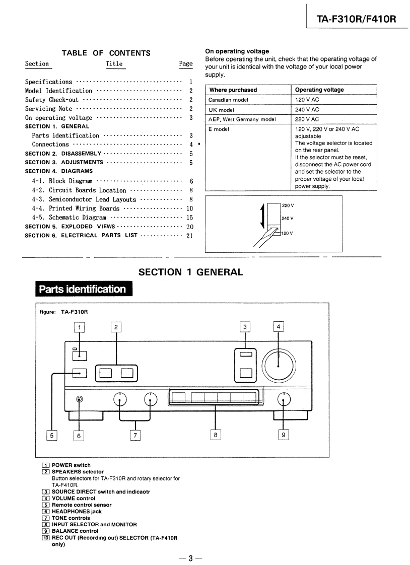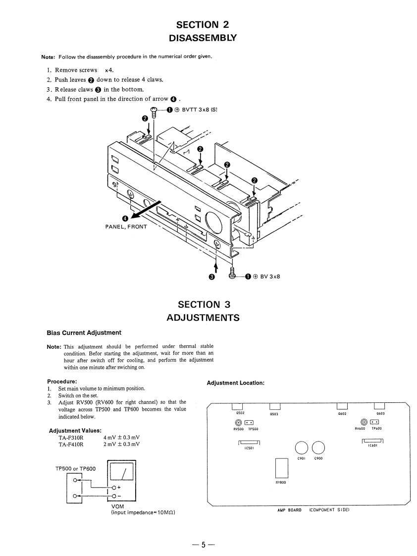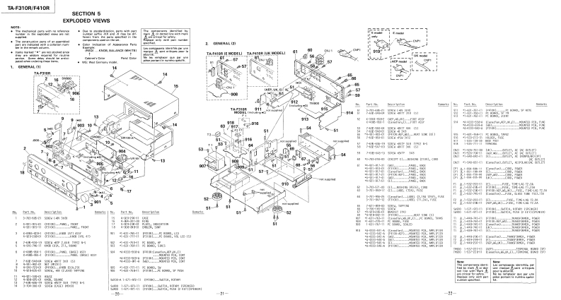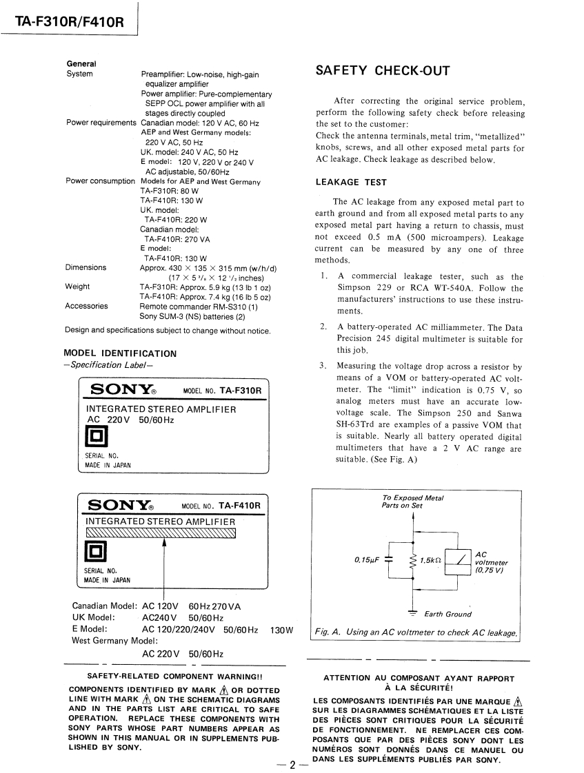 TA-F310R/F410RSERVICE MANUALAEP ModelTA-F310RCanadian ModelAEP ModelUK Model4EModelTA-F410Rphoto:TA-F410RSPECIFICATIONSAmplifierOutputContinuous RMS power output (both channels drivenOutput jackJack typeVoltage/impedancesimultaneously)REC OUTPhono jacksVoltage 150 mVAEP,West Germany models:Impedance 1 kohmsTA-F310RTA-F410RSPEAKERSAEP,West Germany modelsDIN,1 kHz4ohms40W+40W70W+70WAccepts speakers of4-16 ohms.8 ohms29W+29W50W+50WCanadian,UK and E models20 Hz-20 kHz4 ohms27W+27W45W+45WAccepts speakers ofTHD0.05%8-16 ohms.8 ohms24W+24W35W+35WHEADStereoAccepts low and highPHONESphone jackimpedance headphones.Canadian,UK and E models:TA-F410RTone controlsDIN,1kHz70W+70WResponseTurnover frequency20 Hz-20 kHz8 ohm onlyBASS±8dB(100Hz)500Hz50W+50WTHD0.05%TREBLE±8dB(15kHz)3 kHzInputInput jackJack typeSensitivityImpedanceS/N (weighting network,input level)PHONOMMPhono2.0mv50 kilohms70dB(A.2m0TUNER,CD,VIDEO/AUX,TAPE 1,Phono150mW50 kilohms100dB(150mV0TAPE 2/DATHarmonic distortionTA-F310R and TA-F410R UK,AEP and West Germany models:Residual noiseLess than 170 uV(network A)Less than 0.7%at rated outputDamping factor40 (8 ohms,1 kHz)Other TA-F410R models:Less than 0.05%at rated outputIntermodulation (IM)distortion(60 Hz:7 kHz =4:1)-Continued on page 2-Less than 0.05%at rated outputFrequency responseINTEGRATED STEREO AMPLIFIERPHONO:RIAA equalization curve±0.5dBTUNER,CD,VIDEO/AUX.TAPE 1,TAPE 2/DAT:7 Hz-100 kHz =3 dBSONY