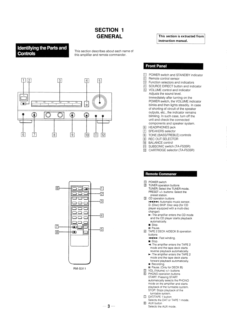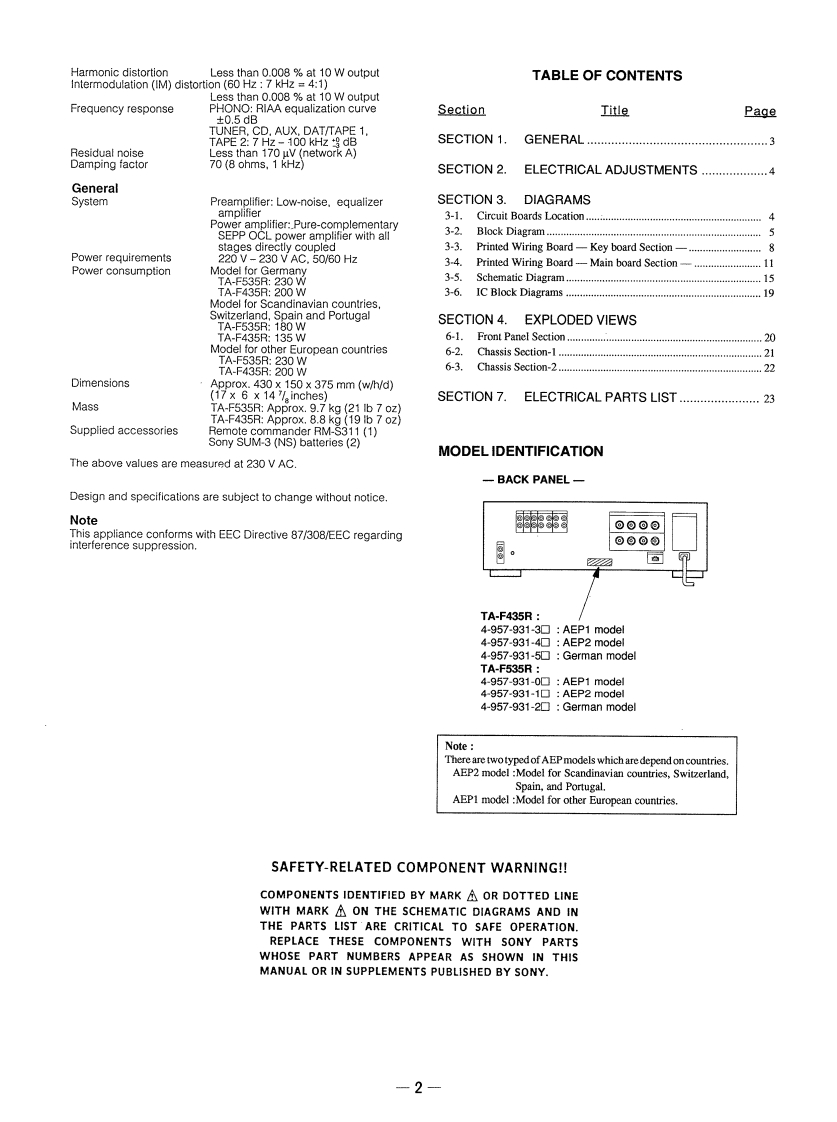 TA-F435R/F535RSERVICE MANUALAEP ModelPhoto TA-F535RSPECIFICATIONSAmplifierS/NContinuous RMS power output(both channels drivenTA-F535RTA-F435Rsimultaneously)Model for GermanyPHONO (MM)94 dB94 dBTA-F535RTA-F435RPHONO (MC)76 dBDIN,1kHz4ohms110W+110W85w+85WTUNER,CD.AUX.103dB103dBDAT/TAPE 18 ohms90W+90W80W+80WTAPE 220H2-204ohms80W+80W75W+75W"PHONO(MC):only for TA-F535RkHz8 ohms 75 W+75 W65W+65WOutputOutput jackJack typeVoltage/impedanceModel for Scandinavian countries.Switzerland,Spain and PortugalREC OUTPhone jackVoltage 150 mV Impedance 1TA-F535RTA-F435RkohmDIN,1 kHz 8 ohms85W+85W75W+75WSPEAKERSModel for Scandinaviancountries,Switzerland,Spain20Hz-208 ohms70W+70W0W+60Wand PortugalkHz8-16 ohmsModel for other countrieseconrieTA-F535RTA-F435RHEADPHONESStereophoneAccepts low and highDIN.1 kHz 4 chmsh10W+110W85W+85Wjackimpedance headphones8 chms90W+90W80W+80WTone controls20Hz-204 ohms80W+80W75W+75WResponseTurnover frequencykHz8 ohms75W+75W65W+65WBASS±7dB(100Hz)300HzTREBLE±6dB(10kHz)5 kHzInputInput jackJack typeSensitivityImpedancePHONO(MM)Phono2.0mv50 kilohmsContinued on next pagePHONO(MC)Phono0.25mV100 ohmsTUNER,CD,AUXPhono150mW50 kilohmsDAT/TAPE 1TAPE 2INTEGRATED STEREO AMPLIFIERSONY
