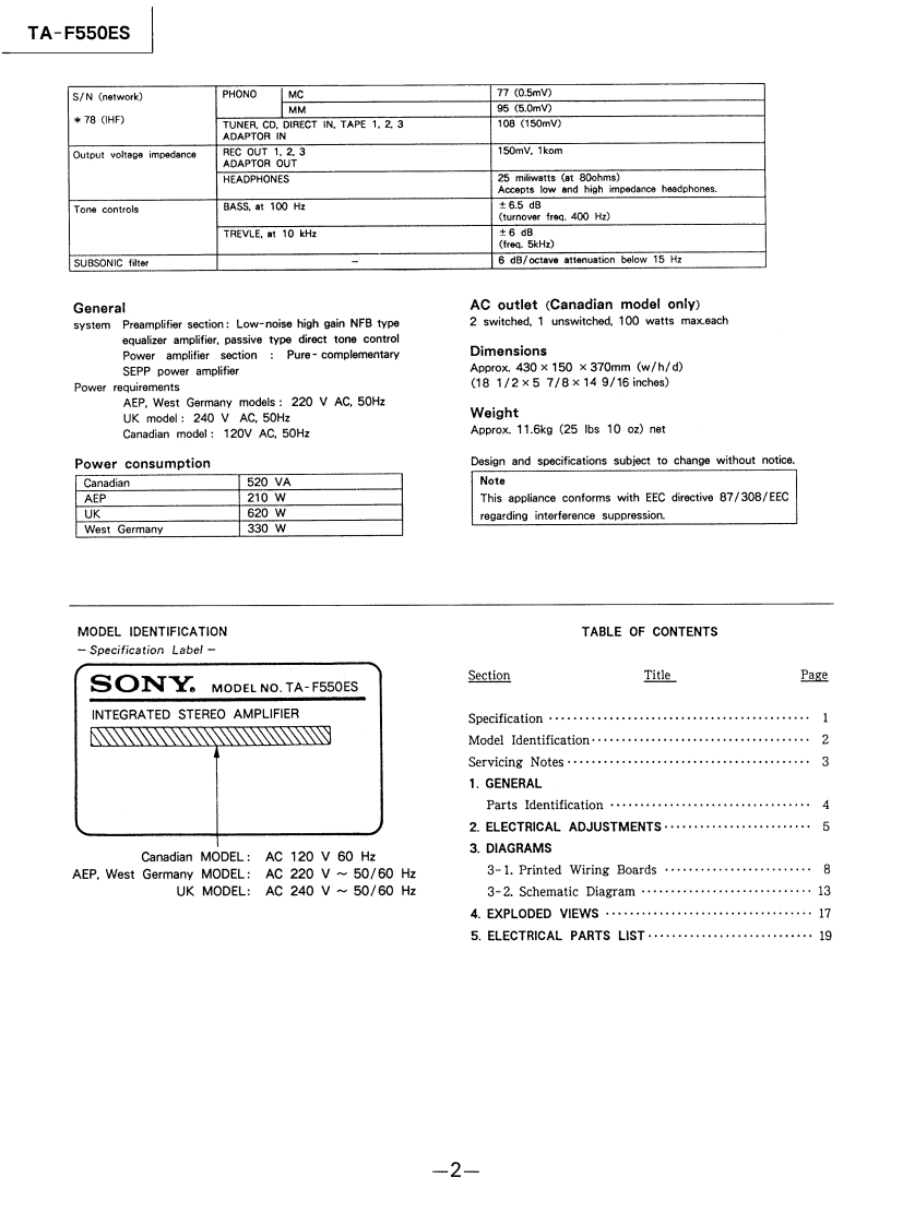 TAF550正SSERVICE MANUALCanadian ModelAEP ModelUK ModelSPECIFICATIONSAmplifier sectionItemConditionDataContinuous RMS power4 ohms.20 Hz-20 kHzEXCEPT AEP model120W+120W(THD0.01%)output (both channels drivernTHD0.008%(DN:175W+175W0simultaneously)6 ohms.20 Hz-20 kHzEXCEPT AEP model100W+100WTHD0.006%(DN:140w+140W0AEP model95W+95W(OIN:120W+120W08 ohms,20 Hz-20 kHzEXCEPT AEP modelTHD0.004%88N士+1i5wAEP model80W+80w(DIN:100w+100W0Power band width (IHF)8 ohms.THD 0.02%10 Hz 10 kHz at 45 WDynamic headroom ('78 IHF)4ohms2dB8ohms1.2d8Total harmonic distortion8 ohms,at 10 watt output0.003%intermodulation (IM)distortion 4 ohm.at rated output0.008%60Hz:7kHz=4:16 ohm.at rated output0.006%8 ohm.at rated output0.004%Danping factor8 ohms,1 kHz100Residual noisenetwork Aless than 90 u VFrequency responsePHONO MMRIAA equalization curve 0.2 dBTUNER.CD.TAPE 1.2.3.DIRECT IN2Hz·200HzInput sensitivityPHONOMC0.17mV.100 ohms.MM2.5 mV.50 kohmsTUNER.CD.DIRECT IN.TAPE 1.2.3150 mV.20kohmsADAPTOR IN-Continued on page 2-INTEGRATED STEREO AMPLIFIERSONY