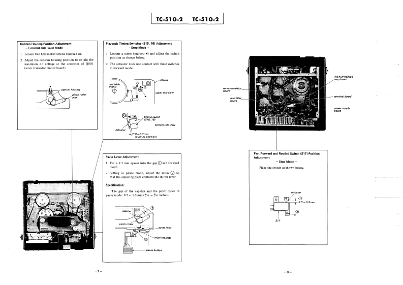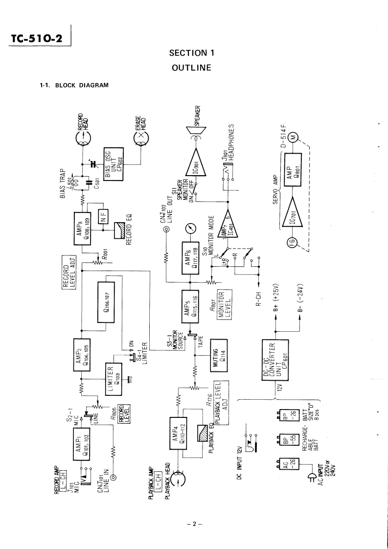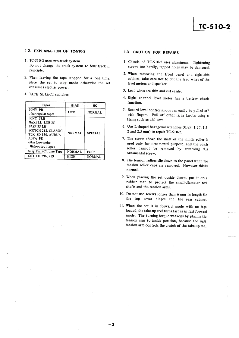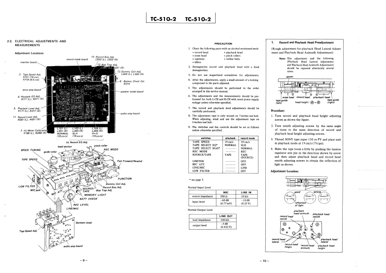 TC-510-2AEP ModelPORTABLESTEREO TAPE DECKSPECIFICATIONSPower Requirements:220 or 240 V ac 50/60 Hz with theFrequency Response:Sony AC Power Adaptor AC-26With Sony Ferri-Chrome Tape30≈27,000Hzat19cm/5(optional)12Vdc30~18,000Hzat9.5cm/sWith SLH tape8 batteries size DSony Rechargeable Battery Pack BP-5530~25,000Hzat19cm/soptional)30~16,000Hzat9.5cm/s12V car or boat battery with theWith regular tape30~20,000Hzat19cm/sSony Car Battery Cord DCC-1293013,000Hzat9.5cm/s(optional)Wow and Flutter:Tape Speed:19 cm/s (7 ips)9.5 cm/s (3%4 ips)t0.8%at 19 cm/st0.12%at9.5cm/sRecording Time:45 mins total at 9.5 cm/s,stereoInputs:MIC....with 275 m tapesensitivity 0.2mV(-72 dB}Fast Winding Time:for low impedance microphcneApprox.2 mins.with 275 m tapeLINE IN.94sensitivity 0.06V(-22dB)Reel:Up to 5 inchesinput impedance 100 k ohmsTrack System:2-track 2-channel stereoOutputs:LINE OUT.·2output levei 0.435(-5dB)Motor:DC servo-controlled motor 1at load impedance 100 k ohnssuitable load impedance monBias Frequency:160 kHzthan 10k ohmsHEADPHONES..Equalization:NAB standardsuitable load impedance 8 ohmsSignalto-noise Ratio:64 dB with Sony Ferri-ChromeDimensions:Tape智R93深1豫a》mmTotal Harmonic Distortion:0.8%including projecting parts andcontrolsSpeaker:44 x 94 mm,1916 x 314 inchesWeight:Approx.6.8 kg,15 lb (with battries)Power Output:500mWSONYSERVICE MANUAL