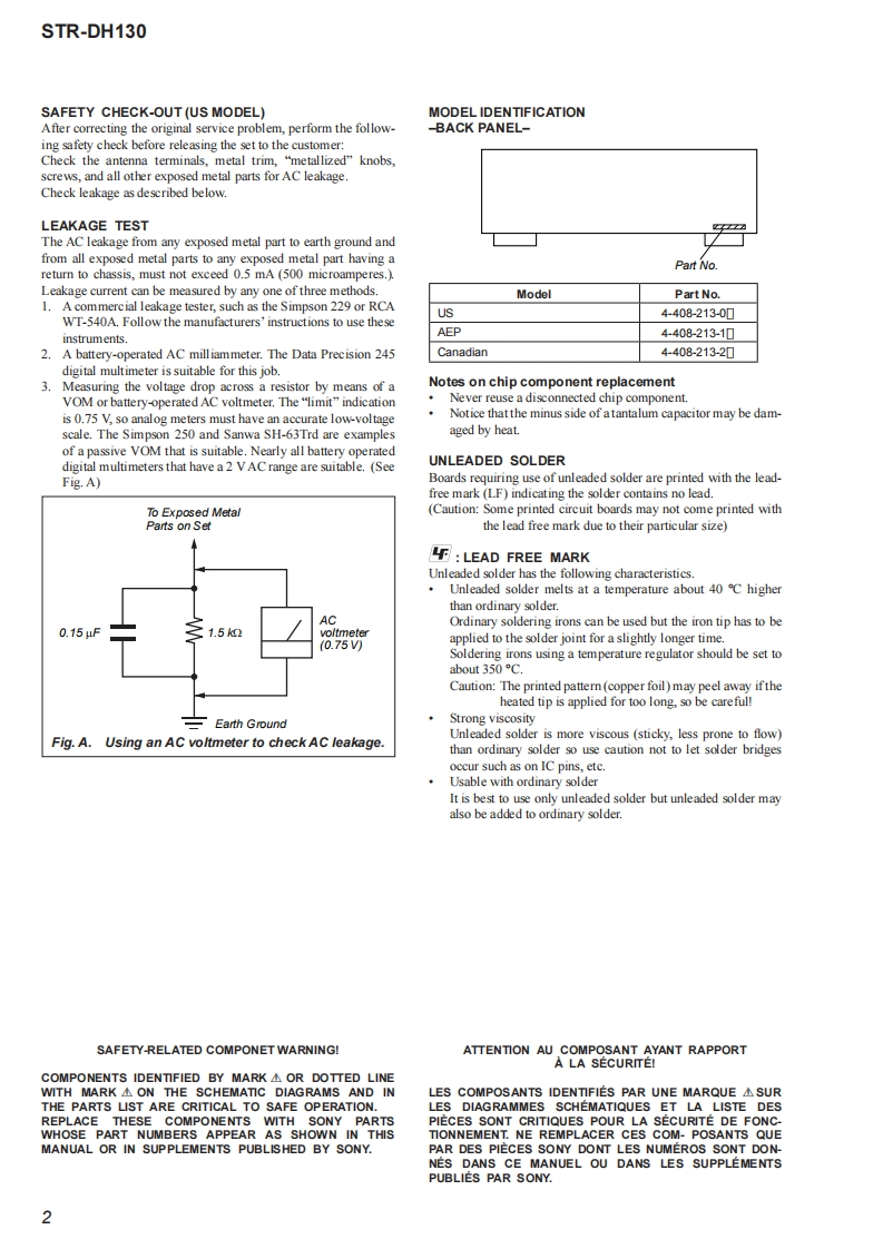 STR-DH130SERVICE MANUALUS ModelCanadian ModelVer.1.02012.01AEP ModelSpecificationsToneAUDIO POWERnSw击BAL0 TREBLE=Gain levelsSupplied accessoriesSPECIFICATIONS0dB).SWeighted network,input level.Operating InstructionsPOWER OUTPUT AND TOTAL·Quick Setup GuideHARMONIC DISTORTION:FM tuner sectionFM wire antenna (aerial)(1)(US model only)luning range87.5MHz-108.0HzWith 8 ohm loads,both channels driven,fromAntenna(aerial)FM wire antenna (aerial)e20-20,000 Hz;rated 90 watts per channelAntenna (aerial)terminalsminimum RMS power,with no more than 0.09%75 ohms,unbalancedtotal harmonic distortion from 250 milliwatts to.AM loop antenna (acrial)(1)rated output.AM tuner sectionTuning rangeAmplifier sectionAreaTuning scaleUS,Canadian and AEP models10 kHz step9k比sepMinimum RMS Output Power (8 ohms,20 Hz-US,Canadian530 kHz-531 kHz-20kHb,THD0.09%61,710kHz1,710kH2.Remote control (RM-AAUI30)(1)90W+90w531 kHz-Stereo Mode Output Power (8 ohms,I kHz,AEP1,602 kHzTHD 1%)Antenna (acrial)100W+100WLoop antenna (acrial)GeneralMeasured under the following conditions:Power requirements.R6 (size AA)batteries (2)AreaPower requirementsAreaPower requirementsUS,Canadian120VAC,60H2US,Canadian120 VAC,60 HzAEP230VAC,50H2AEP230VAC,5060HzFrequency responsePower consumption 200 WAnalog10 Hz-70 kHzPower consumption (during standby mode)+0.5/-2 dB(with BASS0.3wDesign and specifications are subject to0 dB,TREBLE=0 dB)Dimensions (wh/d)(Approx.)change without notice.Input430mm×132.5mm×Analog (PORTABLE IN)279mm(17in×51/4in×Sensitivity:I V/11 in)including projectingHalogenated flame retardants are not used inolsthe certain printed wiring boards.50 kilohmsS/N4:96dB(A,500mV)Mass (Approx.)InputsAnalog (Except PORTABLE IN)Sensitivity:500 mV/5 kilohmsS/4:96dB(A,500mVOutputsAnalog (AUDIO OUT)Voltage:500 mV/10 kilohmsFM STEREO /FM-AM RECEIVER9-890-596-012012A08-1Sony Corporation©2012.01Published by Sony EMCS(Malaysia)PG TecSONY