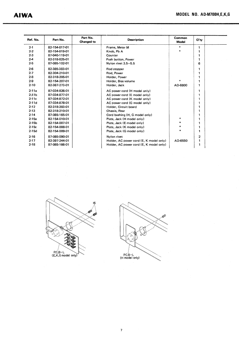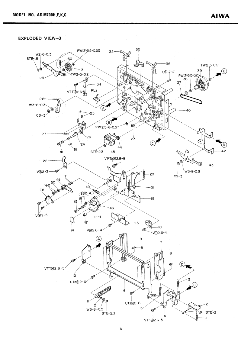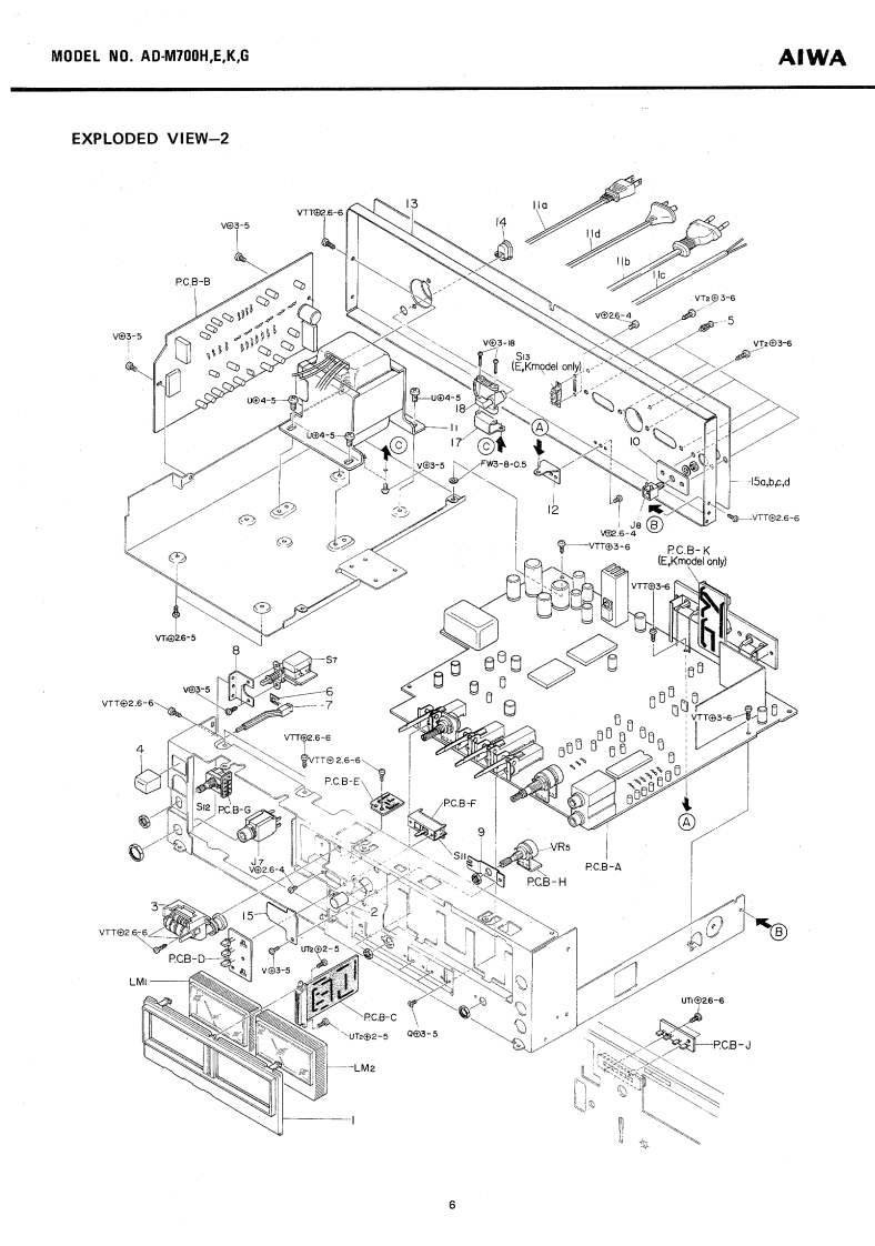 gMSTEREOCASSETTE DECKWITH DOLBY-NR SYSTEMMoDEL No.AD-M700H,E,K,GAIWA(SERVICE MANUAL】Code No.96-770-00052DATE OF ISSUE 10/1979SPECIFICATIONSSemiconductor:VU meter display error:0VU±0.5dB(O VU)(H model only]Bias frequency:105 kHz8 IC's,75 transistors,49 diodesFrequency response:OVU12 LED'sMETAL:30~12.500 Hz(E,K,G model only)30-8.000HzPower source:AC110V/120V/220V/240W-20v元Switchable 50/60 HzMETAL:20~19,000 Hz(H model)20-18,00H2AC110120V220w20-18,0000 HSwitchable 50/60 HzLH:~16.000H3IE model)Bias adjustment range:AC120V240VSwitchable 50/60 Hz±20%LH,Fe-Cr,Cr0,)Motor:DC servomotor【capstan(K,G model)DC motor (reels]Power consumption:20WHead:Recording/PlaybackDimensions:450w)×120(H)×270(D)mmV-cut Combination sendust headWeight:7 kgErasureTrack system:4 track 2 channel stereoDouble gap ferrite headTape speed:4.Bcm/s±1%Recording system:AC biasWow flutter:Less than 0.04%(WRMS)Erase system:AC eraseAutomatic stoo svFull auto stopAutomatic shut-off action time:Input:MIC:Max.input sensitivity0,3mV412mkeuplrigaures(200 S2~10 ks suitablel450±40g4.41±0.39NLINE IN:109gmNmMax.input sensitivity50 mVorque:&rewind time(More than 50 k)(w/-60ca5 sette】DIN:Max.input sensitivityyback output0.58±0.05V(LINE,D1N】0.1mV/k2.7k}TTA-161)Output:LINE OUT:Standard output levelPlayback noise:Less than 1.3 mV(METAL0.41V0VU(Un-Weighted)CrO,,Fe-Cr.DOLBY NR ON)Less than 2.8 mV (LH.DOLBYNR OFF)Rec./Pb output:O VU+1.5 dB (LINE OUT,DIN(400 Hz 0 VU)DIN;OUT)Rec./Pb distortion:than 1.2%(METAL)400Hz0VUOptimum loadLess than(Cr02impedance More thanLess than 1%F日Cr50 kness Inan 1.5%(LH)PHONES:8More than 43/46 dB [METAL,CrO,,Fe-Cr.DOLBY NR OFF/ON)Specifications and external appearance are subject to changeMore than 40/45 dB (LH,DOLBYwithout notice due to product improvemNR OFF/ON]Dolby Noise Reduction System is licensed from DolbyChannel separation:More than 35 dB(1 kHz 0 VU)nd the "Double D"symbol are tradeCross talk:Mor阳than60dBmarks of Dolby Laboratories Incorporated.(1 kHz 0 VU】Erasing ratio:More than 60 dB(METAL 125 HzCrO,,Fe-Cr.LH400Hz,0 VU+10 dB)
