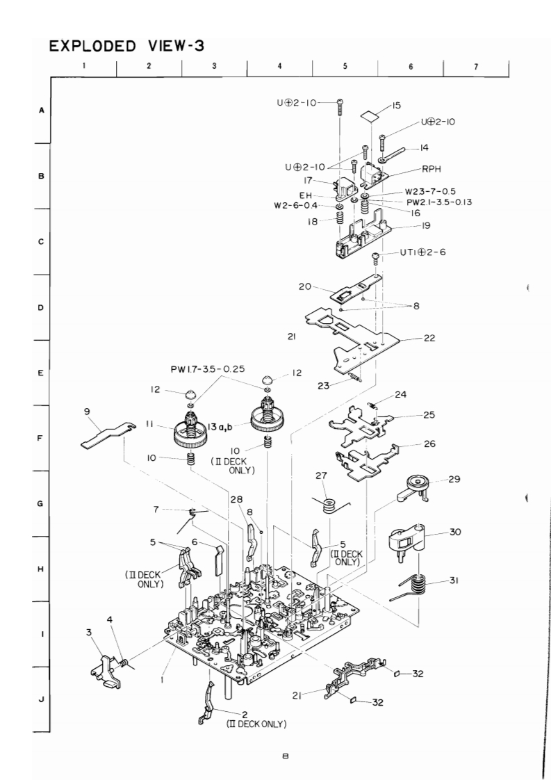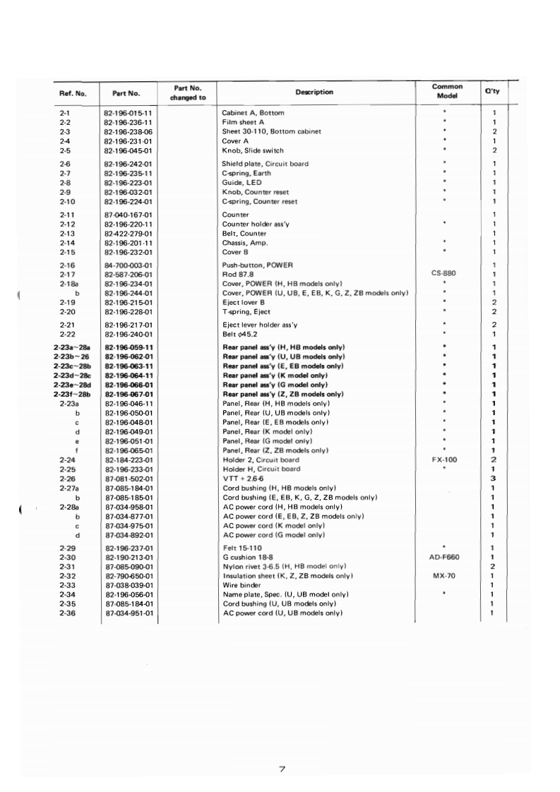 AIWAS/M Code No.83-028DATE OF ISSUE 12/1983SERVICEMANUAL11BA66MODEL NO.STEREO CASSETTEDECKA▣-VX22OTYPE.H,HB,U,UB,E,EB,K,G,Z ZBFollow the instructions carefully,which will allow the user to optimise the products'performanceand give many years of serivce.1.No scratch and melting shall be made to covered lead-wires of an6.General instructions for mechanism repaira.c.primary circuit including mains leads.1)Lubricants been stained the surfaces of transmitting portion2.No illegibility shall be given to the specification plate,the cau-of the belts,idlers,capstan and pinch roller shall be removedtion labels,the fuse labels and others.because slippery and faulty tape travel shall be caused.3.When,on pattern sides of circuit boards,additional repair-parts2)When oiling.only one or two drops shall be applied so ashave been made up,the parts shall be firmly glued to circuitnot to run over and be dispersed.Note should be taken of theboards or other components,unless the parts can be attachedmetal fitting for the capstan and rotating portionsof thefirmly.3)idlers and pinch roller,especially.4.The following matters shall be maintained as they are.whenE-rings and poly slider washers shall be replaced wih newrepairing.ones,if once those have been removed.-No re-utiization1)Soldering of lead-wire endsdue to unreliability.*Care should be taken of the space distance in an a.c.pri4)Regular spare-parts shall always be used for repair,becausemary circuit as well as soldering.using irregular parts and tampering with the products shall2)Wiring and holding of lead wires with wire-clips and binderscause deterioration.mulfunction and damage.3)Materials of lead-wires"e.g.:For UL models,lead-wires to be used shall be approved or accepted by the UL.4)Location of all kinds of insulators5)Setting of voltage selector switch"Set the Voltage Selector Switch to 240V,220V,or 120V,According to your Local Voltage.5.After repaired,the insulation resistance or leakage current shallbe measured with 500 5V D.C and shall be not less than 1MS.Measuring PointConnect to Chasss or Outside of Pn JackRating More than IMQ/500V DCPnca(G》Chassis()AC Power Cord(+】