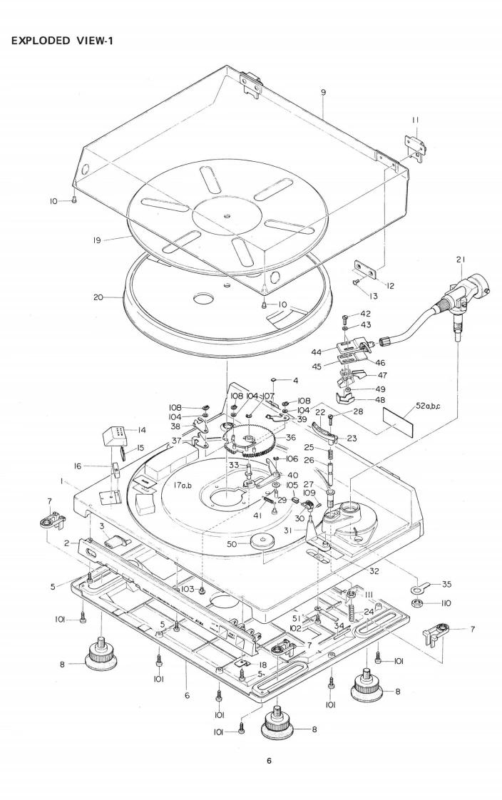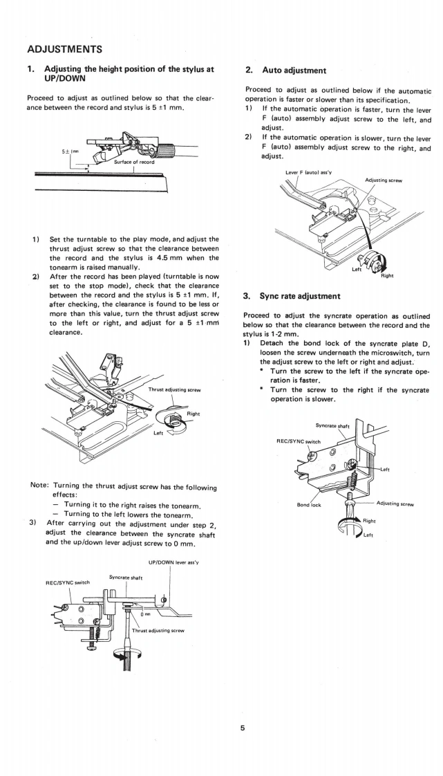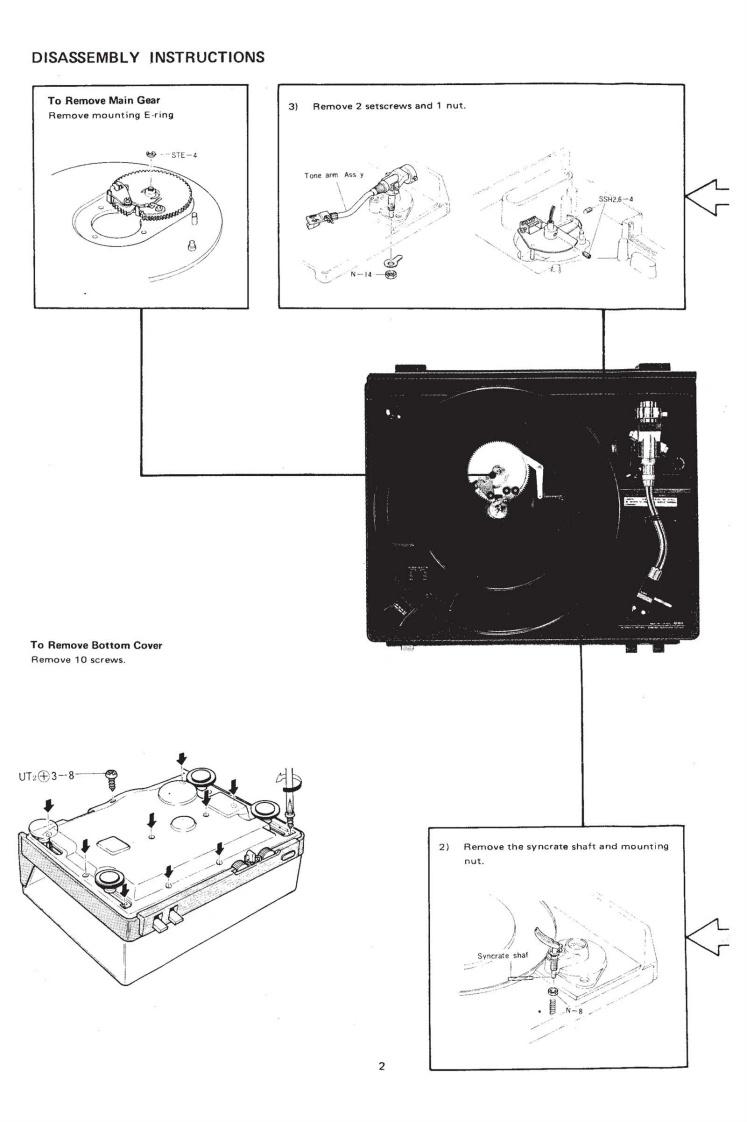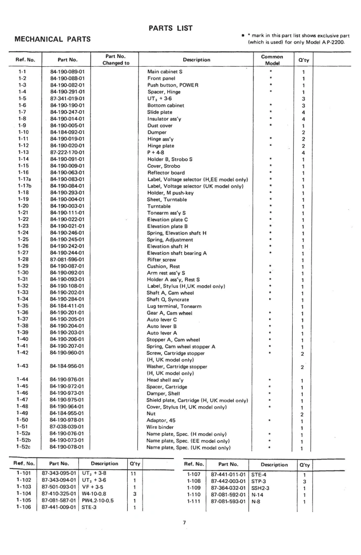 DIRECTDRIVESTEREOTURNTABLE SYSTEMMODEL AP-2200H,EE,UKAIWA(SERVICE MANUAL】soSet using ISO screws出写DATE OF ISSUE 26/10/1977SPECIFICATIONSType:Direct drive stereo turntable systemMaximum acceptable cartridge-headshell weight:Cireuitry:2 ICs,8 transistors,14 diodes21.5 g (including head shell)Power supply:AP-2200 H,EEAC110-120V/220-240V50/60HzCARTRIDGE (H,UK model only)AP-2200UKType:Moving MagnetAC120V/240V50/60HzOutput:3 mV (1 kHz)Power Consumption:6wSeparation20dB(33-1/3r.p.m.1kHz)Dimensions:424w×123H×359DmmStylus:0.5 mill diamondWeight:6,9kgTracking pressure:2 grams (1.7 -2.3 grams allowable)Frequency response:20-20.000HzTURNTABLECompliance:15×10-cm/dyneType:Direct drive typeLoading capacitance:100pFMotor:2-phase,8-pole,slotlessLoad impedance:50k ohmsHall-effect motorRPM:33-1/3.45r.p.m.RPM range:±3%(331/3r.p.m.】Platter:Die-cast aluminum,306 mm diameterS/N ratio:70 dB [DIN B curve)above 60 dB(IEC B curve)Wow/flutter:Less than 0.035%(WRMS)TONEARMType:Static balancedOverhang15 mmTracking error:6.3.+0.8Off-set angle:21.5Stylus pressure range:0-3 g.Specifications and design are subjeet to change withoutAcceptable cartridge weight:3.5-11 gnotice.