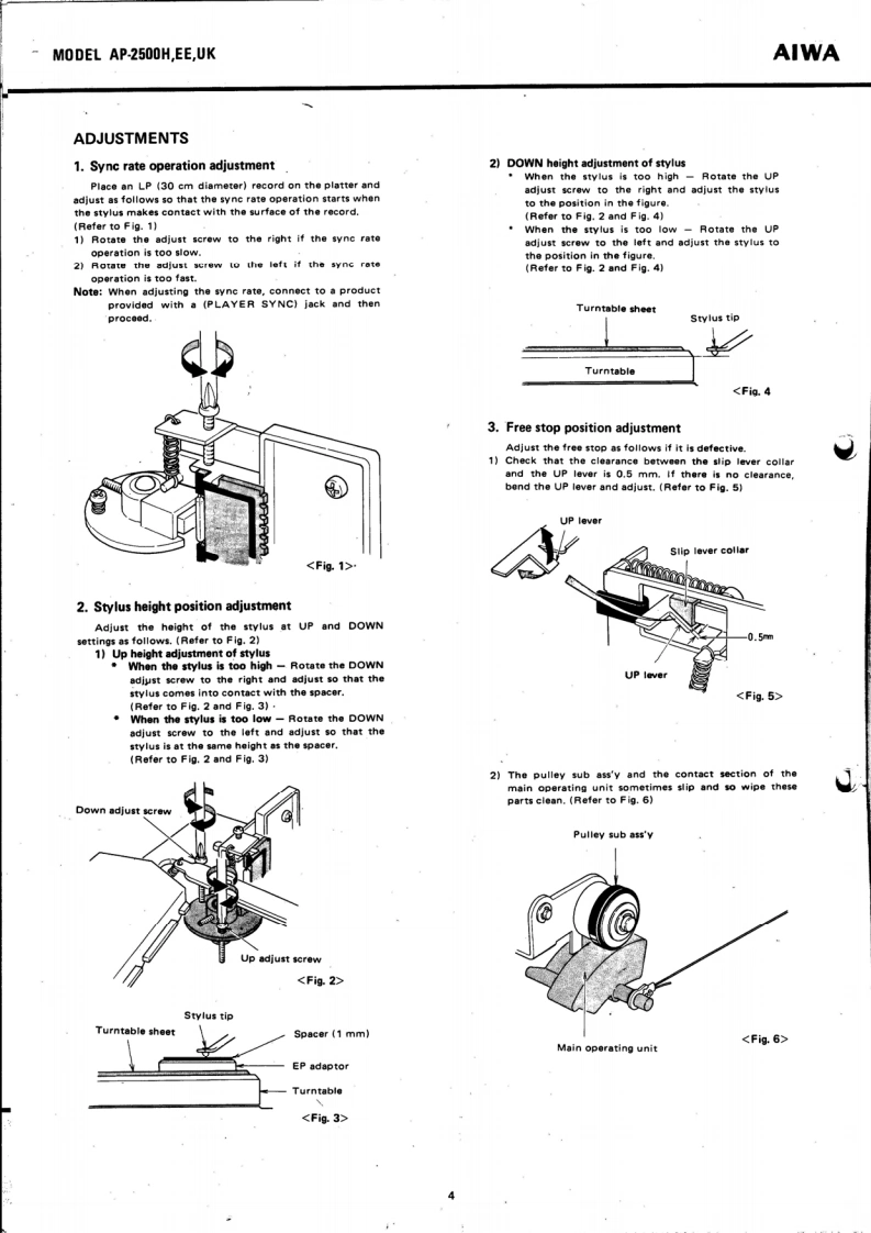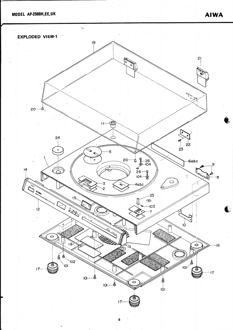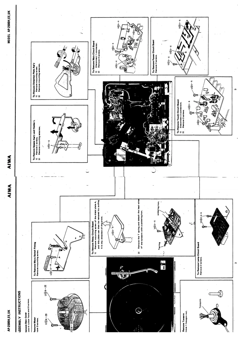 。IRECTSTEREO TURNTABLE SYSTEMMoDEL AP-2500H,EE,UKAIWA(SERVICE MANUAL】isoSet using ISO screwsDATE OF ISSUE 30/11/1977SPECIFICATIONSType:Direct Drive Stereo Turntable SystemTONE ARMCircuitry:Type:Static balancedPower Supply:AP-2500H,EE:Effective length:237mmAC 120 V/220 V (switchable)●Dverhang:50/60Hz15mmAP.2500Ue:Tracking error:+2.1°-1.6AC 120 V/240 V(switchable)Off-set angle:2250/60HzStylus pressurePower Consump-range:0-3 gramsAcceptable cartridgetion:13Wweight:3-14 gramsDimensions:480W×152Hx404Dmm.11 -22 grams (with auxiliary weight)Weight:10.5kgMaximum acceptablecartridge-headshellTURNTABLEweight:32.5 grams (with auxiliary weight)TypeiDireet drive typeMotor:FG Servo 3-phase,8-pole,24-slot DCACCESSORIESHead shellDirect Drive motorRPM:33 1/3 rpm,45 rpm45 rpm adaptorRPM range:4%(45 rpm)Platter:Die-cast aluminum,314 mm diameterS/N ratio:More than 60 dB (IEC B Curve)The specifications and external appearance of this set areWow/flutter:Less than0.03%WRMS】subject to change without prior notice.