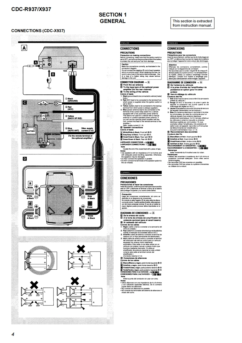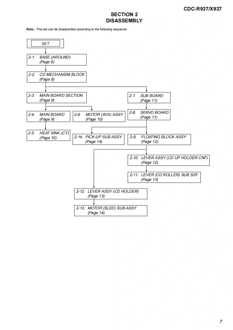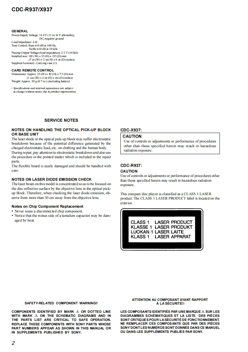 CDC-R937/X937SERVICE MANUALUS ModelCanadian ModelVer1.12004.04CDC-X937AEP ModelUK ModelCDC-R937Photo:CDC-R937The CD section have no adjustment.Model Name Using Similar MechanismNEWCD Drive Mechanism TypeMG-930B-185Optical Pick-up NameOPTIMA-752BSPECIFICATIONSRADIO SECTIONCD SECTION(FM)Frequency Response:17 Hz-20 kHz+0/-3 dBFrequency Range:875 MHz-108 MHzDynamic Range:More than 92 dBIntermediate frequency:10 7 MHz (CDC-R937)Channel Separation:More than 60 dBUsable Sensitivity:127dBfS/N Ratio:More than 90 dB50 dB Quieting Sensitivity:17 2 dBfWow/F lutter:UnmeasurableIF Rejection:100 dBFrequency Response:30 Hz-15,000 HzAUDIO SECTIONS/N Ratio:67 dB (CDC-R937)Max Power Output:45 W x 4 channelsdB(CDC-X937)Stereo Separation:35 dB at 1 kHzAUX IN InputAlternate Channel Selectivity:98 dBInput sensitivity (load impedance)AUX IN:300 mV (10 k)Capture Ratio:3 dB(AM)(CDC-X937)e2s58awo0Continued on next page-(MW)(CDC-R937)Frequency Range:531 kHz-1,602 kHzInter mediate frequency:1071MHz/450kHzUsable Sensitivity:30uV (30 dB)(LW)(CDC-R937)Frequency Range:144 KHz-288 KHz (step)Inter mediate frequency:10 71 MHz/450 kHzUsable Sensitivity:30 uV (30 dB)FM/AM COMPACT DISC PLAYERCDC-X937FM/MW/LW COMPACT DISC PLAYERCDC-R9379-877-344-02Sony Corporation2004D04-1e Vehicle Company©2004.04Published by Sony Engineering Corporation