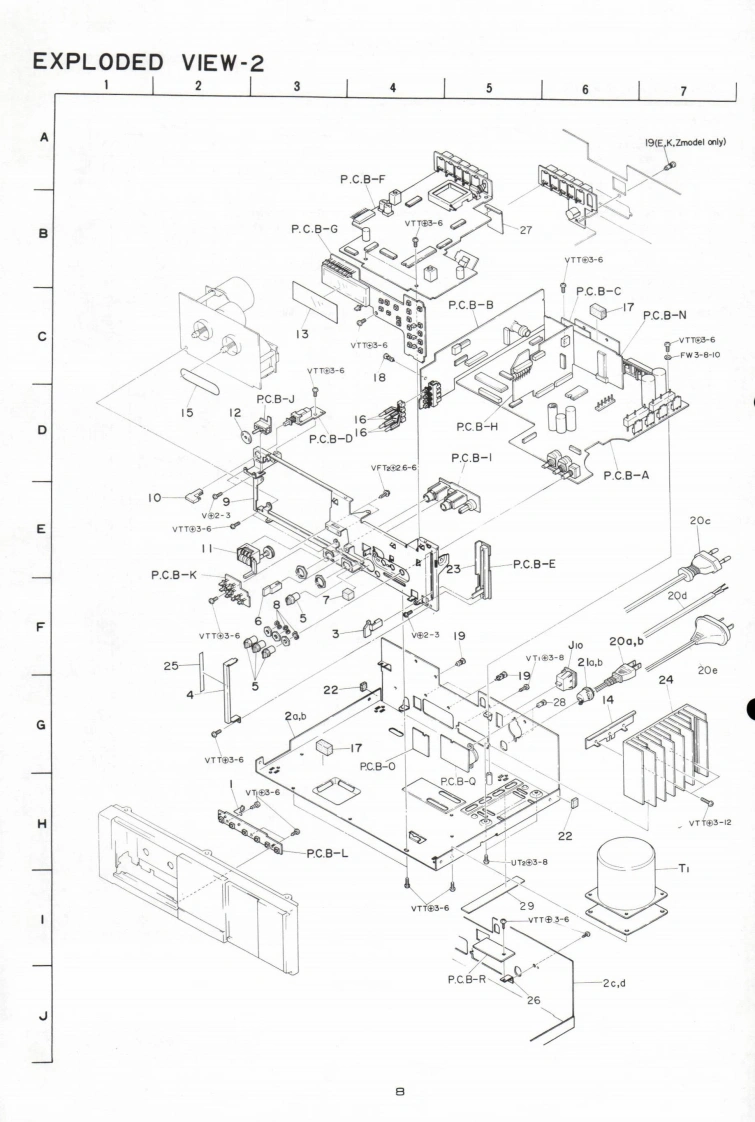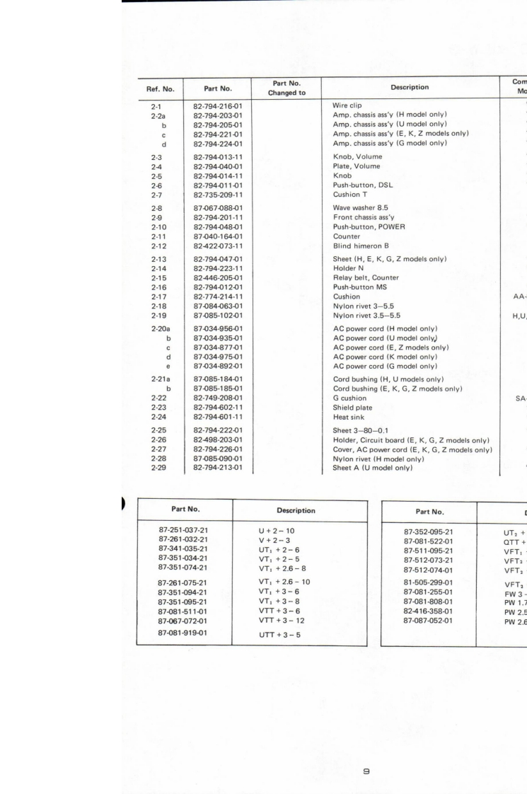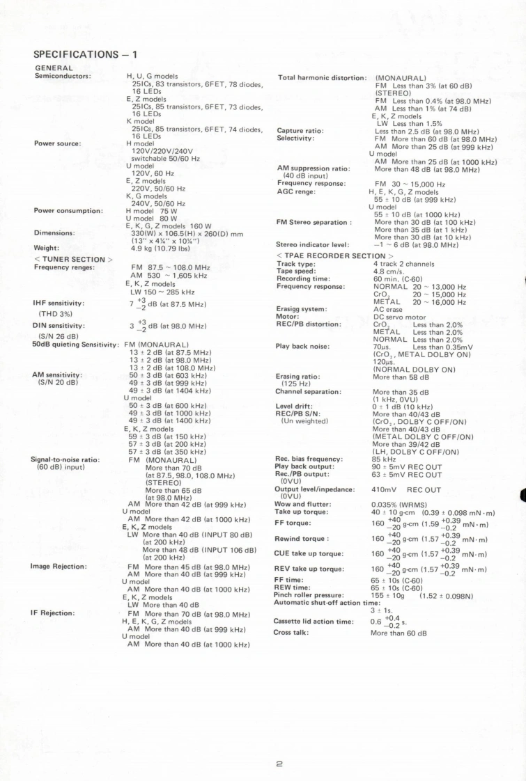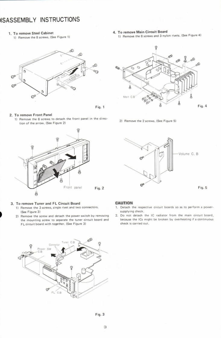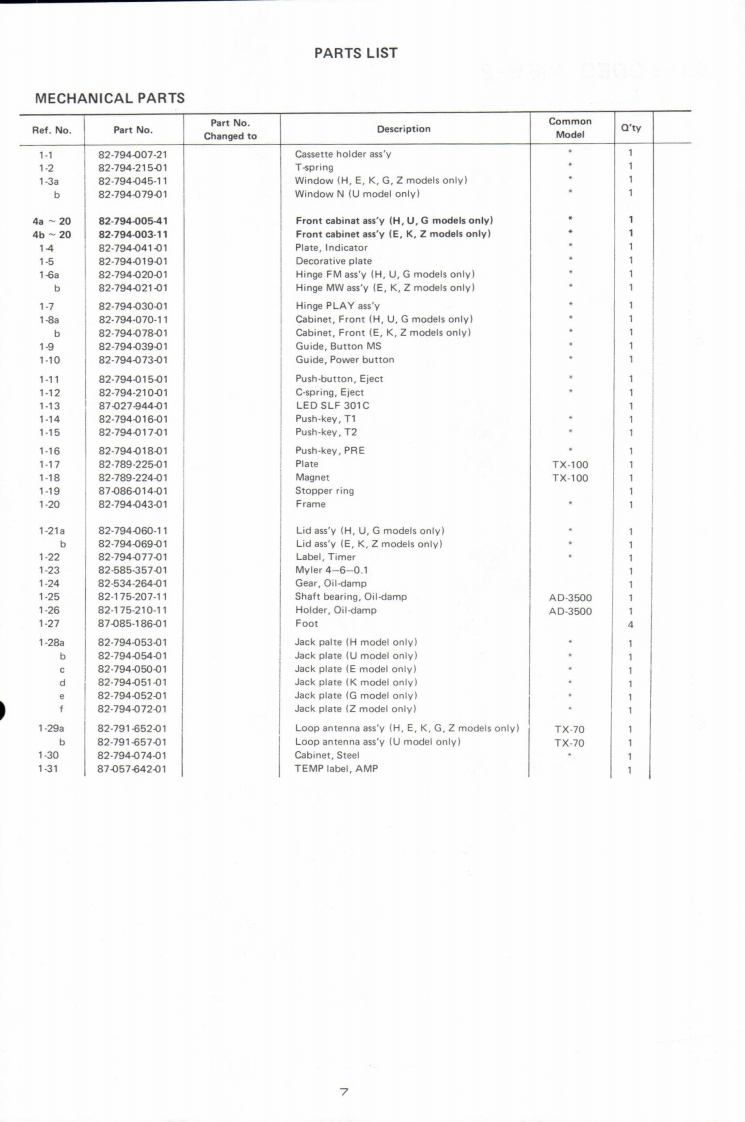 AIWAS/M Code No.83-019DATA OF ISSUE 6/1983SERVICE】MANUALMODEL NO.STEREO CASSETTE RECEIVERGX-6▣·8B5TYPE.H,U,E,K,G,ZFollow the instructions carefully,which will allow the user to optimise the products'performanceand give many years of serivce.1.No scratch and melting shall be made to covered lead-wires of an 6.General instructions for mechanism repaira.c.primary circuit including mains leads1)The heads,capstan and pinch roller shall be cleaned of good2.No illegibility shall be given to the specification plate,the cau-quality alcohol after repaired,because dirty heads shall causetion labels,the fuse labels and others.distorted sounds while dirty capstan and pinch roller shall3.When,on pattern sides of circuit boards,additional repair-partsoccur wow/flutter and take-up fault.have been made up,the parts shall be firmly glued to circuitboards or other components,unless the parts can be attached2)Lubricants been stained the surfaces of transmitting portionof the belts,idlers,capstan and pinch roller shall be removed,firmly.because slippery and faulty tape travel shall be caused.4.The following matters shall be maintained as they are,when3)When oiling.only one or two drops shall be applied so asrepairing.not to run over and be dispersed.Note should be taken of the1)Soldering of lead-wire endsmetal fitting for the capstan and rotating portions of the*Care should be taken of the space distance in an a.c.pri-idlers and pinch roller,especially.mary circuit as well as soldering.4)E-rings and poly slider washers shall be replaced with new2)Wiring and holding of lead wires with wire-clips and bindersones,if once those have been removed.-No re-utilization3)Materials of lead-wiresdue to unreliability."e.g.:For UL models.lead-wires to be used shall be ap.5)Regular spare-parts shall always be used for repair.becauseproved or accepted by the UL.using irregular parts and tampering with the products shall4)Location of all kinds of insulatorscause deterioration,mulfunction and damage.5)Setting of voltage selector switch*Set the Voltage Selector Switch to 240V,220V,or 120V.According to your Local Voltage.5.After repaired,the insulation resistance or leakage current shallbe measured with 500:5V D.C and shall be not less than 1MS.Measuring PointConnect to Chassis or Outside of Pin JackRating More than 1MQ/500V DCPin Jack(白Chassis(e】AC Power Cord(④)