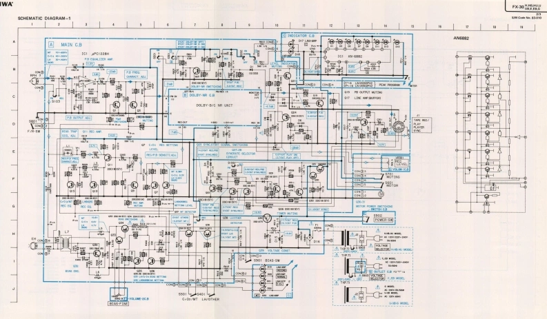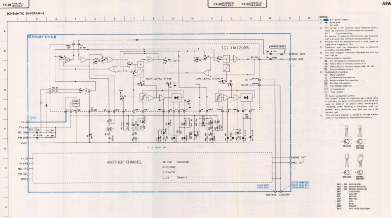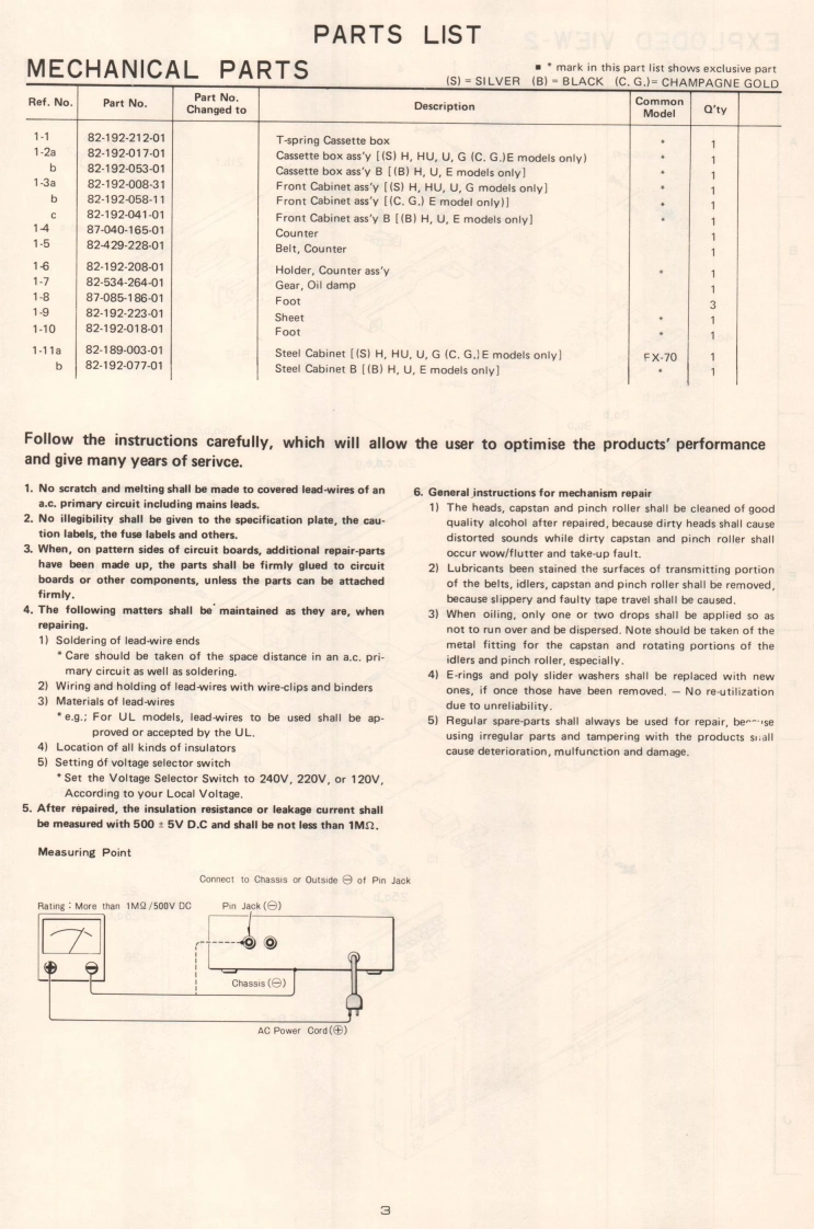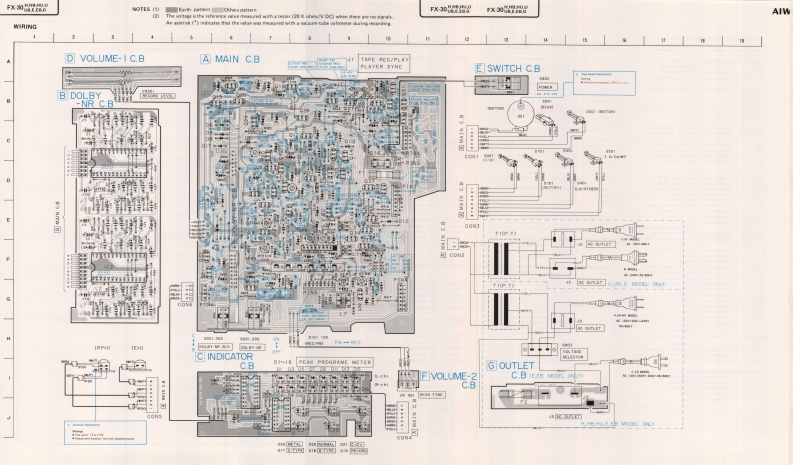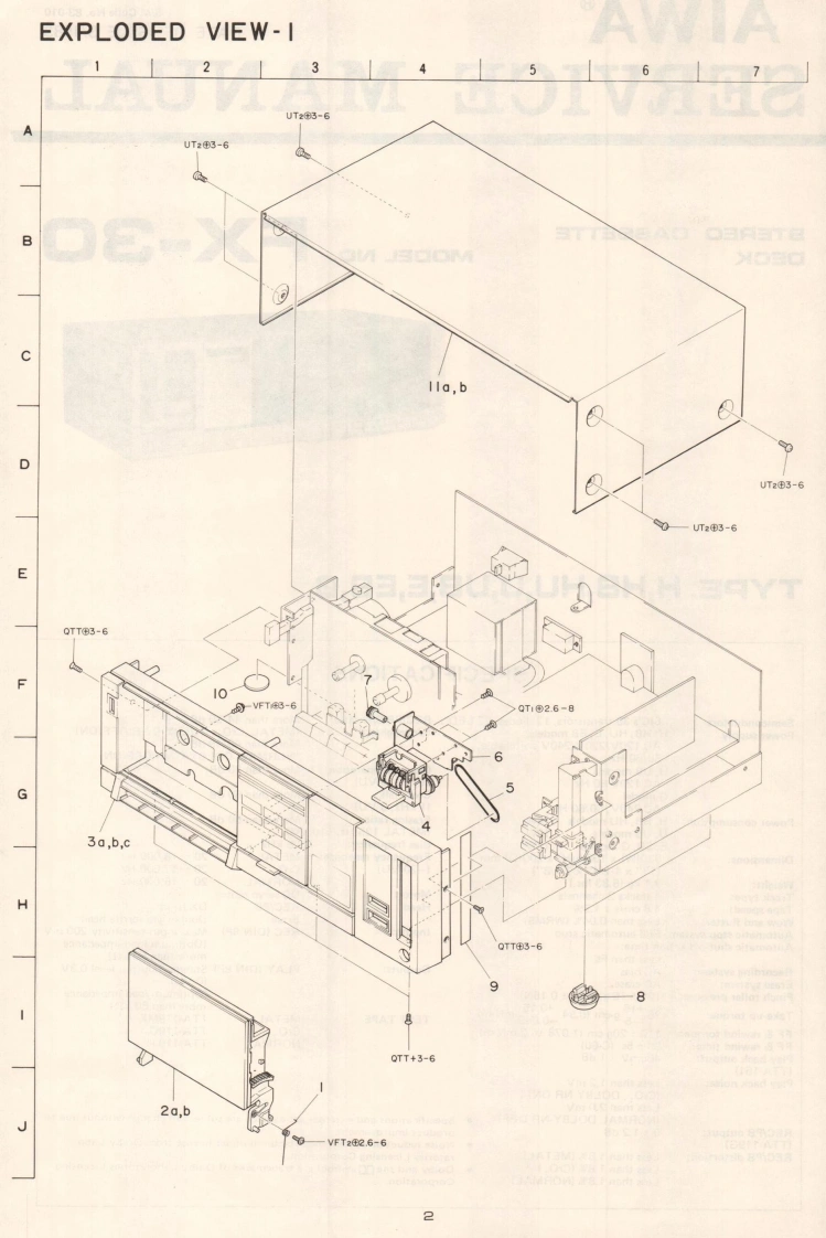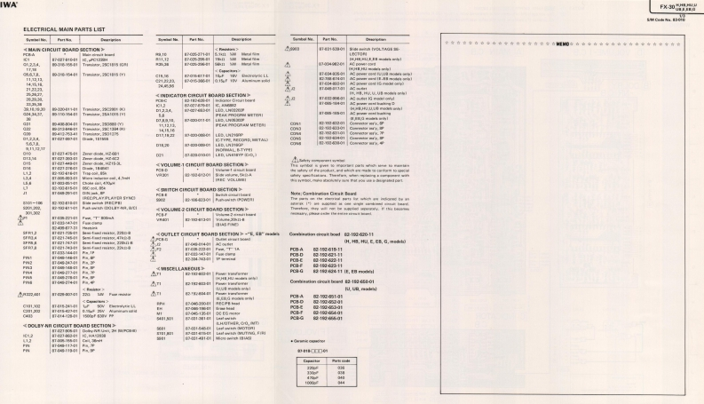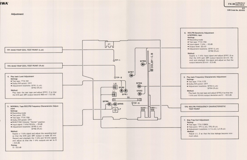 AIWAS/M Code No.83-010DATE OF ISSUE 3/1983SERVICE MANUALSTEREO CASSETTEDECKMODEL NO.FX-3▣TYPE.H,HB,HU,U,UB,E,EB,GSPECIFICATIONSSemiconductors:5IC's 39 transistors,17 diodes,22 LED's REC/PB S/N ratio:More than 44/50 dBPower supply:H,HB,HU,E,EB models(Unweighted)DOLBY-C NR OFF/ON)AC 120V/220V/240V switchable,50/60Hzgga989a928(NORMAL,DOLBY-C NR OFF/ON)U,UB modelsAC 120V 60 HzhnmgaionMore than 30 dBG modelCross talk:More than 60 dBAC240V,50/60Hz(1 kHz,0 VU)Power consumption:H.HB,HU models14WErasing ratio:More than 60 dBU,UB models12W(METAL 125 Hz,+10 VU)E EB G models16WBias frequency:Dimensions:330(W)×106.5H)×200(D)mm85 kHzFrequency response:METAL20~18,000Hz(13”×4-1/4"×7-7/8")(-20 VU)CrO.Weight:20-17,000Hz3.1kg(6831bs.JNORMALTrack type:2016.000Hz4 tracks 2 channelsMotor:Tape speed:48cm/s±15%DC servo motorWow and flutter:Head:REC/PBDX headLess than0.04%WRMS】EraseAutomatic stop system:Full automatic stopDouble gap ferrite headInputs:REC (DIN 8P)Automatic shut-off action time:Max.input sensitivity 200 mVLess than 5s.(Optimum load impedanceRecording system:more than 50 ks)AC hiasOutputs:Erase system:AC erasePLAY (DIN 8P)Standard output level 0.3V(O VU)Pinch roller pressure:125±15g(1.23±0.15N)Take-up torque:0.15(Optimum load impedance3515g-cm (0.mN-m)more than 50 k)TEST TAPE:FF rewind torque:METALTTA-119MX110±20g-cm(1.078±0.2mNmjCrO,FF rewind time:90±5s.C-60)TTA-119GNORMALA-101:460mV±1dBTTA-119JPlay back noise:Less than 1.2 mV(CrO,,DOLBY-NR ON)Less than 2.0 mV(NORMAL DOLBY-NR OFF)REC/PB output:0±12dBSpecifications and external appearance are subject to change without due to(TTA-119G)product improvement.REC/PB distortion:Less than 1.8%(METAL)Noise reduction system manufactured under license from Dolby Laboratories Licensing CorporationLess than 1.8%(CrO,Less than 1.8%(NORMAL)Dolby and thesymbol are trademarks of Dolby Laboratories LicensingCorporation.