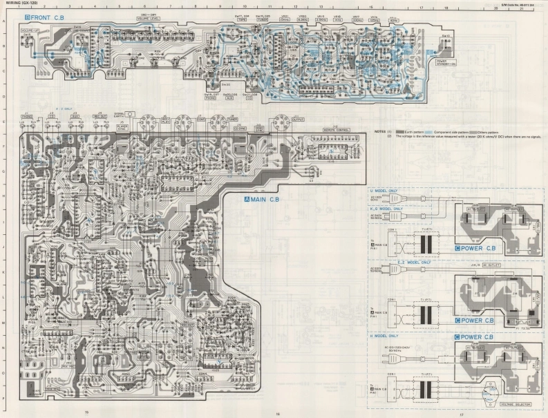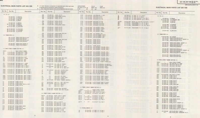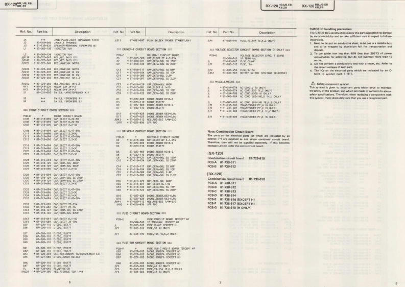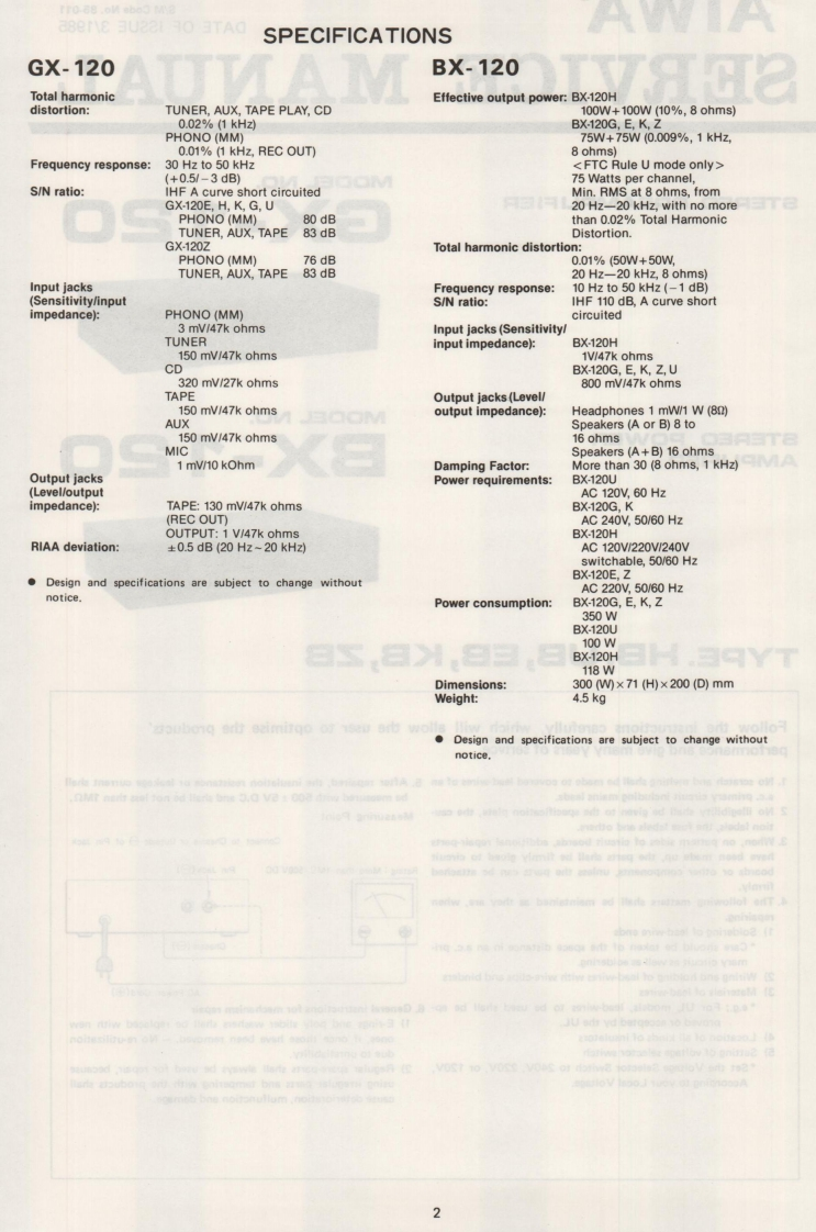 AIWAS/M Code No.85-011DATE OF ISSUE 3/1985SERVICEMANUALMO▣ELNO.STEREO PREAMPLIFIERGX-12▣111000M▣▣ELN▣.STEREO POWERAMPLIFIERBX-12▣TYPE.HB,UB,EB,KB,ZBFollow the instructions carefully,which will allow the user to optimise the products'performance and give many years of serivce.1.No scratch and melting shall be made to covered lead-wires of an 5.After repaired,the insulation resistance or leakage current shalla.c.primary circuit including mains leads.be measured with 500 t 5V D.C and shall be not less than 1MS.2 No illegibility shall be given to the specification plate,the cau-Measuring Pointtion labels,the fuse labels and others.3.When,on pattern sides of circuit boards,additional repair-partsConnect to Chassis or Outside of Pin Jackhave been made up,the parts shall be firmly glued to circuitboards or other components,unless the parts can be attachedRating More than 1MQ/500V DCPin Jack (firmly.4.The following matters shall be maintained as they are,when⊙⊙repairing.1)Soldering of lead-wire ends*Care should be taken of the space distance in an a.c.pri-Chass1s(白)mary circuit as well as soldering.2)Wiring and holding of lead-wires with wire-clips and binders3)Materials of lead-wiresAC Power Cord(⊕】e.g.:For UL models.lead-wires to be used shall be ap-6.General instructions for mechanism repairproved or accepted by the UL.1)E-rings and poly slider washers shall be replaced with new4)Location of all kinds of insulatorsones,if once those have been removed.-No re-utilization5)Setting of voltage selector switchdue to unreliability.*Set the Voltage Selector Switch to 240V,220V,or 120V,2)Regular spare-parts shall always be used for repair,becauseAccording to your Local Voltage.using irregular parts and tampering with the products shallcause deterioration,mulfunction and damage.