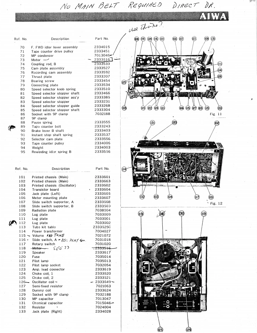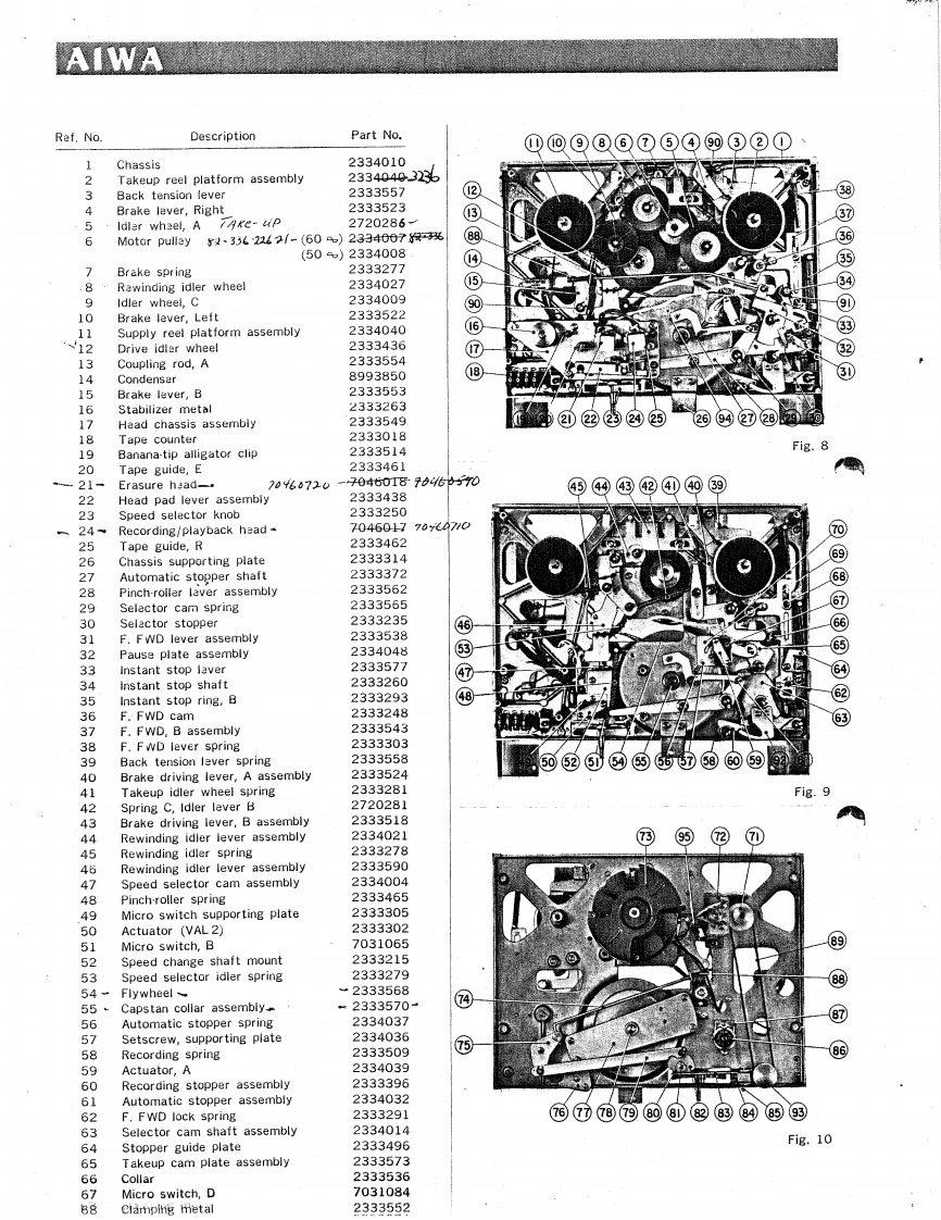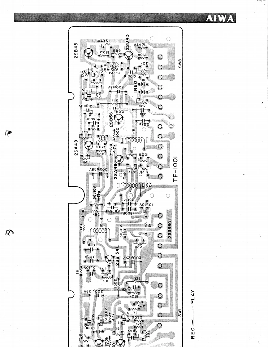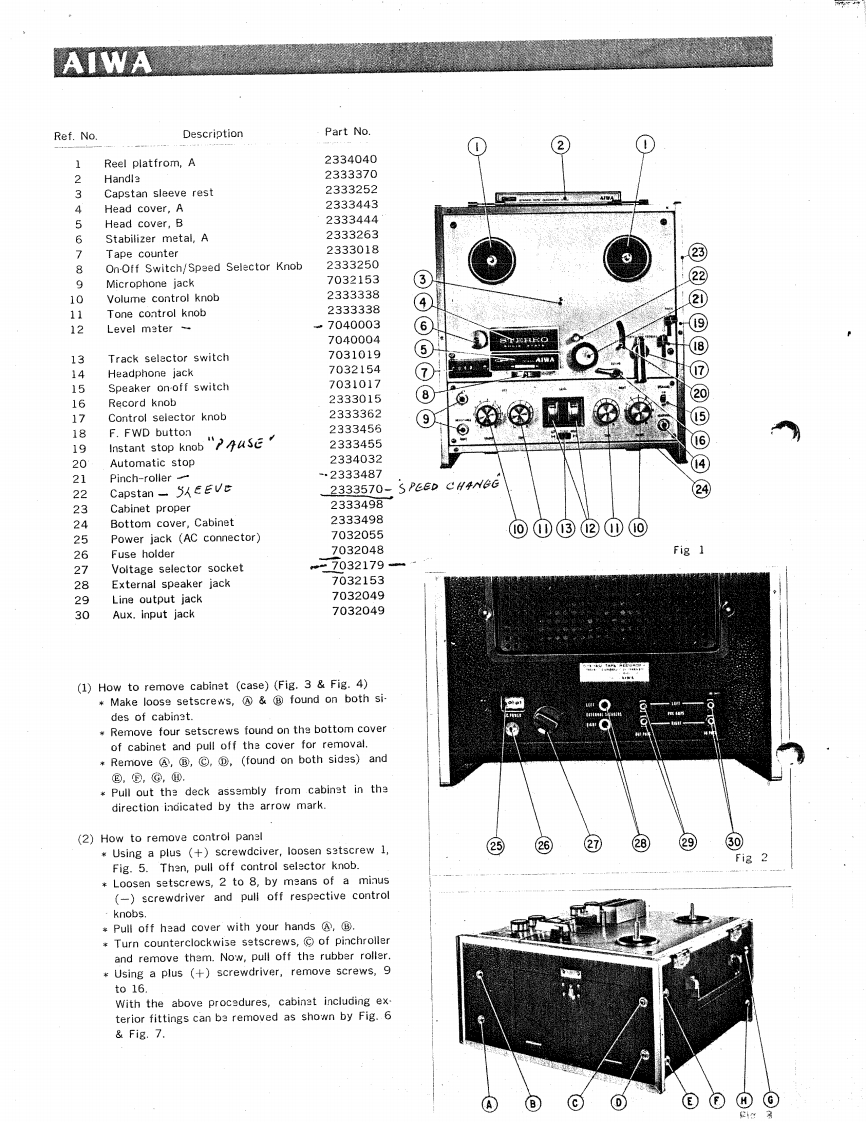 AIWAPARTS4 TRACK STEREOSOLID STATETAPE RECORDER/.·NDDELTP-【SERVICE MANUAL】AIWA CO.,LTD.TOKYO JAPAN健E出9AIWA传SPECIFICATIONType:4-track stereo,3-speed recorderPower consumption:40 VACircuit22 transistors,6 diodes 2 thermistersMotor4-pole hysteresis synchronous motorReel:7*typeRecording level indication:Level Meter x2Tape speed recording time:7-1/2 ips.(19cm/sec)...1 hourBuilt-in speaker8×4*(200X100mm)PM.D speaker(80】3-3/4 ips.(9.5 cm/sec).................-2 hoursX21-7/8 ips.(4.75 cm/sec)............4 hoursDimensions14-5/8m(H)×13-3/8"(w)×10-1/4"(D)(Stereo recording w/7 reel of 50-micron(368×342×257mm】tape,back and forth)Weight33 Ibs.(15kg)Recording system:AC biasMicrophone10 Kn type(2 n-10Ka type'can be used)Erasing system:AC erasureFrequency characteristics:As defined in NAB StandardsACCESSORIESFrequeucy range 7-1/2 ips.(19 cm/sec)......30c/s-18,000c/s3-3/4ips.(9.5cm/sec…30c/s-12,000c/s74 reel w/50-micron tape1-7/8ips.(4.75cm/sec}…30c/5-5,000c/s7*reel,empty2Output10w(Ma×.),5W×2Audio cordDistortion rate:Less than 2%Patch cord22S/N ratio:45 dBMotor pulleyCross talk55dB(1,000c/5)Splicing tapsSeparation:k地oi