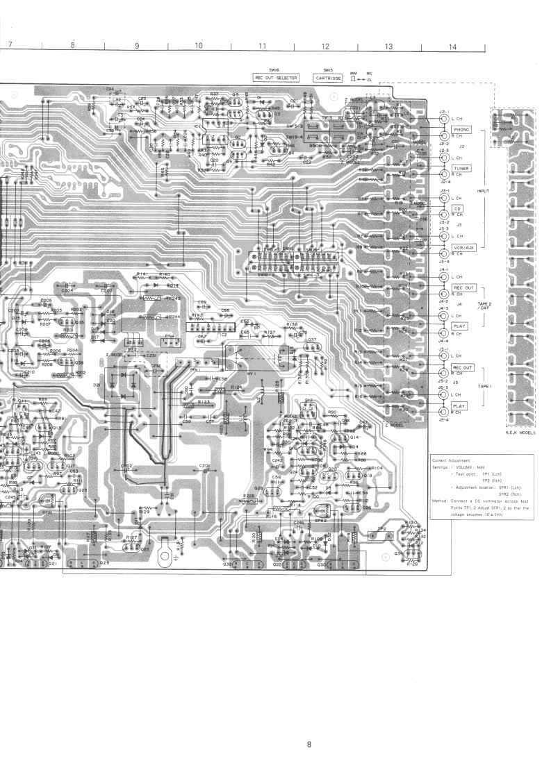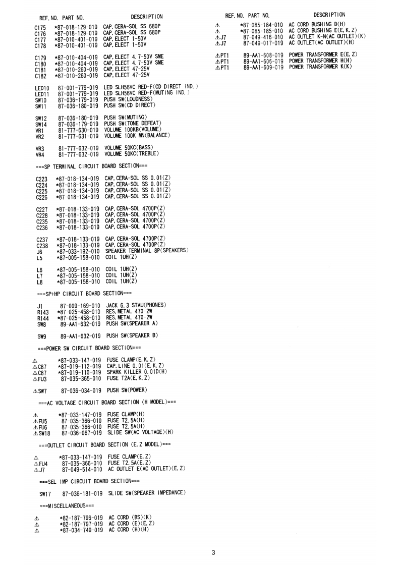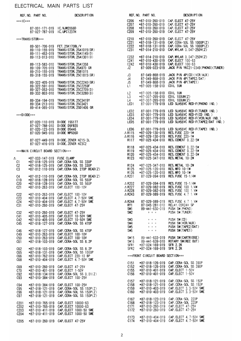 S/M Code No.89-071 DATE OF ISSUE 9/1989-TAIWAXA-007SERVICE0▣MANUALSTEREO INTEGRATED AMPLIFIER·TYPE.H,E,K,ZSPECIFICATIONSCommonPreamplifierPower requlrementsXA-007E,ZS/N ratioIHF A curve short circuited220V,50HzPHONO (MM)XA-007K.94 dB (5 mV INPUT)240V,50HzPHONO (MC)XA-007H75 dB (0.5 mV INPUT)120V/220V240VTUNER,DAT,VCR (AUX),TAPE(switchable),50/60 Hz105dBPower consumptionXA-007E,K.ZInput jacks380W(Sensitivity/input impedance)XA-007HPHONO (MM)125W2.5 mV/47 kohmsPHONO (MC)Power amplifier0.2 mV/100 chmsEffective output power 80 W+80 WTUNER,DAT,VCR (AUX),TAPE(4-8ohm3,T.H.D.0.9%,1kHz150 mV/47 kohmsTotal harmonic distortionCD0.007%150 mV/47 kohms(20 Hz-20 kHz,65 W,8 ohms)PHONO overload level MM 150 mVOutput bandwidth20 Hz-20 kHz[1kHz,THD0.01%】(less than 0.05%)Output JacksBoth channels driven,8 ohms](Level/output impedance)Frequency response5Hz-100kHz(0/-3dB)TAPE 150 mV/47 kohmsHeadphones 8-32 ohmsSpeakers 4-16 ohms(A+B:8-16 ohms)RIAA devlation±0.5dB30Hz-15kHDimensions4300M×140H)×335(D)mmWeight8.4kgDesign and specifications are subject to change withoutnotice.AlWA Co..Ltd.Tokyo JapanPrinted in Japan