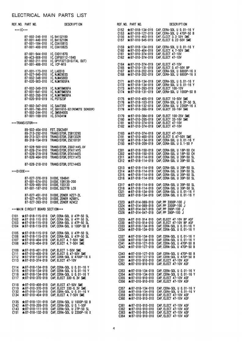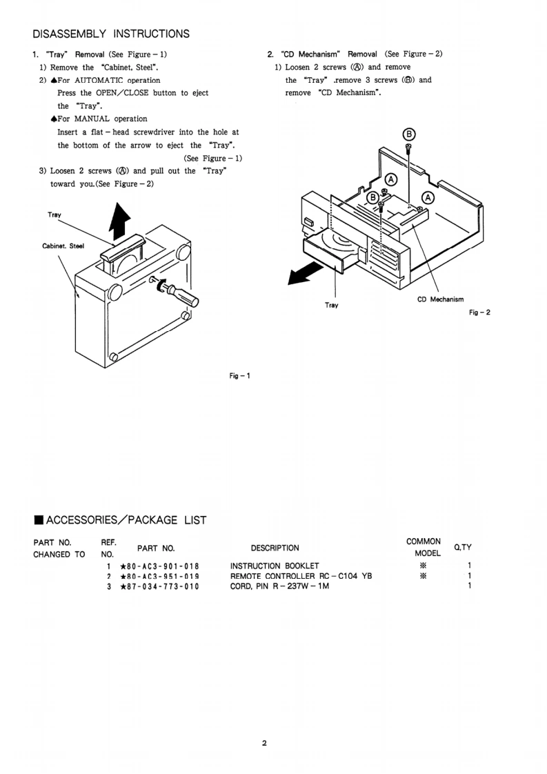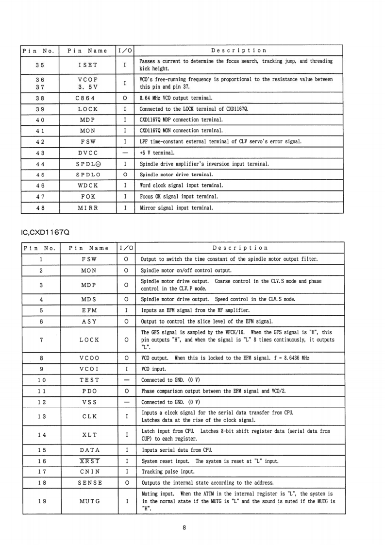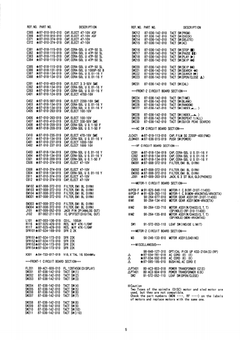 S/M Code No.91-028 DATE OF ISSUE 8/1991-TAWAXC-700SERVIC旺。可口口可口中▣口▣MANUALCOMPACT DISC PLAYERBASIC CD MECHANISM:KSL-210AFM·TYPE.E,KSPECIFICATIONSType:Compact disc digital audio systemDisc:Compact discScanning method:Non contact optical scanner(semiconductor laser applicationLaser:Semiconductor laser-780nm)Rotation speed:Error correction:CodeNo.of channels:2 channelsD-A conversion:1b"Frequency response:4Hz-20kH±0.3dHarmonic distortion:0.003%(1kHzDynamic range:98d日Channel separation:S/N Ratio:100dB(1kHz☑105dB(A)Wow/Flutter:UnmeasurableOutputs:ANALOG OUTPhono jackMaximum output level:2 V(10k ohms)Load impedance:more than10 k ohmsDIGITAL OUT (OPTICAL】Optical output connectorOutput level:-18 3 dBmLight wave length:660 nmPHONESStereo phone jackMaximum output level:4 mW or moreLoad impedance:32 ohmsDesign and specifications are subject to changewi thout notice.AIWA Co.,Ltd.Tokyo JapanPrinted in Japan
