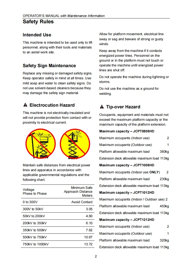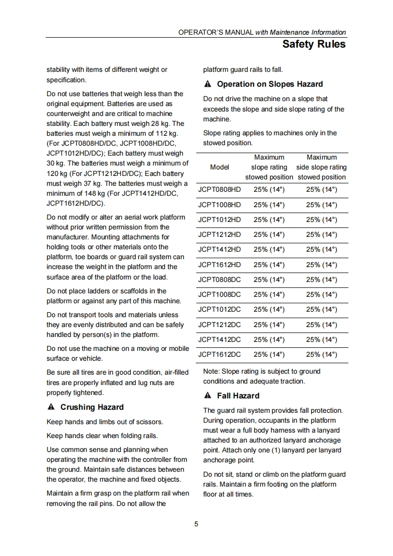SELF-PROPELLED SCISSOR LIFTSOPERATOR'S MANUALwith Maintenance InformationFor JCPT0808HD/JCPT1008HD/JCPT1012HD/JCPT1212HD/JCPT1412HD/JCPT1612HDFor JCPT0808DC/JCPT1008DC/JCPT1012DC/JCPT1212DC/JCPT1412DC/JCPT1612DC)Hydraulic Motor DC Motor DriveJCPT1212 Dingu△四WARNINGTHE MANUFACTURER SHALL NOT BE HELD LIABLE IN CASE OF FAULTSOR ACCIDENTS DUE TO NEGLIGENCE,INCAPACITY,INSTALLATION BYUNQUALIFIED TECHNICIANS AND IMPROPER USE OF THE MACHINEDO NOT OPERATE THIS MACHINE UNTIL YOUREADAND UNDERSTANDALL THE DANGERS,WARNINGS AND CAUTIONS IN THIS MANUALPart Number:SM0110111CEZhejiang Dingli Machinery Co.,Ltd.Seven Edition,January 2017 Printing