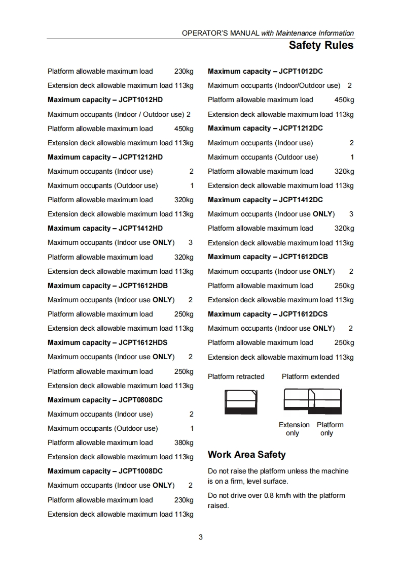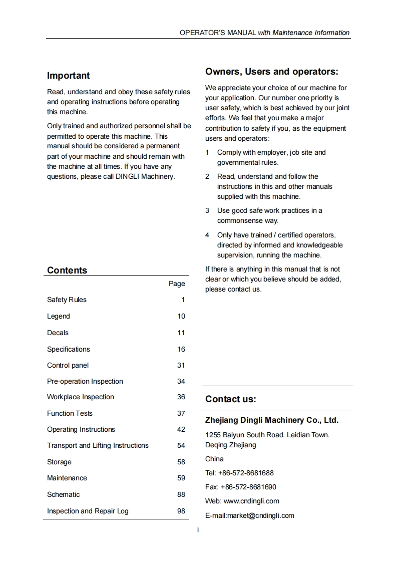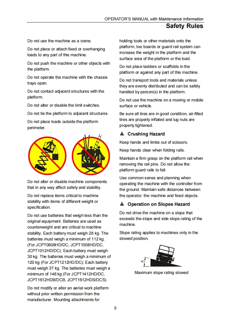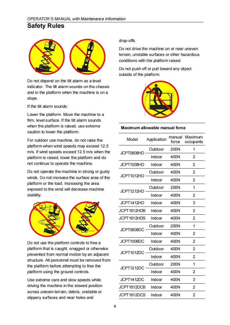 ADVANCEDACCESS PLATFORMSSELF-PROPELLED SCISSOR LIFTSOPERATOR'S MANUALwith Maintenance InformationFor JCPT0808/JCPT1008/JCPT1012/JCPT1212/JCPT1412/JCPT1612B/JCPT1612SHydraulic Motor DC Motor DriveJCPT1212么mWARNINGTHE MANUFACTURER SHALL NOT BE HELD LIABLE INCASE OF FAULTSOR ACCIDENTS DUE TO NEGLIGENCE,INCAPACITY,INSTALLATION BYUNQUALIFIED TECHNIC IANS AND IMPROPER USE OF THE MACHINEDO NOT OPERATE THIS MACHINE UN TIL YOUREAD AND UNDERSTANDALL THE DANGERS,WARNINGS AND CAUTIONS INTHIS MANUALPart Number:SM0110111 Rev9.7CEZhejiang Dingli Machinery Co.,Ltd.Ninth Edition,February 2020 Printing